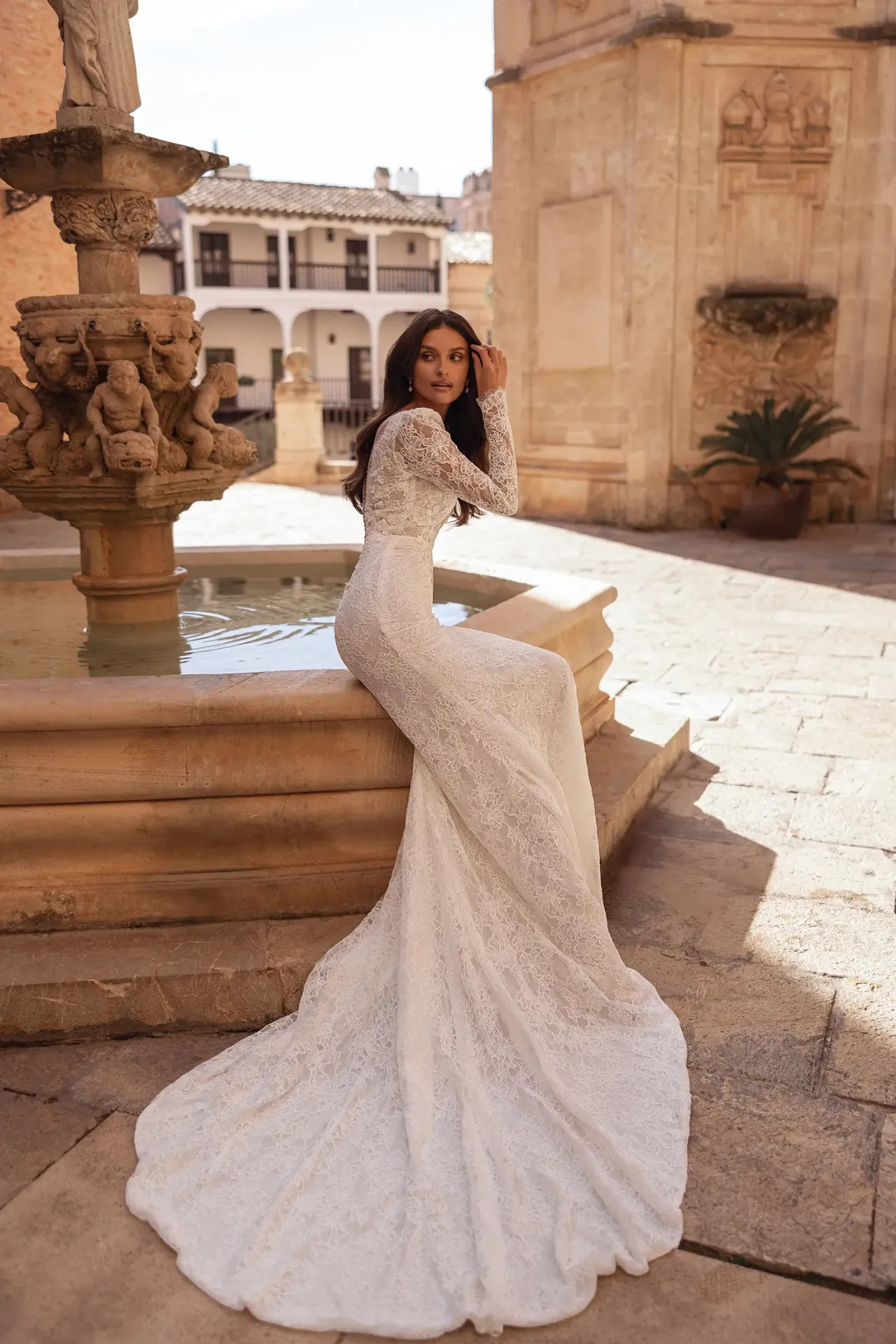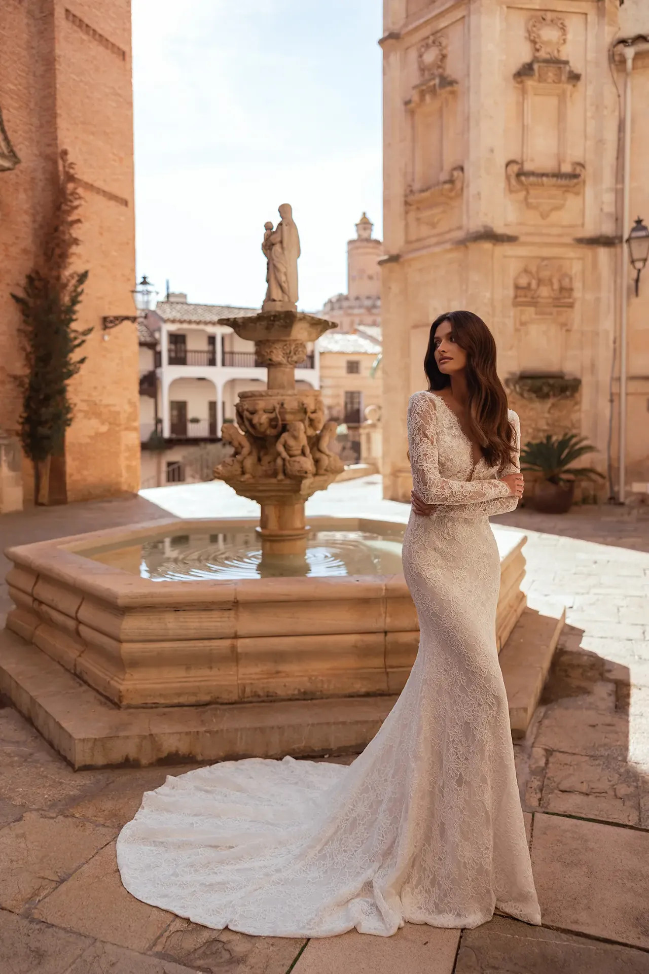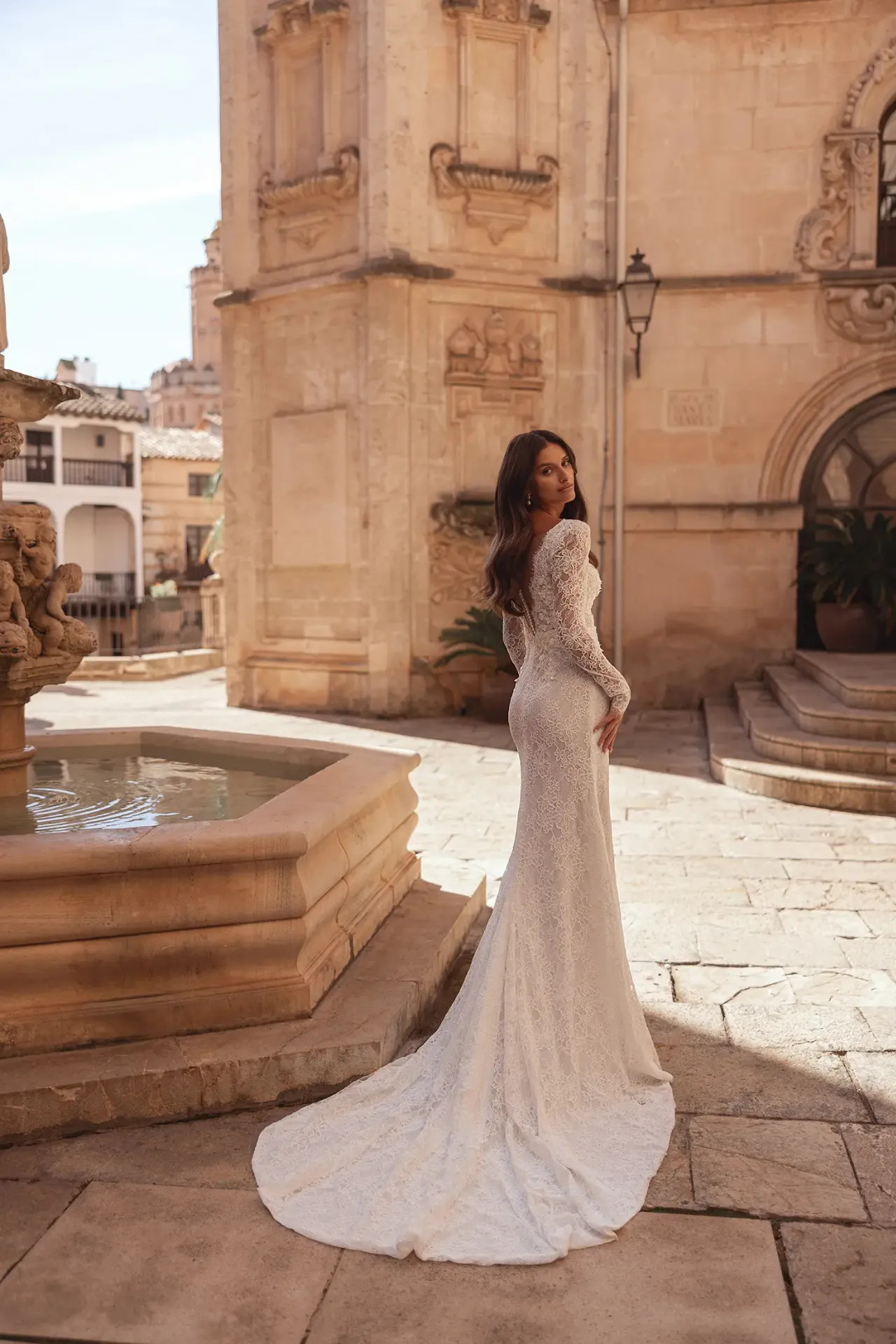 Hangsúlyos sellő fazon: Az Agatha egy precízen megalkotott sellő fazonú menyasszonyi ruha, amely lágyan követi az alakot, majd kecsesen bővül ki egy elnyújtott, finom uszályban.
