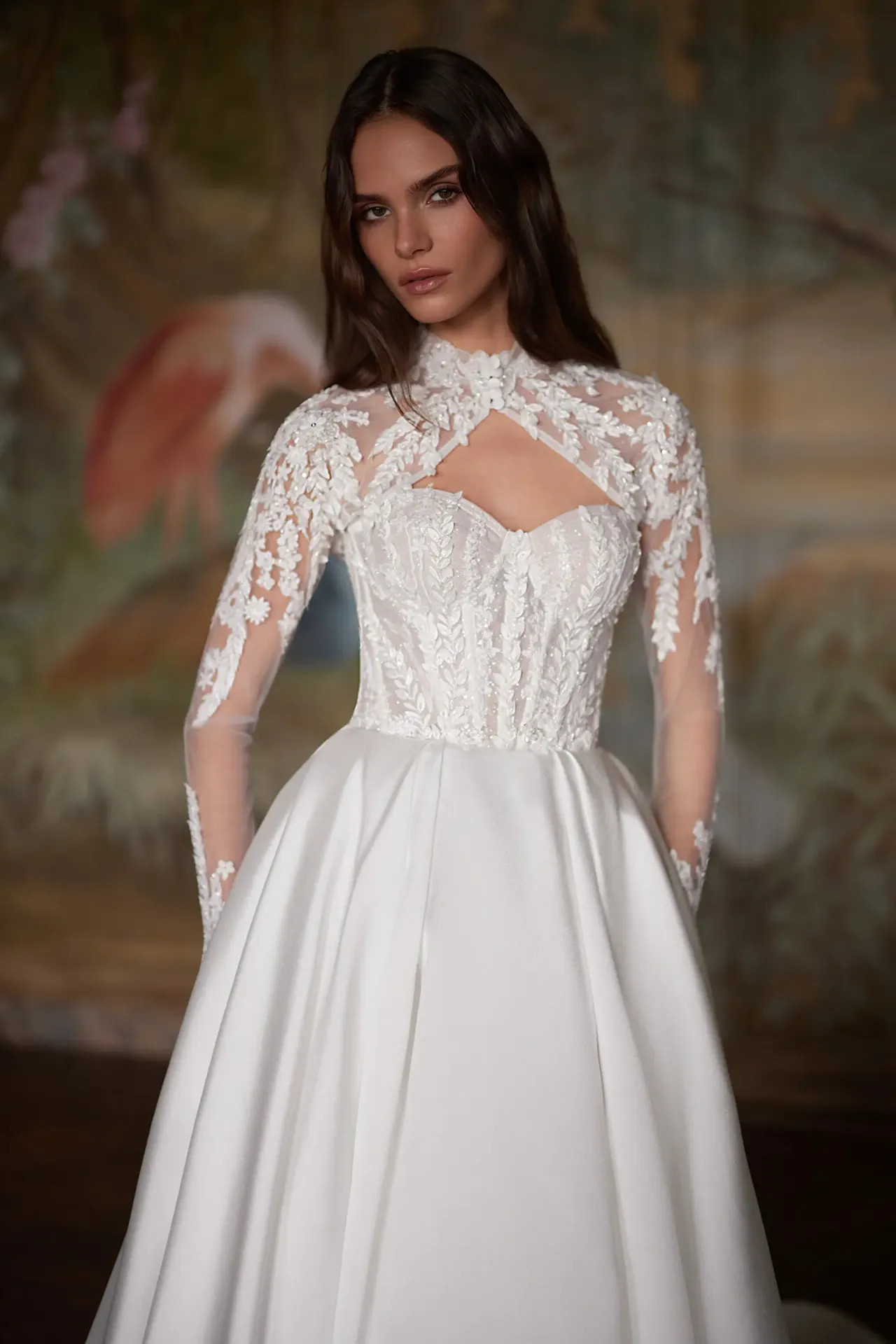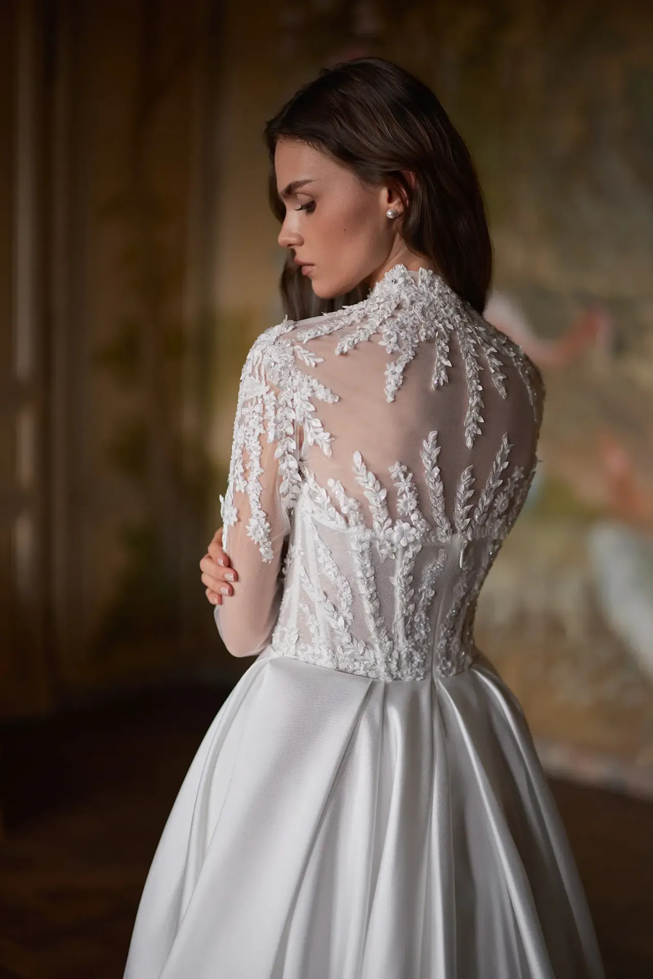 Az Akira ruha azoknak a menyasszonyoknak készült, akik szeretik a kontrasztokat: a mikádó selyem határozott tartását és a csillogó tüll romantikáját. Ez a modell a „couture” szabászat legjavát képviseli, egy olyan sziluettet alkotva, amely egyszerre tekintélyt parancsoló és végtelenül nőies.