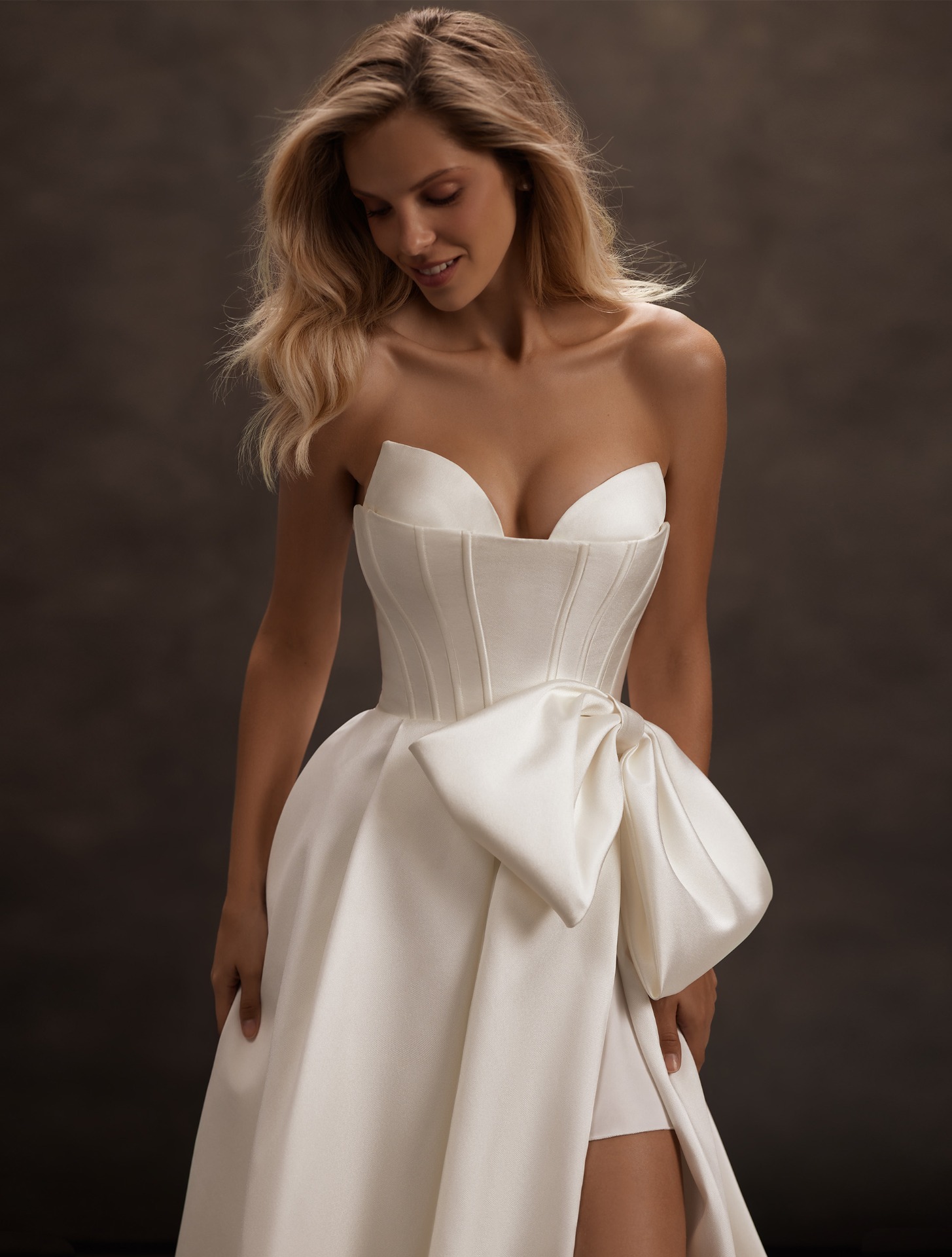 A strukturált, fűzős felsőrész gyönyörűen formálja az alakot, miközben a mély szív alakú dekoltázs nőies finomságot ad a megjelenéshez. A ruha legkülönlegesebb eleme a nagy méretű, aszimmetrikus masni, amely egyedülállóan modern díszítése a letisztult sziluettnek – egyszerre játékos és elegáns.