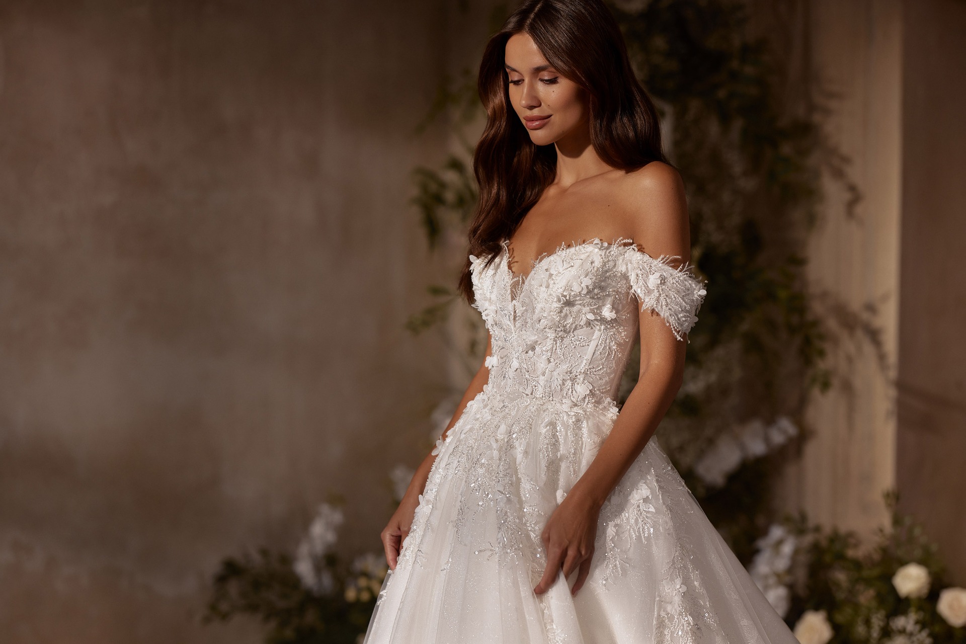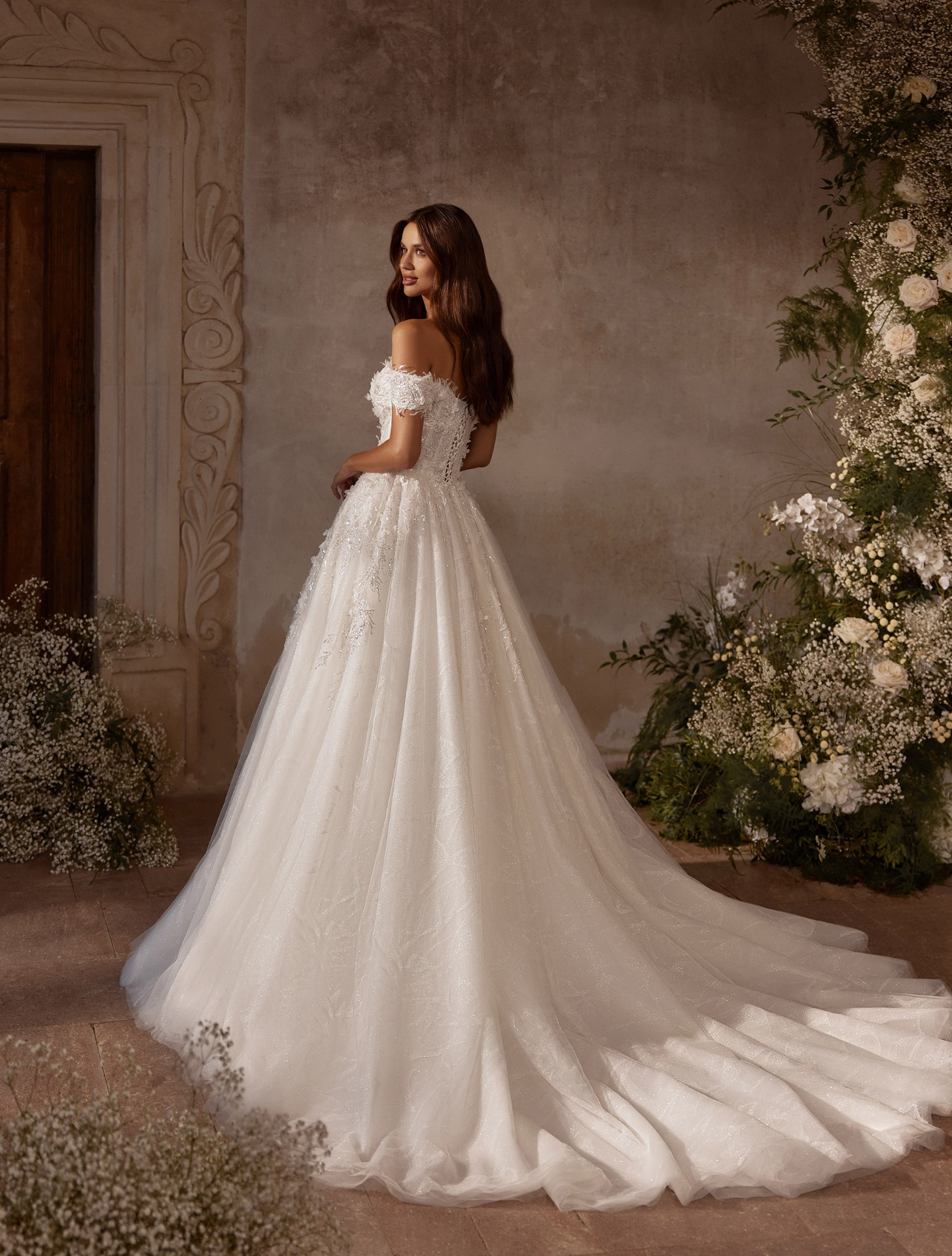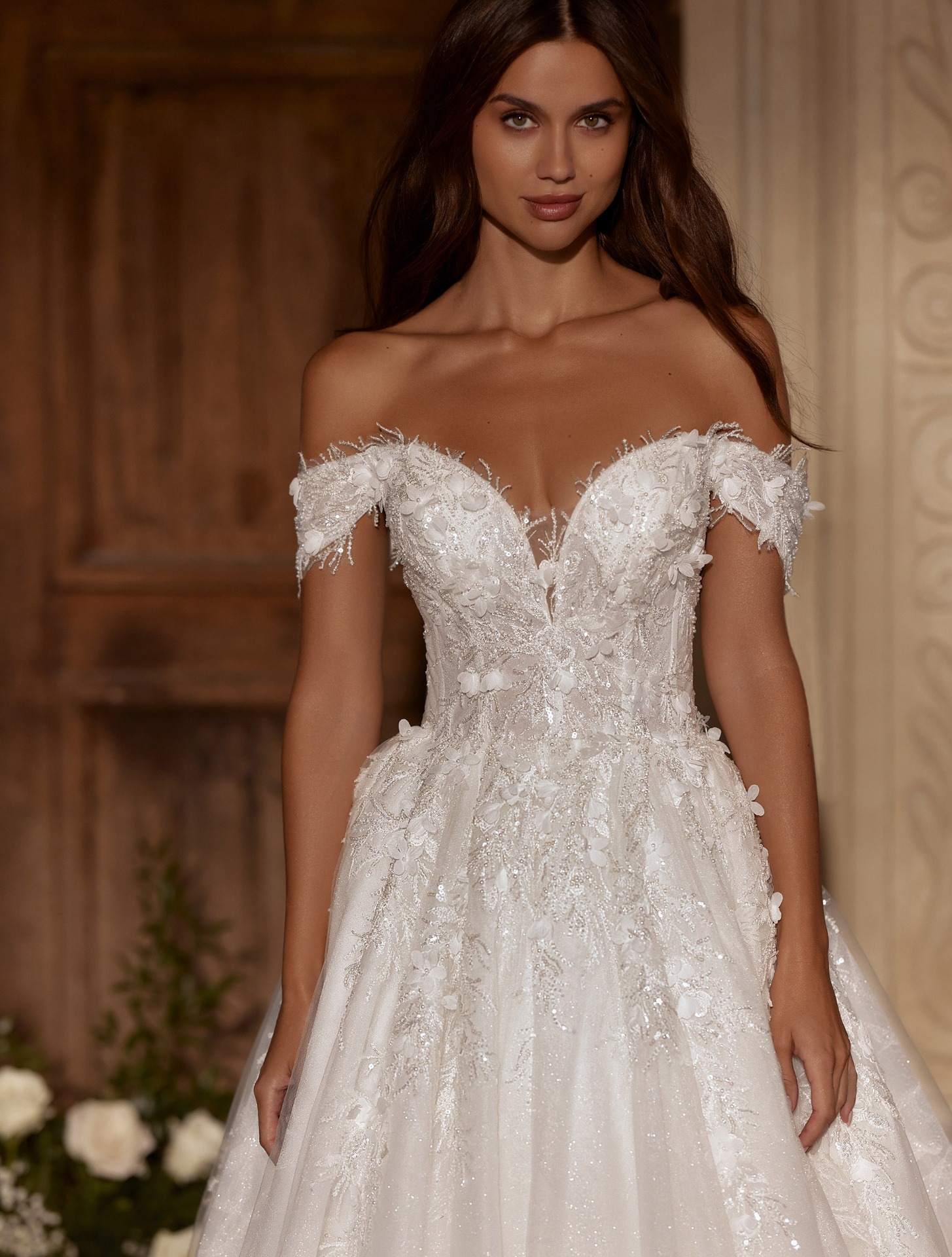 Az Alesia menyasszonyi ruha a romantika és a luxus csodálatos találkozása. A vállról leomló finom csipkerátétek és a 3D virágdíszek gyengéden keretezik a dekoltázst, miközben a gazdagon hímzett anyag és a ragyogó fényjáték minden mozdulatnál életre kel.