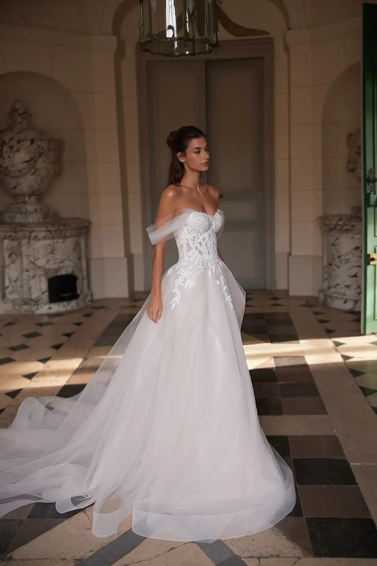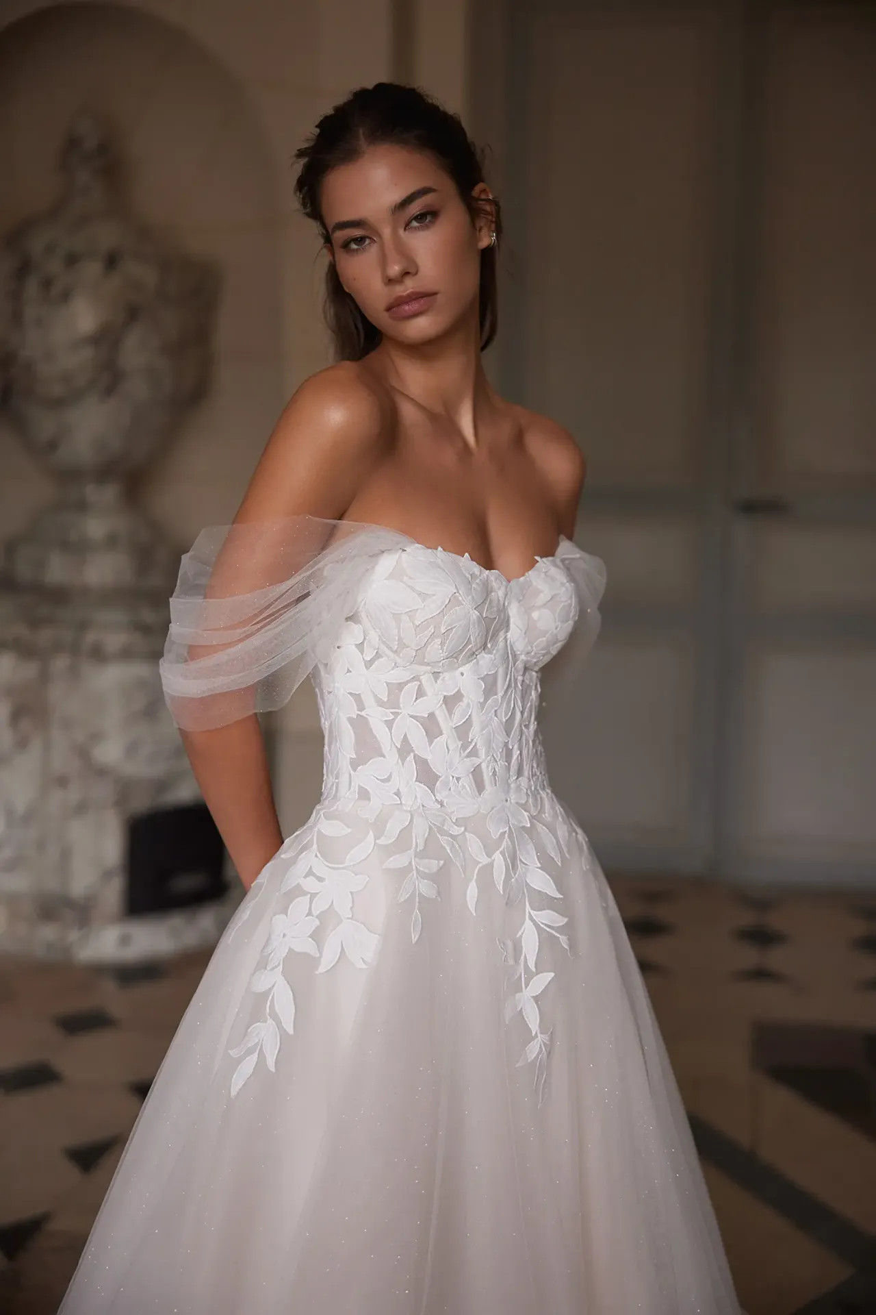 Ejtett vállú romantika: A pihekönnyű tüllpántok lágyan omlanak a válladra, ami még inkább fokozza a ruha súlytalan, romantikus karakterét.