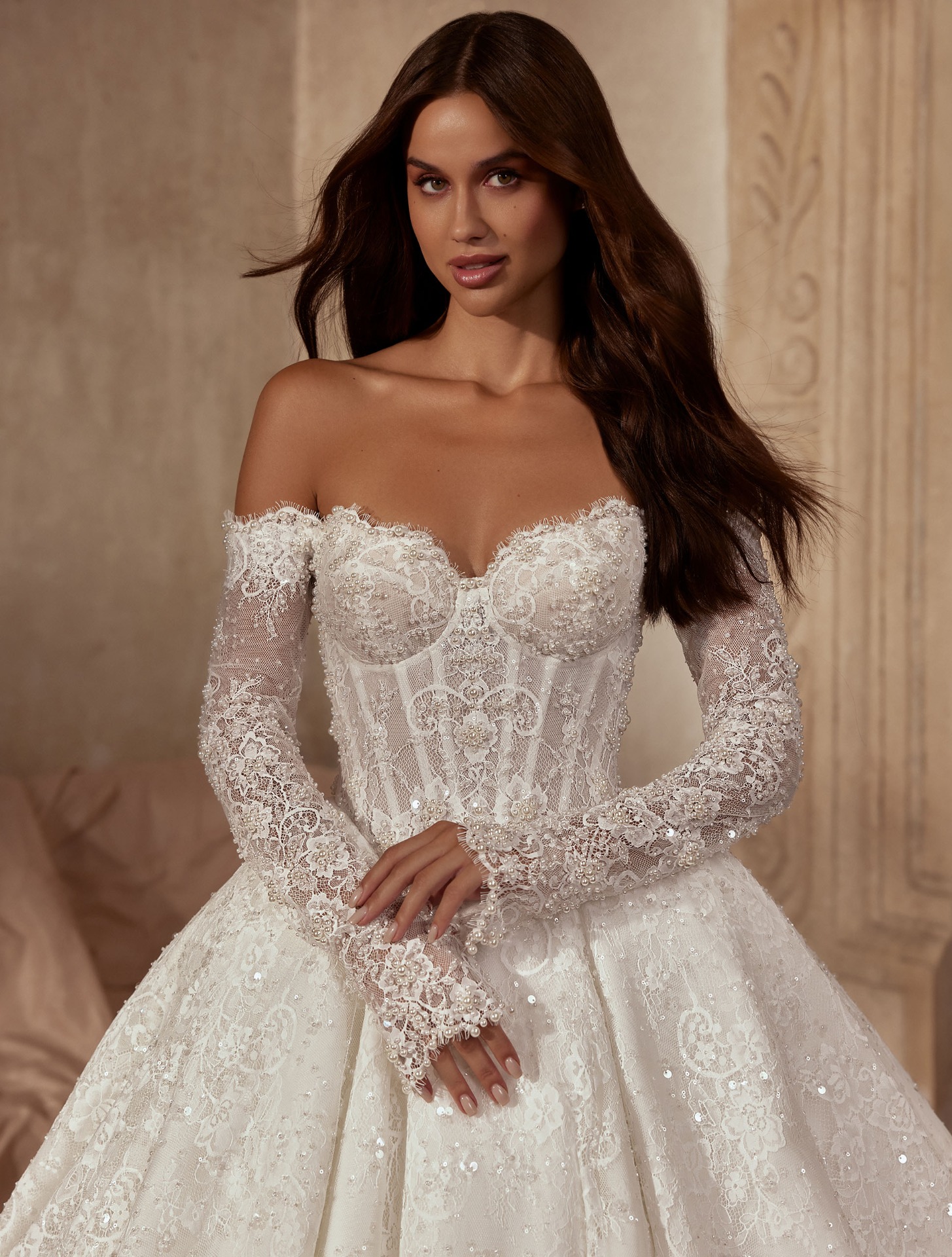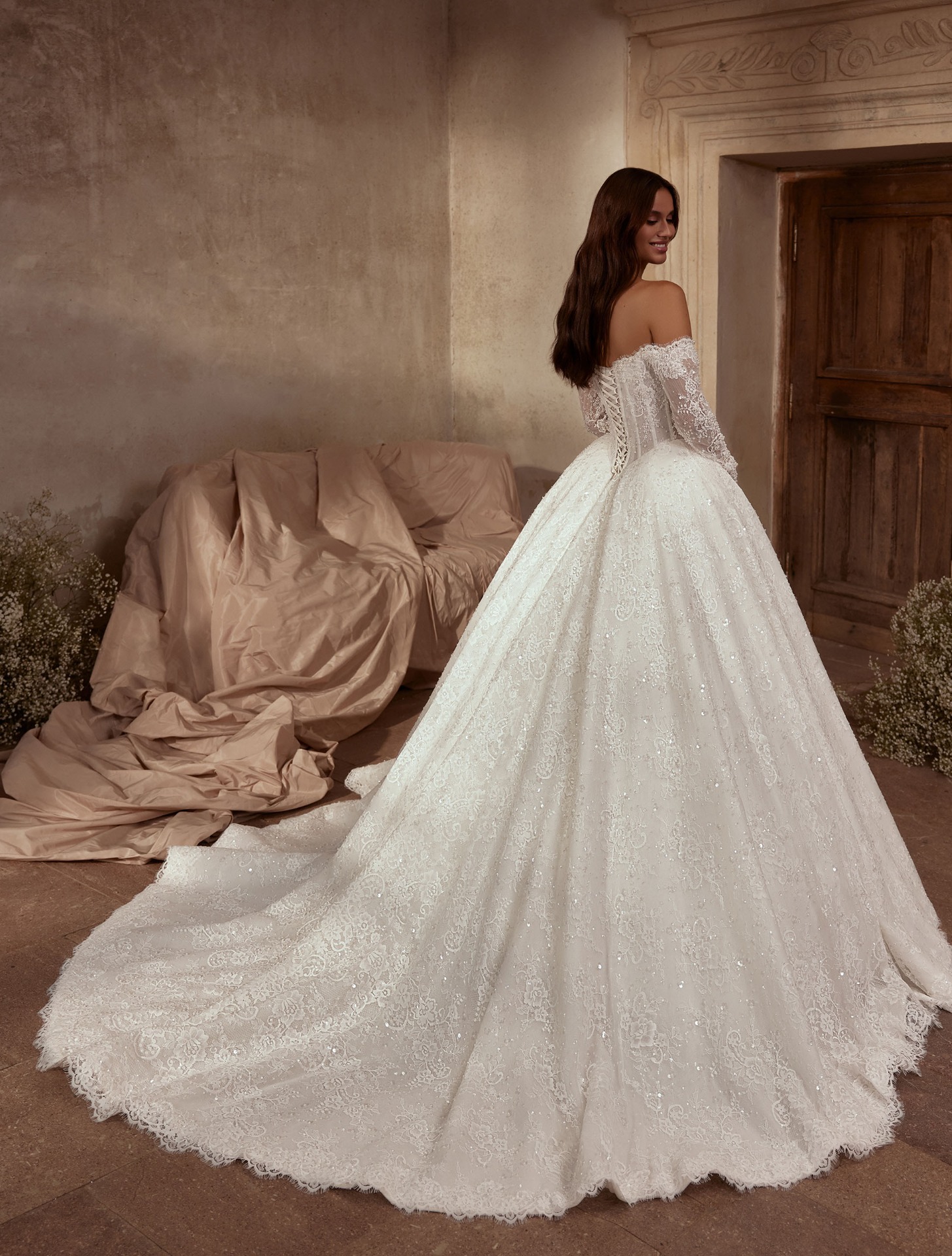 Az Amalia menyasszonyi ruha a klasszikus báj és a modern kifinomultság találkozása. A vállról leomló, hosszú csipkeujjak nőies eleganciát sugároznak, míg a fűzős felsőrész finoman formálja az alakot. A gazdagon hímzett, apró gyöngyökkel díszített csipke a fény minden árnyalatát megcsillogtatja, életre keltve a ruha minden részletét.