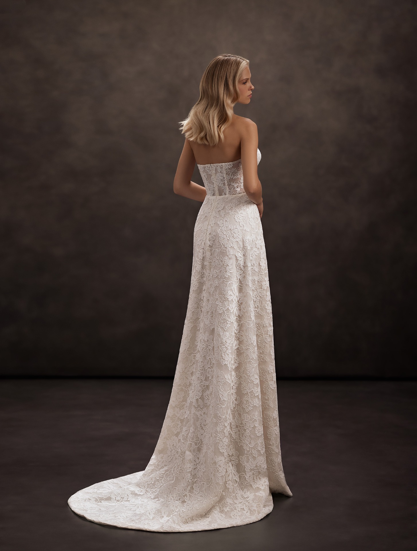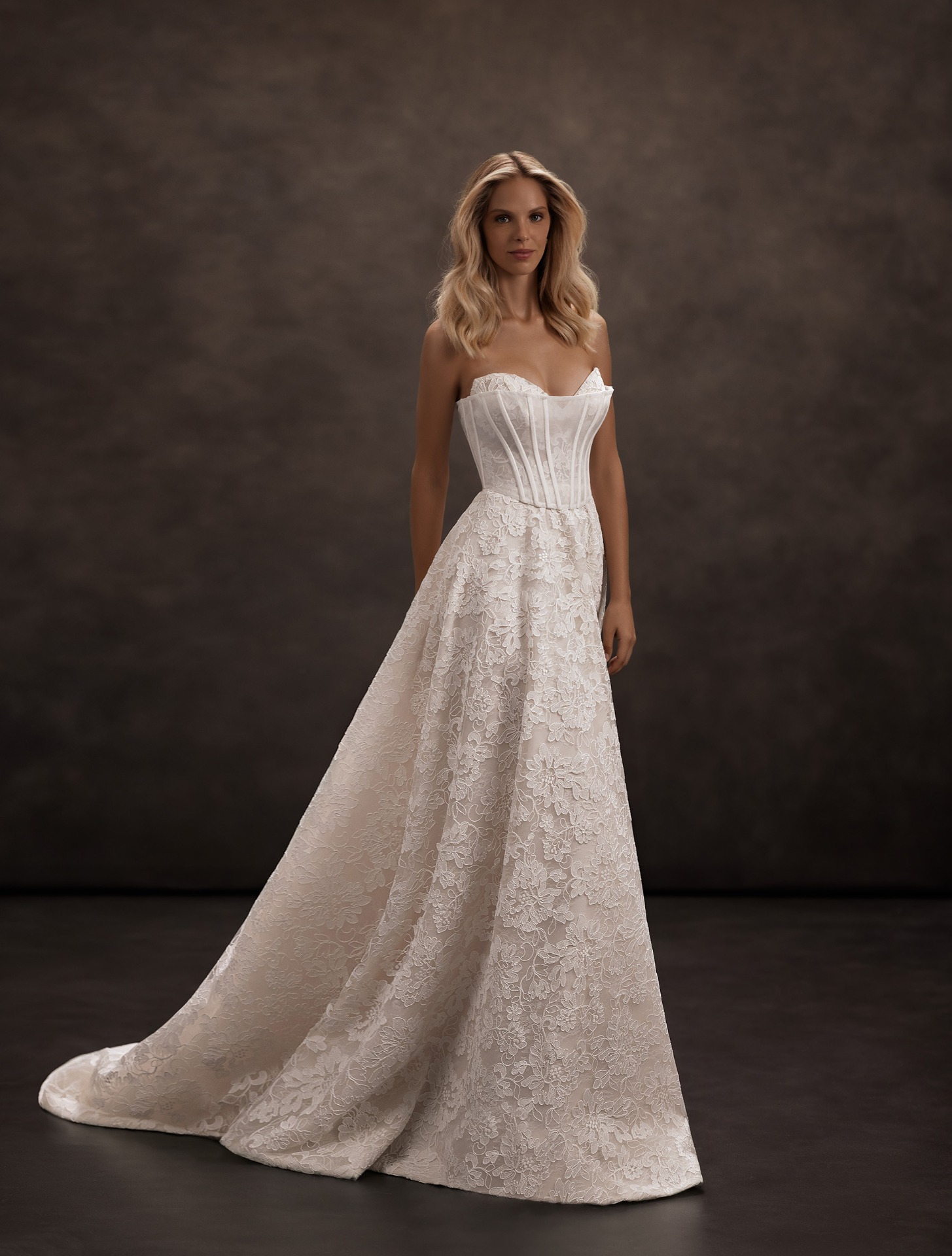 A pánt nélküli, szív alakú fűzős felsőrész lágyan formálja a dekoltázst, miközben a strukturált vonalak elegánsan hangsúlyozzák a derekat. A virágmintás csipkével borított A-vonalú szoknya romantikusan omlik alá, minden lépésnél könnyed mozdulatot engedve. A hátán áttetsző csipkebetét kifinomult, érzéki részlet, amely tökéletesen kiegészíti a ruha harmonikus megjelenését.