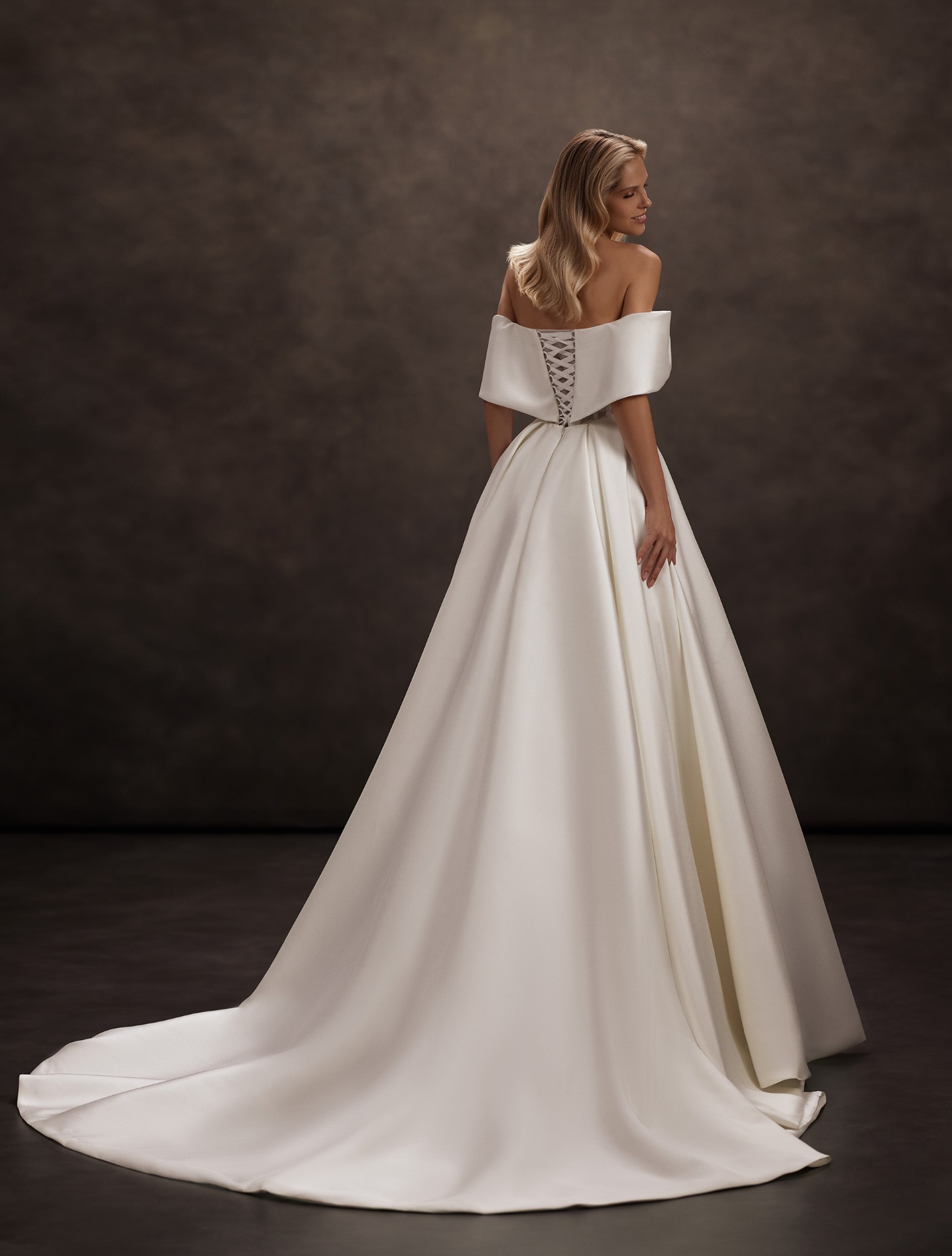 A vállról leomló, szoborszerű gallér lenyűgözően keretezi a dekoltázst, miközben a finom csipkével borított fűzős felsőrész érzékien formálja a sziluettet. Az A-vonalú, lágyan bővülő szoknya nehéz esésű, selyemfényű anyagból készül, amely elegánsan követi a mozdulatokat, és királynői tartást ad viselőjének. A hosszú, drámai uszály pedig a klasszikus menyasszonyi álmok esszenciáját hordozza magában.