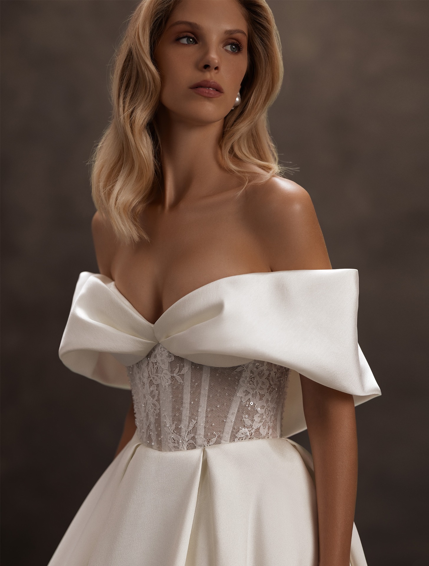 Az Anisa menyasszonyi ruha a kifinomultság, a klasszikus elegancia és a modern formai játék tökéletes egyensúlyát hozza el. Egy ruha, amely nemcsak látványával, hanem tartásával is elvarázsol – a nőies erőt és a lágyságot egyszerre sugározza.