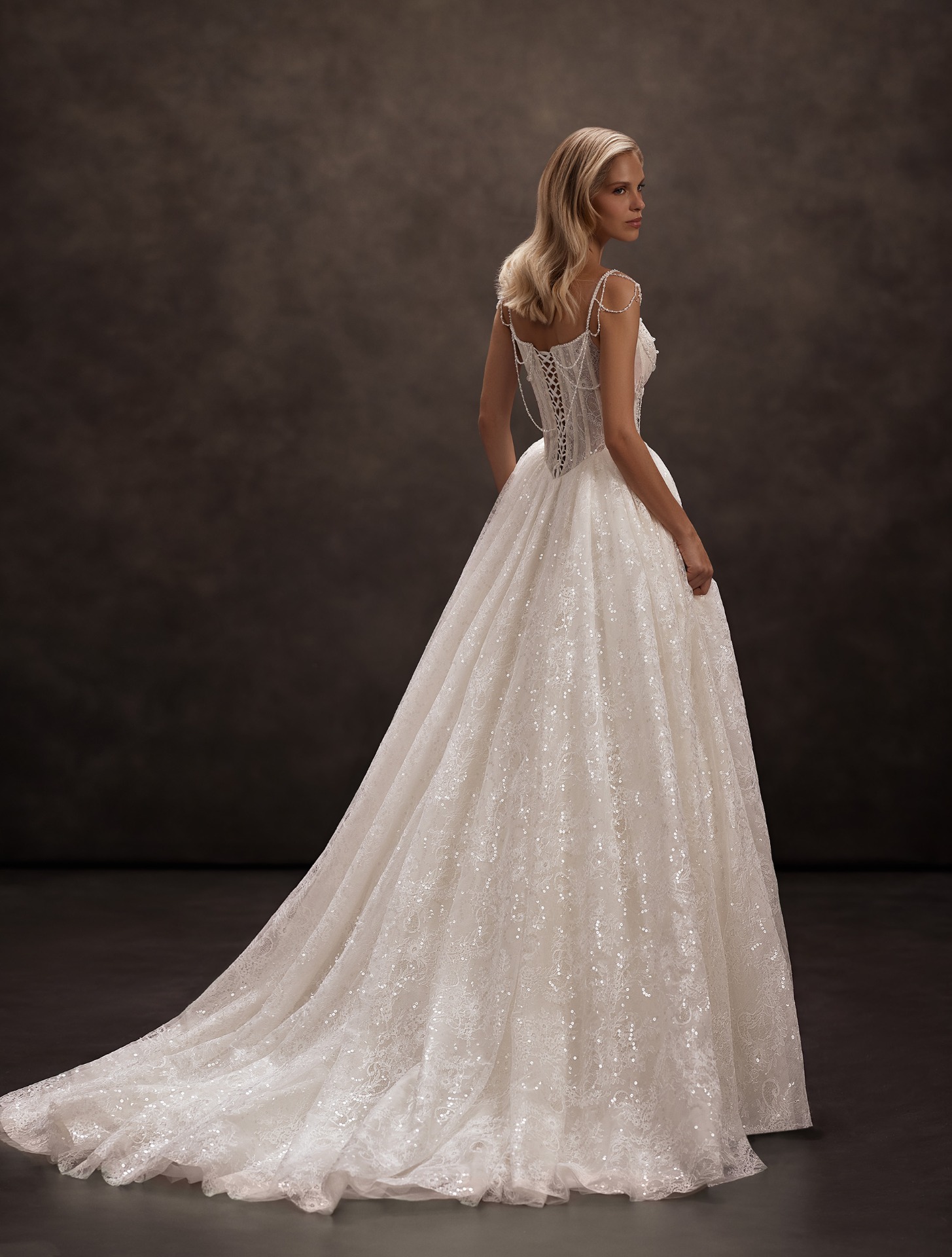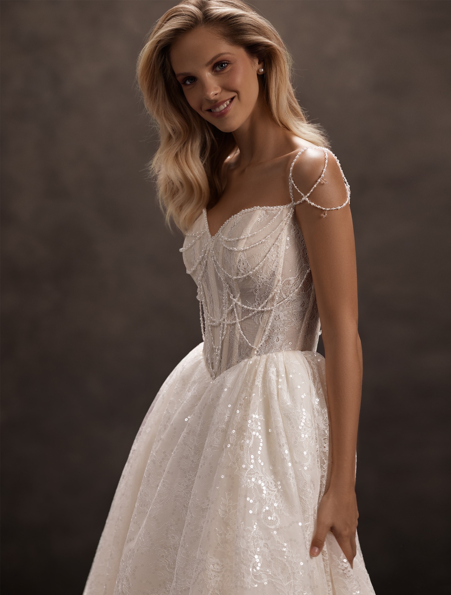 A fűzős, szív alakú dekoltázs érzékien formálja a felsőtestet, miközben a finoman gyöngyözött vállpántok és a vállról leomló gyöngysorok mesés, éteri hatást keltenek. Az A-vonalú, gazdagon rétegzett szoknya könnyed mozgást biztosít, minden lépésnél életre kelve a fény játékát.