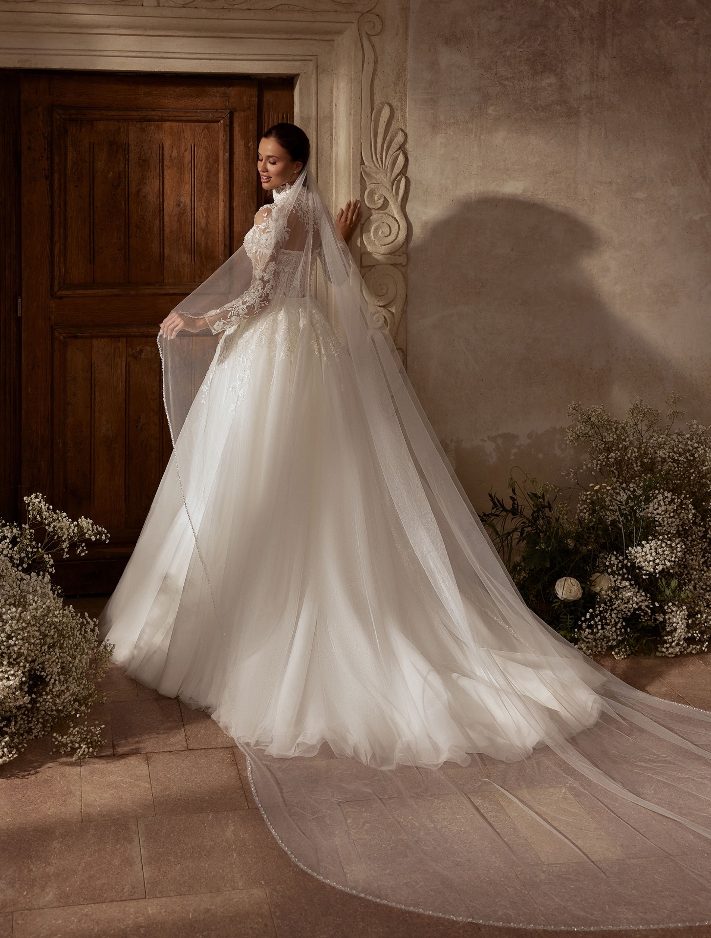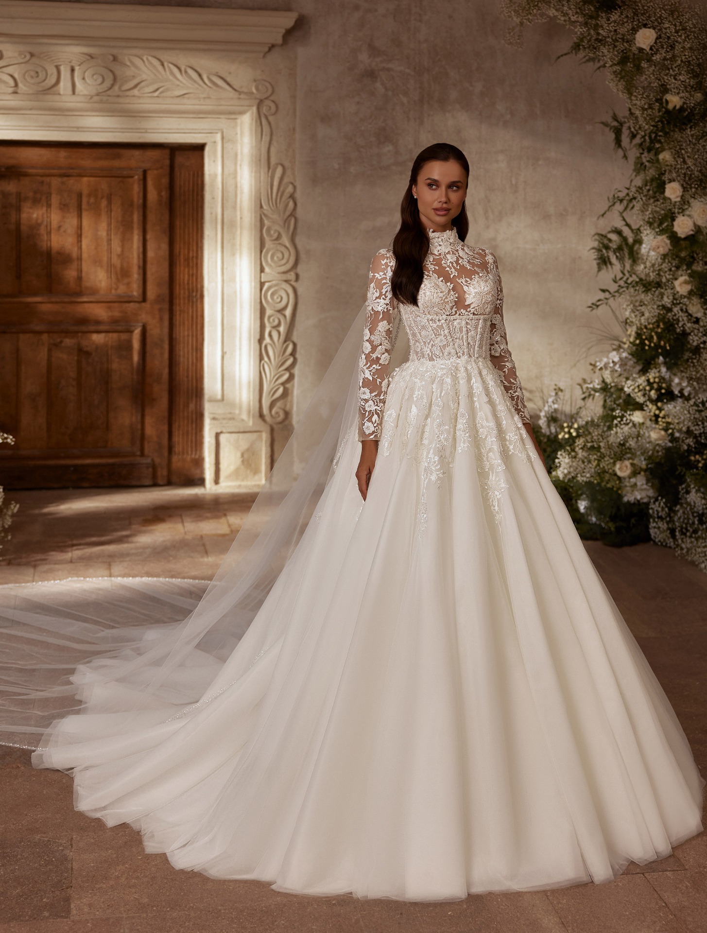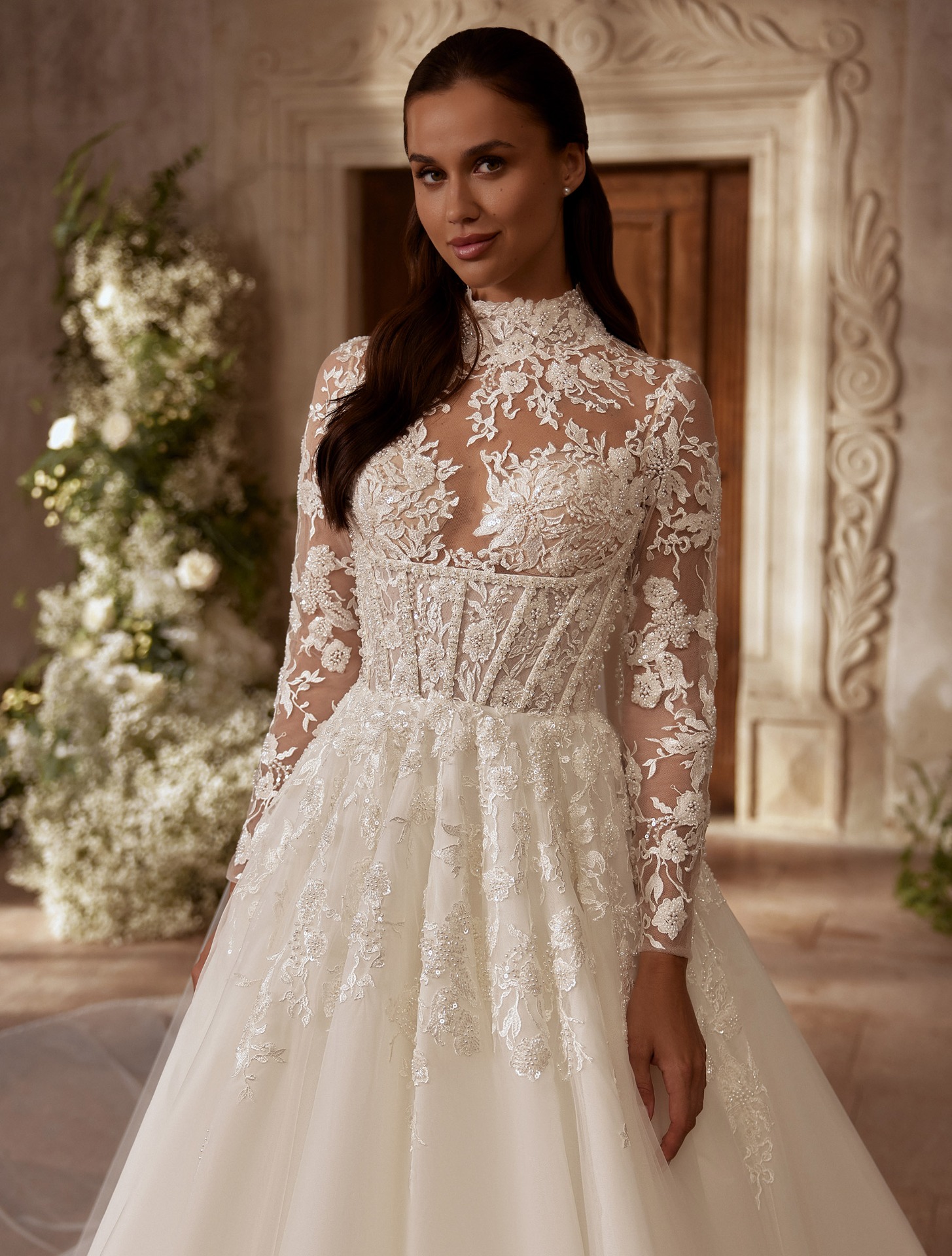 Az Arabella menyasszonyi ruha a hagyományos királynői stílust ötvözi a kortárs részletgazdagsággal. A magas nyakú, hosszú ujjú csipkebetétes felsőrész finoman áttetsző, mégis kifinomultan elegáns, míg a lágyan omló, gazdag tüllszoknya könnyed mozgást biztosít.