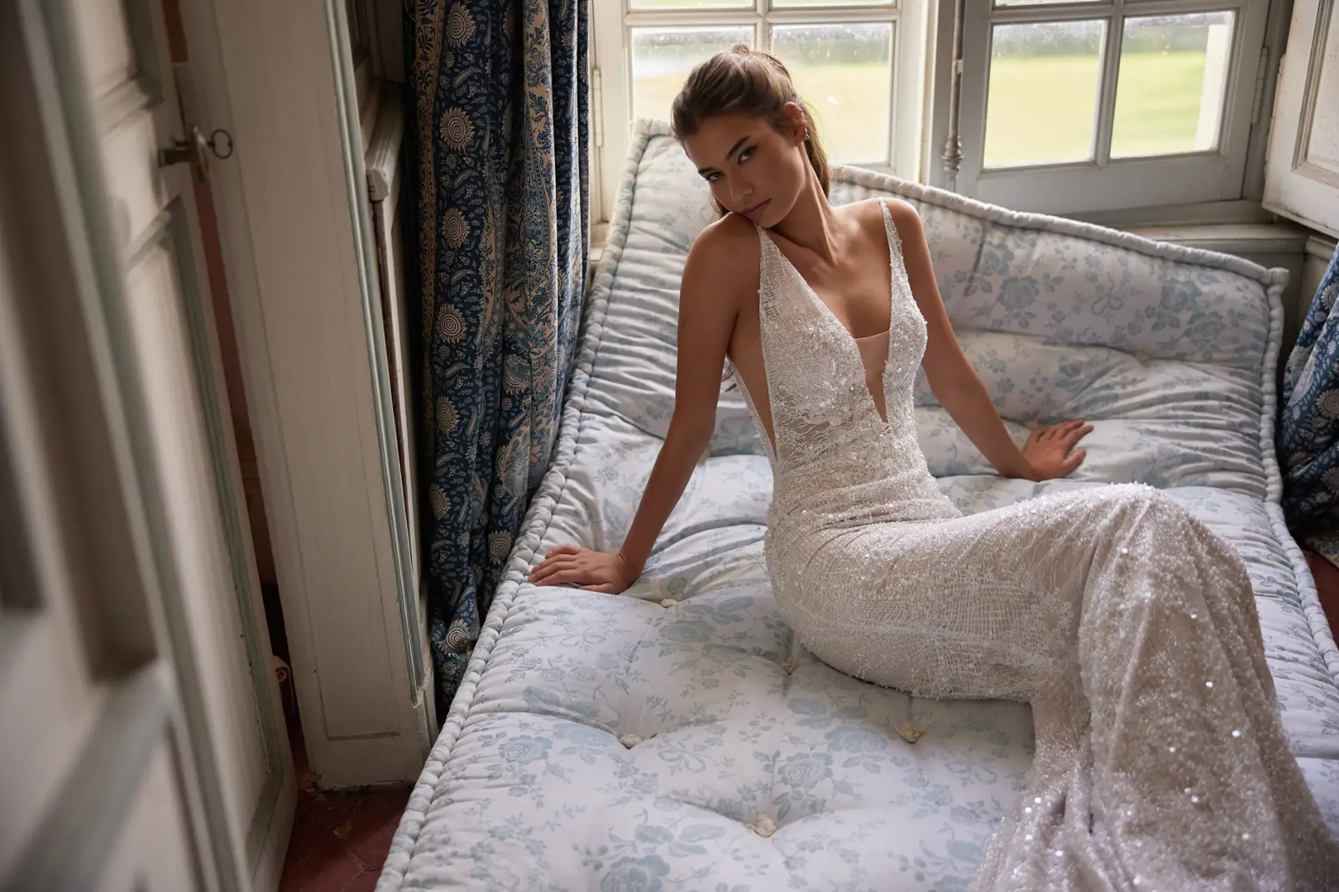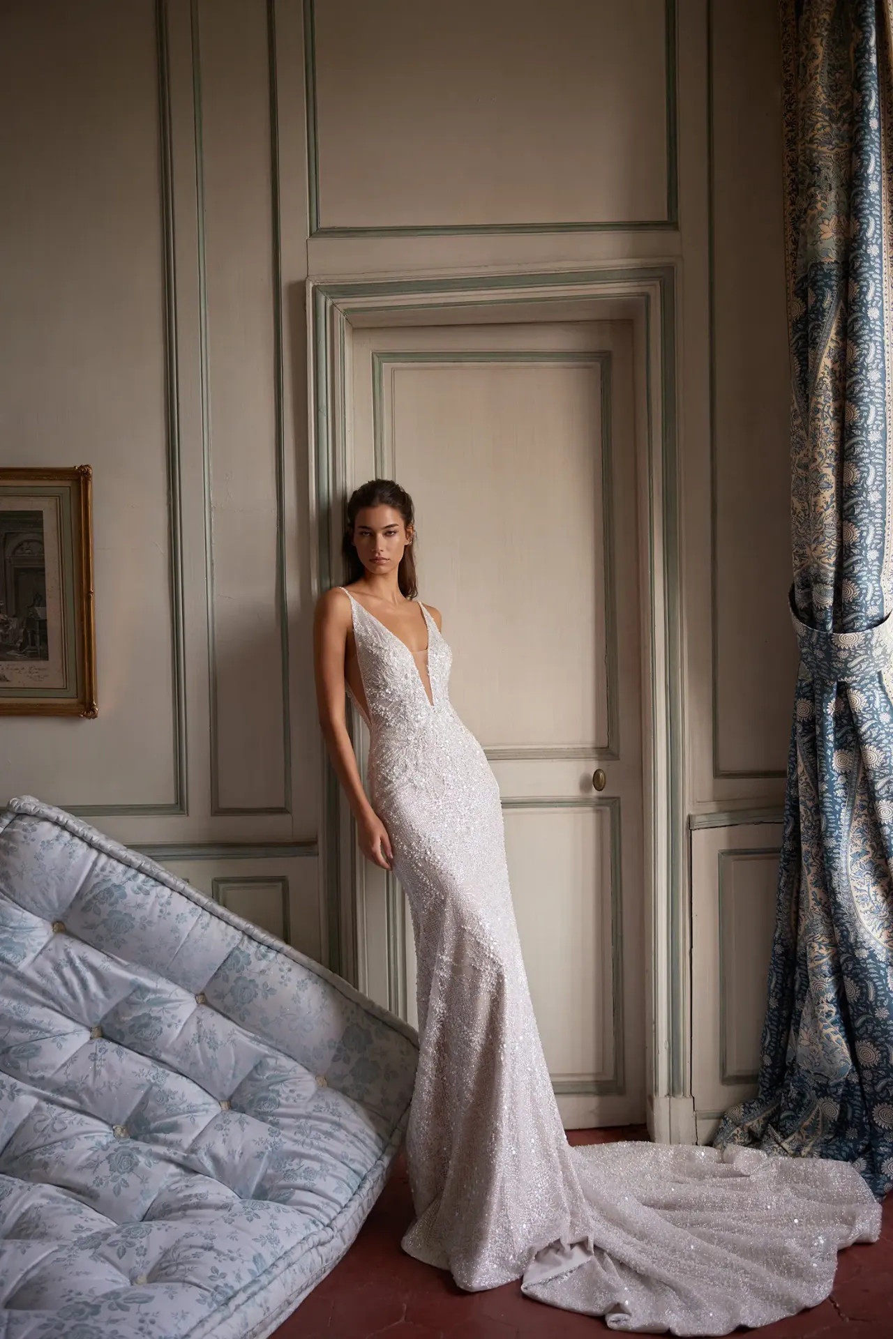 Szoborszerű sellő fazon: Ez a sellő fazonú menyasszonyi ruha szorosan követi a test vonalait, kiemelve a nőies formákat, majd egy lágyan omló, szikrázó uszályban végződik.
