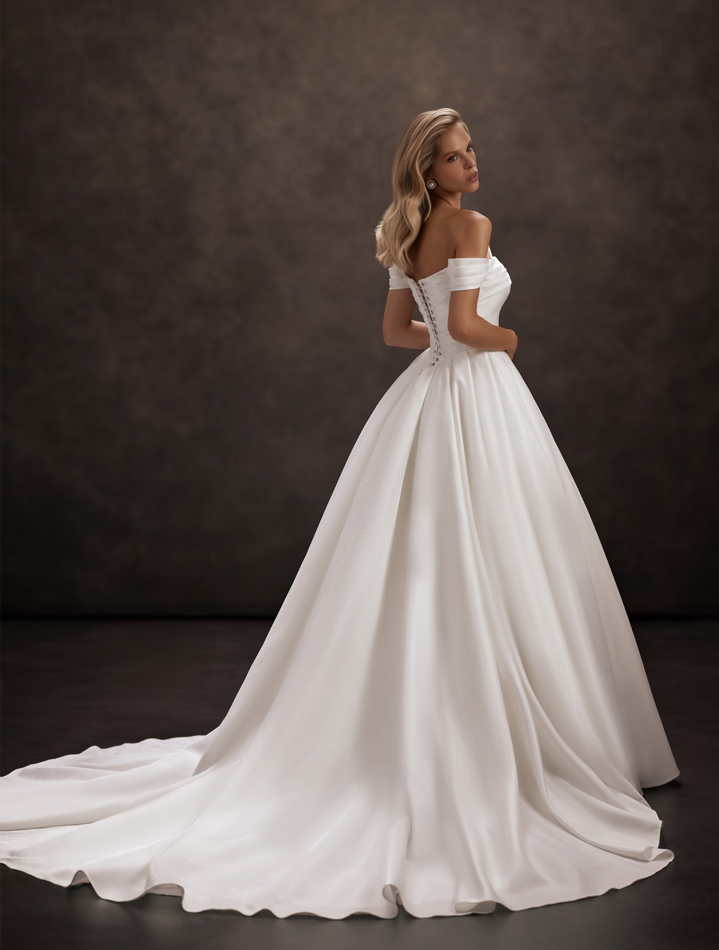 A karcsúsított derékrész nőiesen formálja az alakot, míg a telt, redőzött szoknya királynői hatást kelt, mégis könnyed mozgást biztosít. A hosszú, elegánsan leomló uszály az igazi romantika esszenciáját hordozza, minden pillanatban megidézve a nagybetűs esküvői álmot.