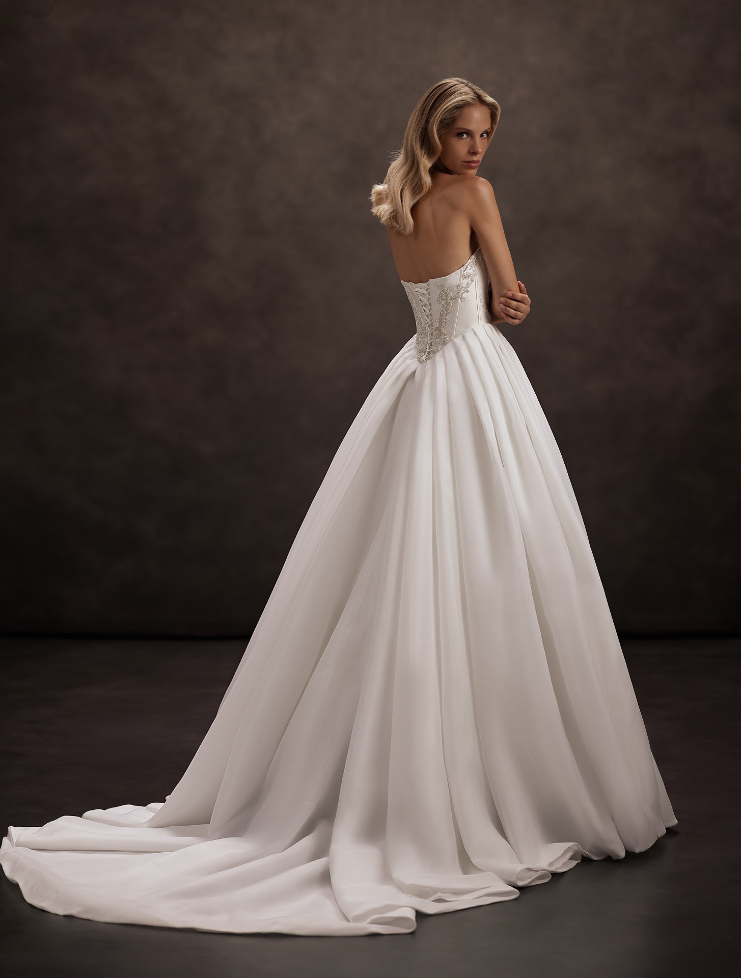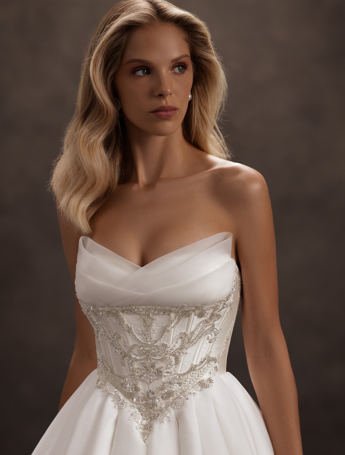 Az Asmaa menyasszonyi ruha a klasszikus hercegnői stílus újragondolt változata – olyan darab, amelyben a nemes anyagok, a ragyogás és a nőiesség tökéletes harmóniában találkoznak. A pánt nélküli, finoman drapírozott felsőrész lágyan követi a váll vonalát, miközben a gyöngyös és ezüstszálas hímzéssel díszített fűzős rész igazi mestermunka: a részletekben rejlő luxus.