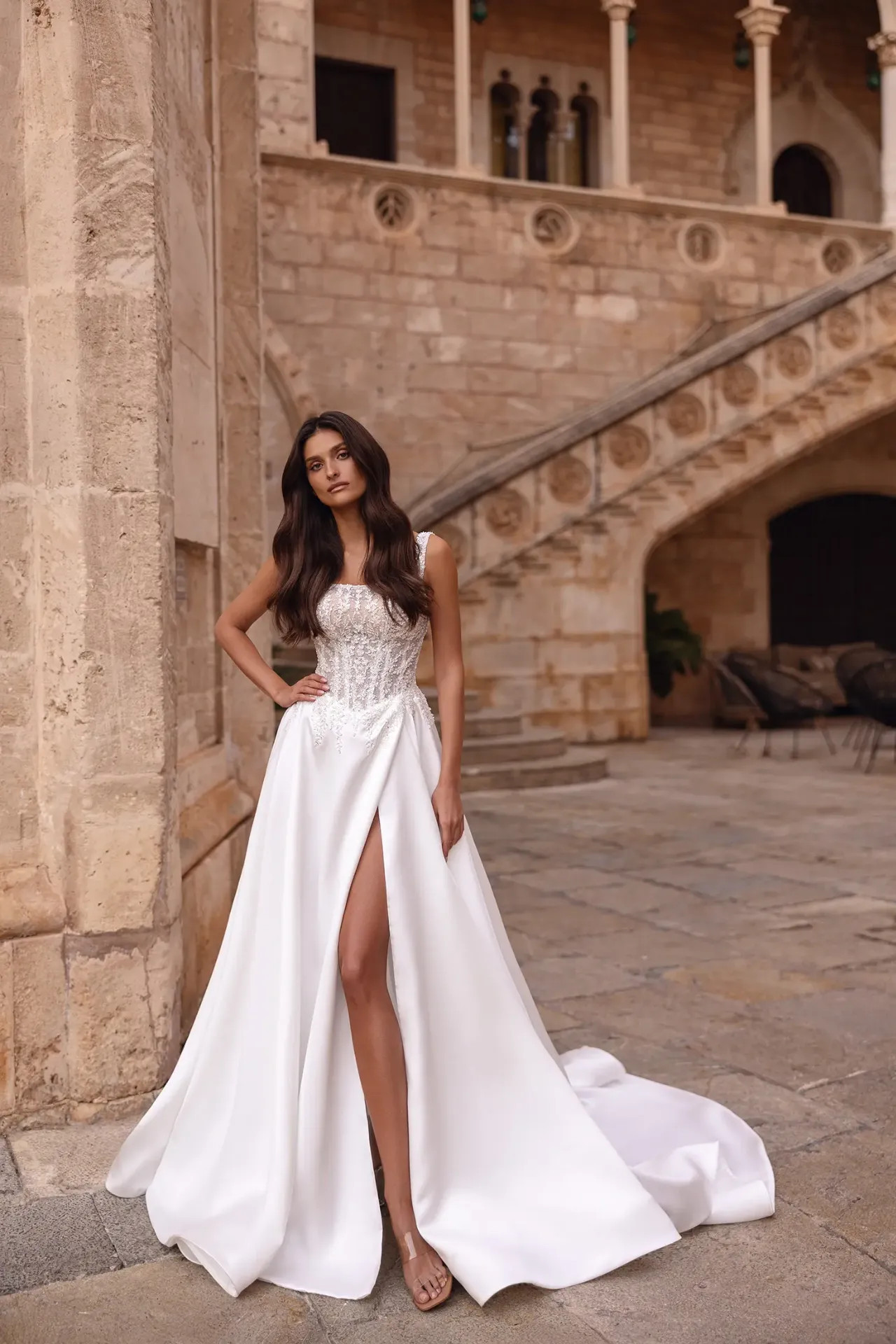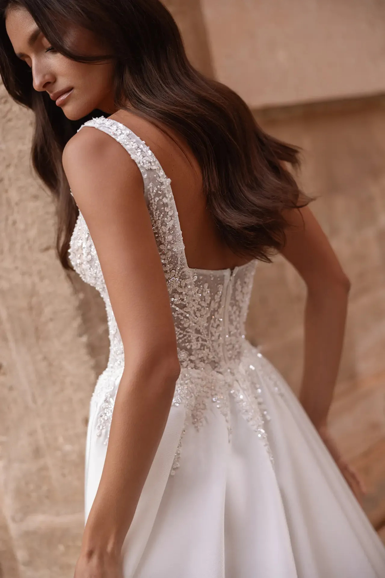 Az Astoria ruha a "kevesebb több" elvét emeli "couture" szintre. Olyan menyasszonyoknak készült, akik a letisztult, szoborszerű formákat keresik, de nem akarnak lemondani az ünnepi csillogásról és a merész, divatos részletekről sem. Ez a modell a 2026-os év egyik legizgalmasabb darabja.