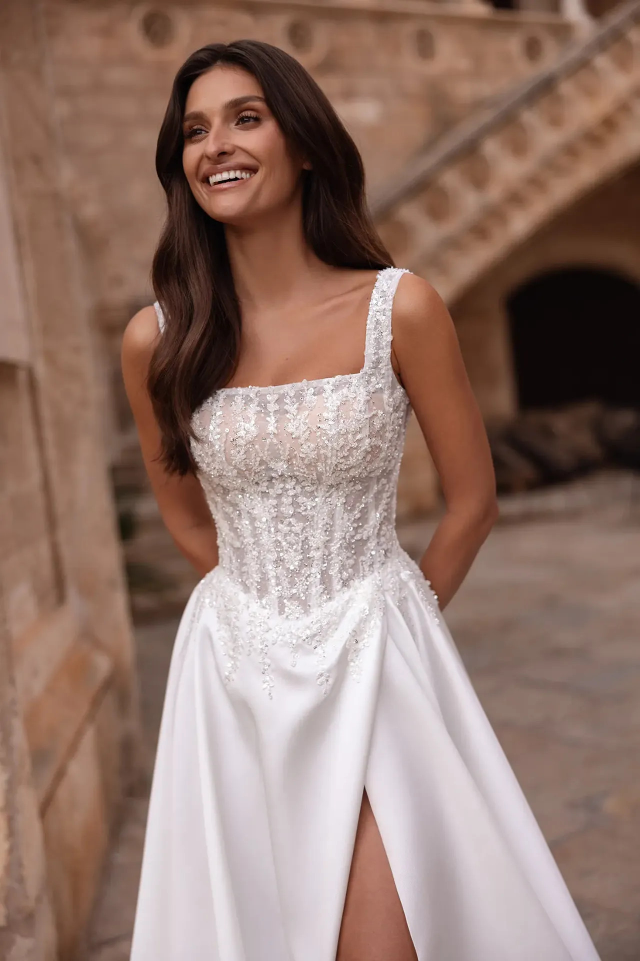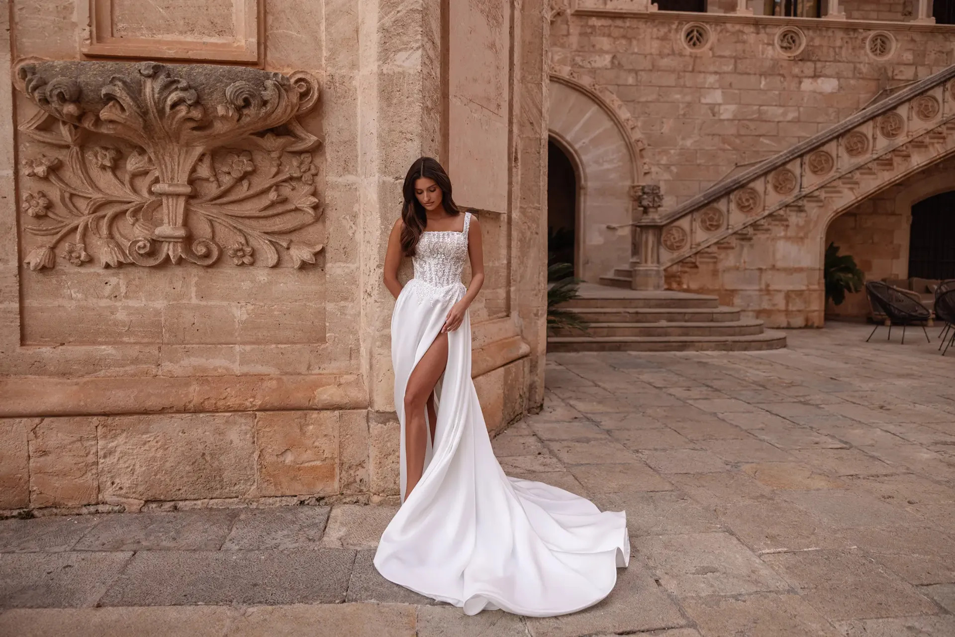 Merész combközépig érő hasíték: A ruha igazi "fűszere" a szoknyán található magas felsliccelés. Ez a megoldás nemcsak modern csábítást kölcsönöz a megjelenésnek, hanem szabad mozgást is biztosít, és lehetővé teszi, hogy megmutasd a választott esküvői cipődet.