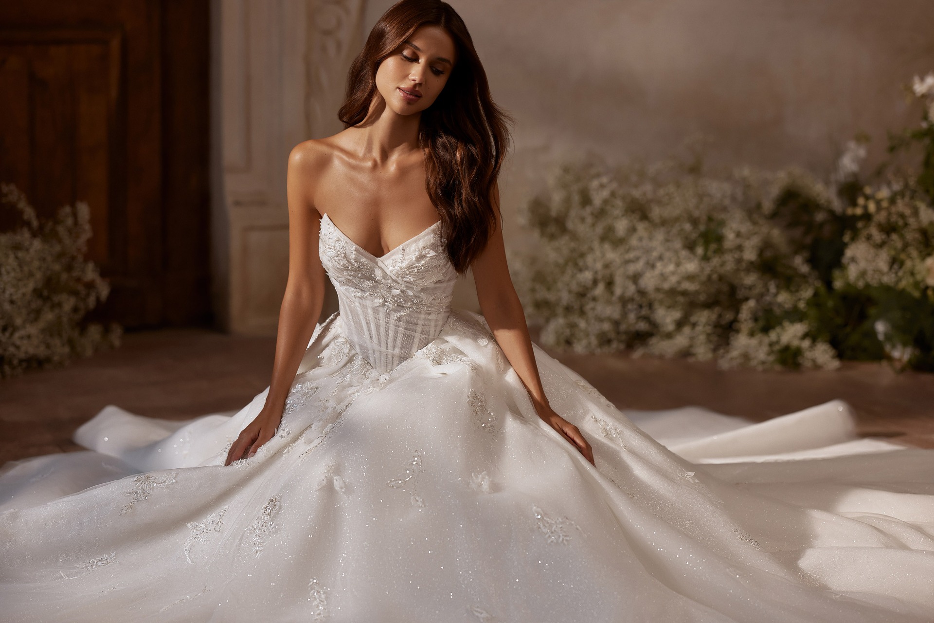 A Bianca menyasszonyi ruha a visszafogott elegancia és a látványos részletgazdagság jegyében született. A szív alakú, pánt nélküli fűzős felsőrész finoman formálja az alakot, miközben a gyönyörű csipkeapplikációk és a kézzel hímzett gyöngyrészletek ragyogó fényt adnak minden mozdulatnak.