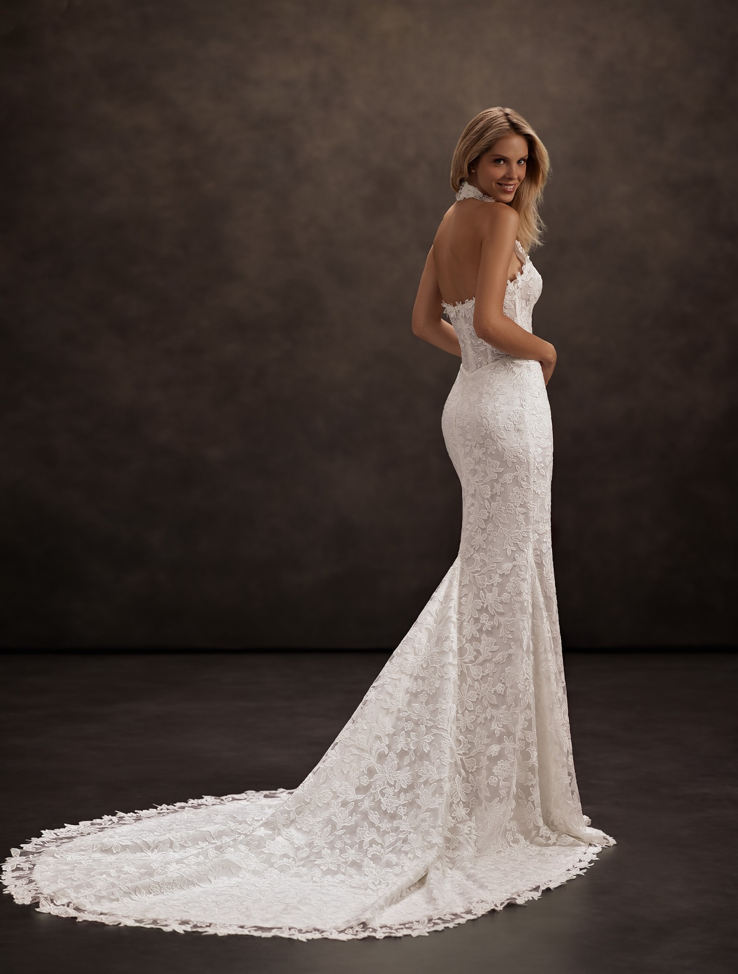A finom virágmintás csipke különleges textúrát és mélységet ad a ruhának, a sellő fazon pedig kecsesen követi a test vonalát, kiemelve a nőiességet. A hosszú, csipkeszegélyes uszály álomszerű hatást kelt, ahogy lágyan elterül a menyasszony mögött, minden lépésnél egy pillanatra megállítva az időt.