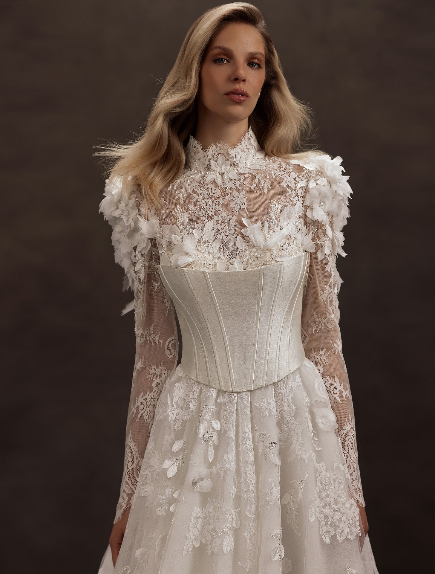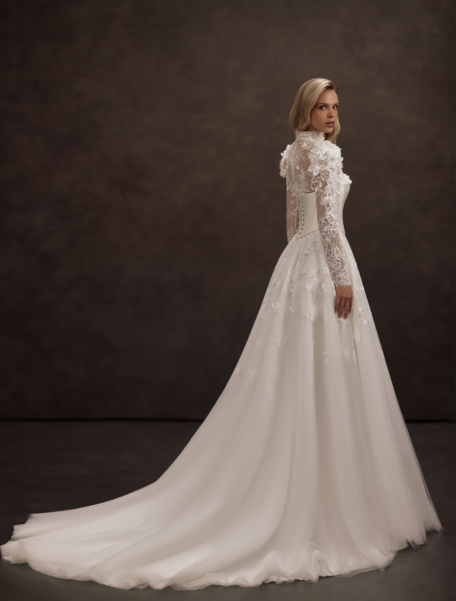 A Bouchra menyasszonyi ruha a klasszikus elegancia és a modern couture megtestesítője. Ez a kreáció a részletekben él — minden varrás, minden csipkeszál az időtlen nőiességet dicséri. A magas nyakú, hosszú ujjú felsőrész finom Chantilly csipkéből készült, amelyet 3D virágapplikációk díszítenek, életre keltve a természet ihlette romantikát.