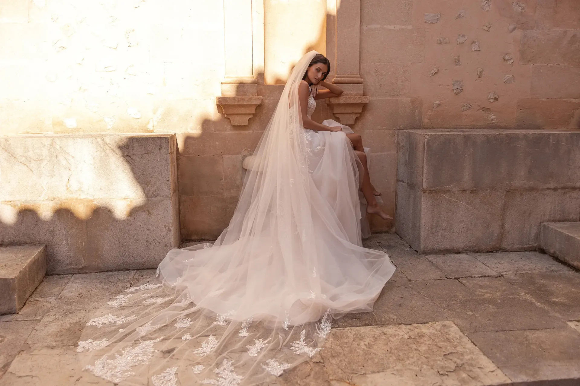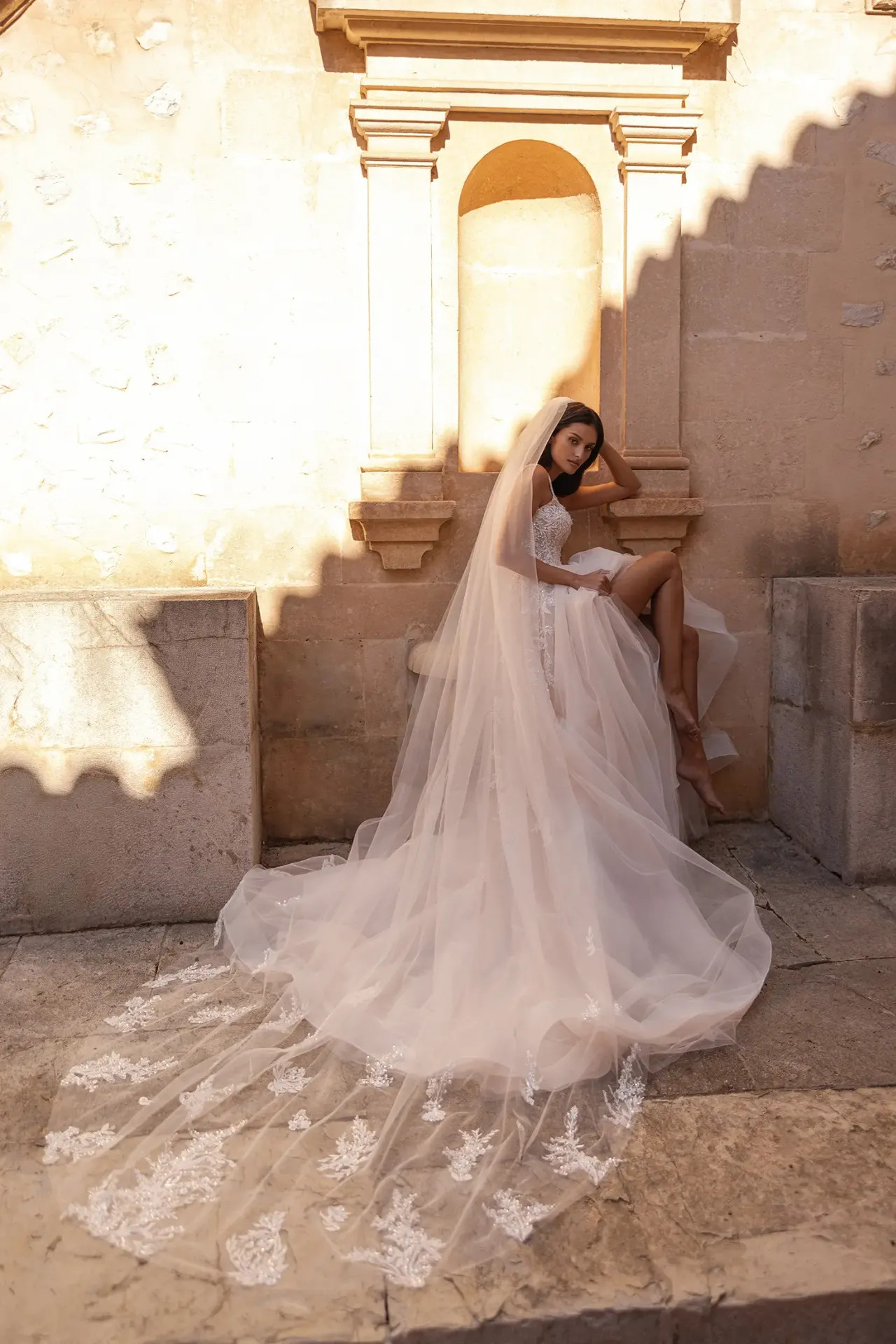 Teljes összhang fátyollal: A megjelenést egy tökéletesen passzoló csipke fátyol koronázza meg, amely visszatükrözi a ruha aprólékos mintázatát, megteremtve a tökéletes, éteri befejezést.