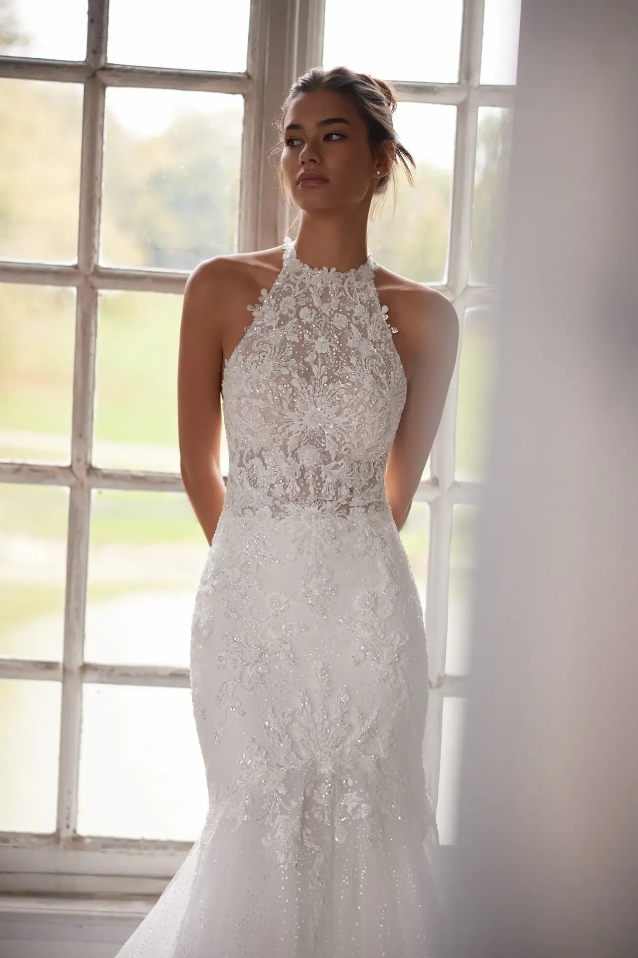 Szoborszerű sziluett: A csípőig szorosan illeszkedő fazon gyönyörűen hangsúlyozza a vonalaidat, majd lágyan bővül ki, végül egy gazdagon díszített, romantikus uszályban végződik.