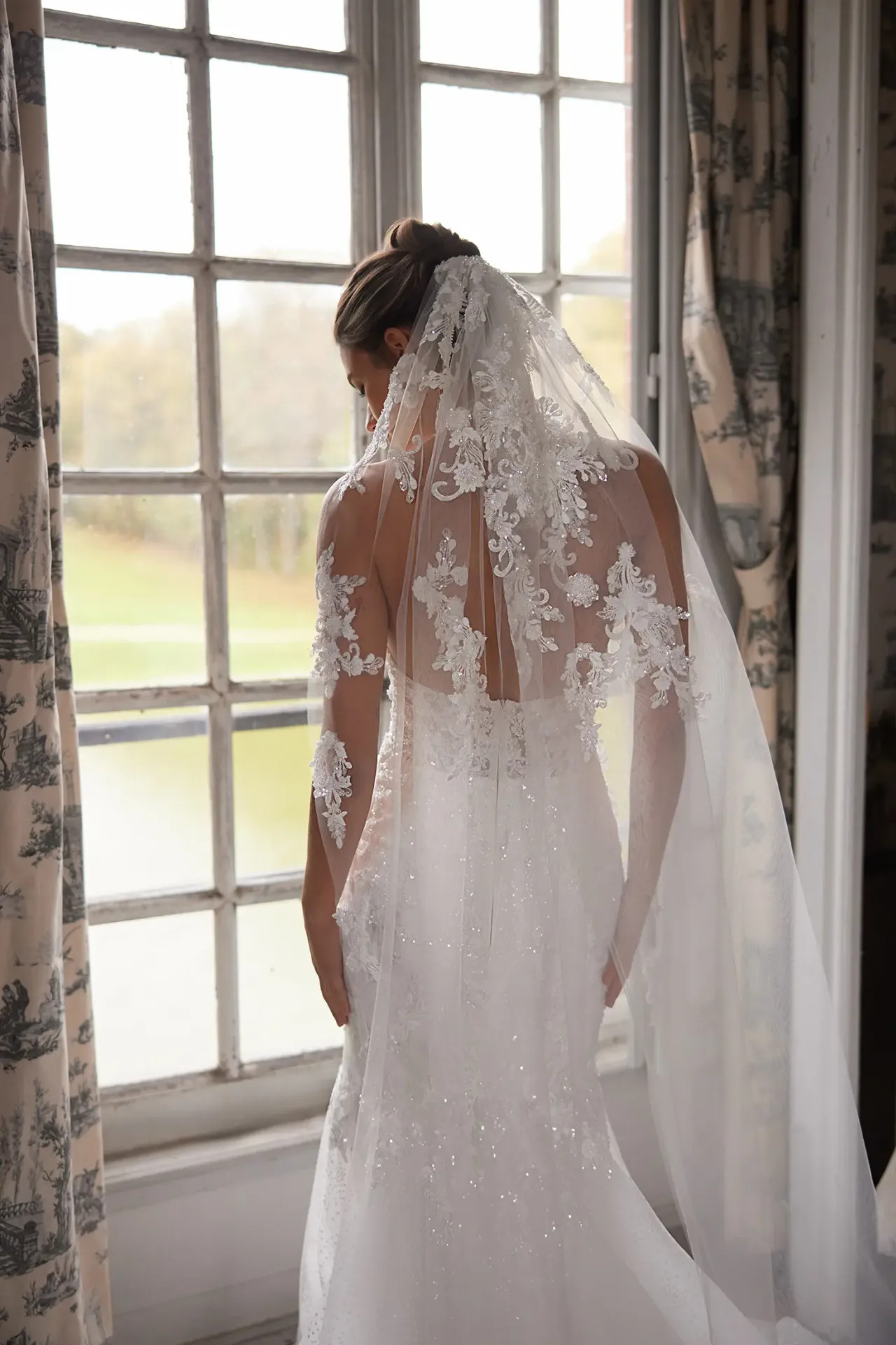 Díszített fátyol: A szettet egy szintén hímzett és gyöngyözött fátyol teszi teljessé, amely megkoronázza ezt a modern luxusmegjelenést.