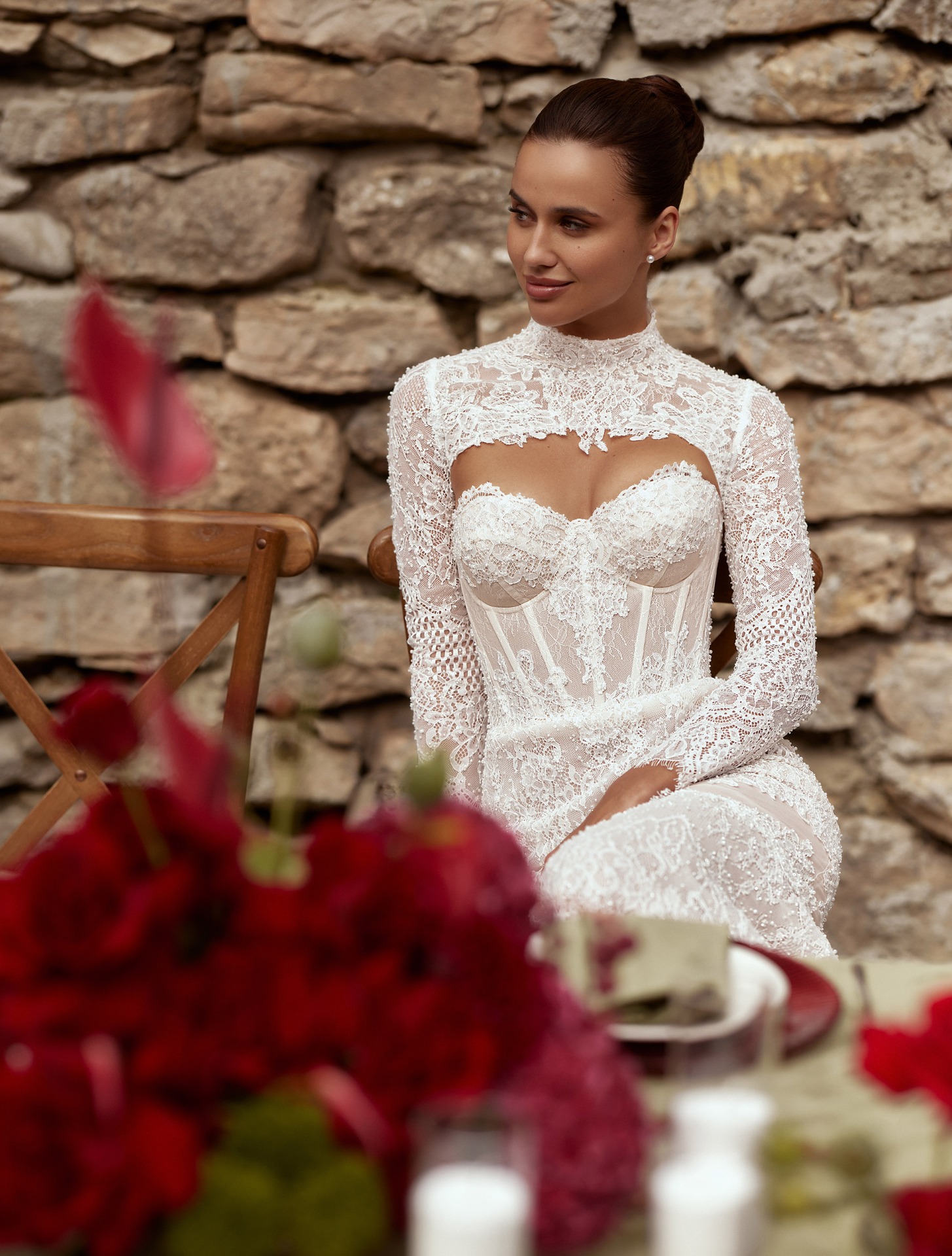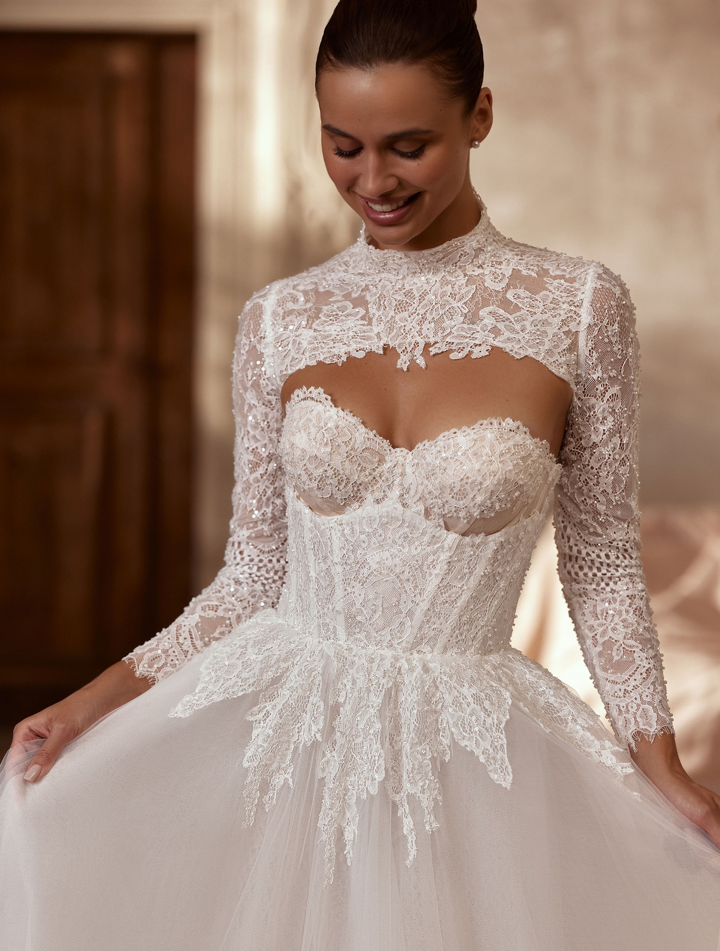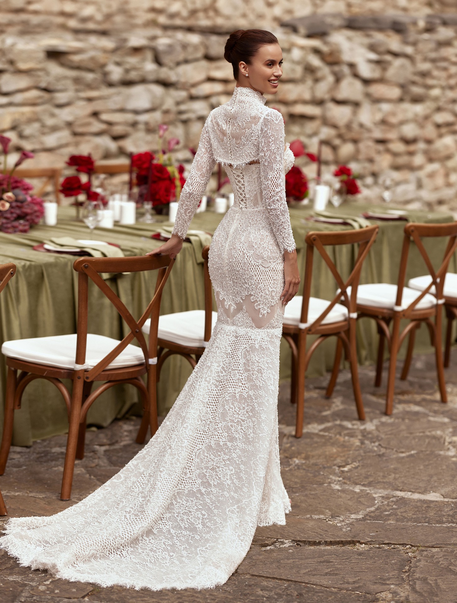 A magas csipkegallér és a kivágott dekoltázs egyszerre érzéki és előkelő. A Clarisse minden apró részlete kézzel készült, és csak rendelésre érhető el a Holdfény Szalonban – azok számára, akik a tökéletesség legfinomabb formáját keresik.