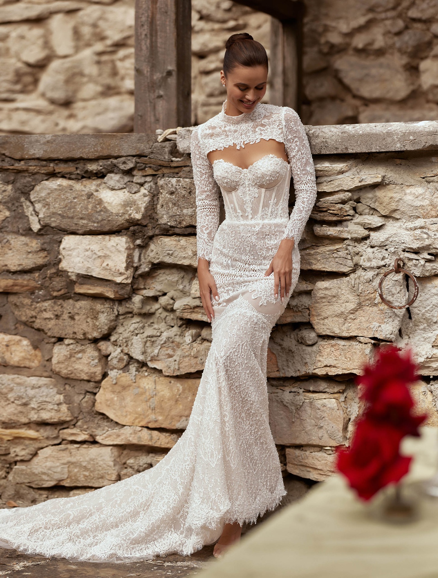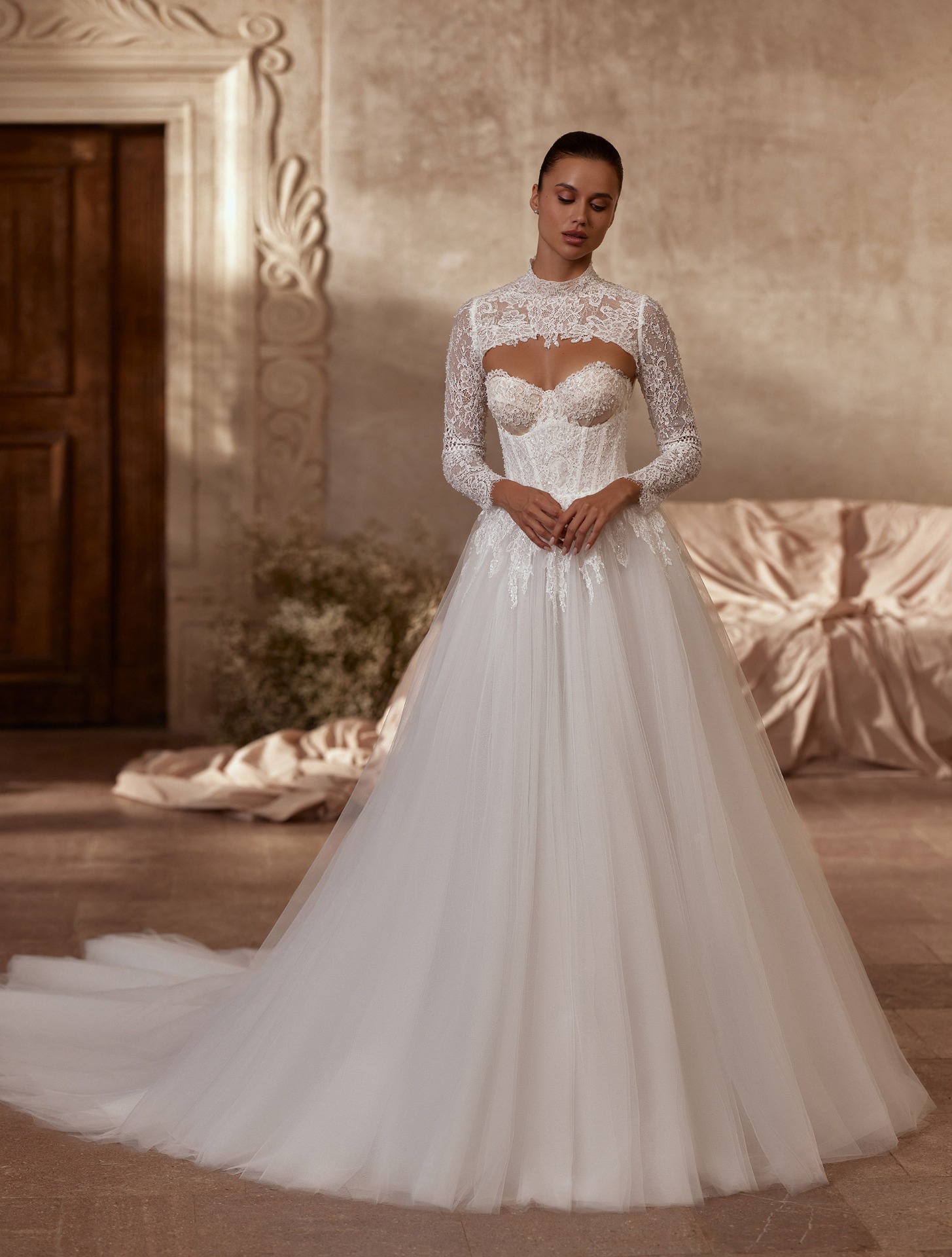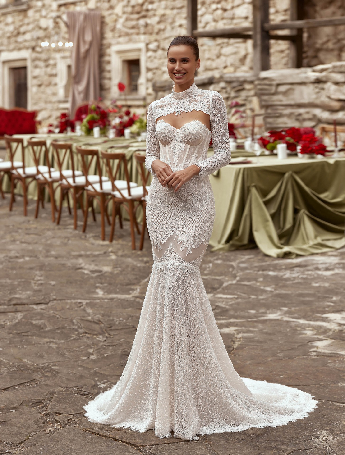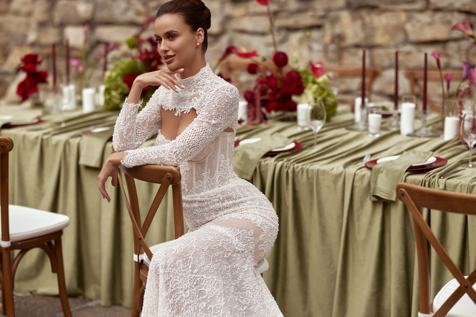 A magas csipkegallér és a kivágott dekoltázs egyszerre érzéki és előkelő. A Clarisse minden apró részlete kézzel készült, és csak rendelésre érhető el a Holdfény Szalonban – azok számára, akik a tökéletesség legfinomabb formáját keresik.