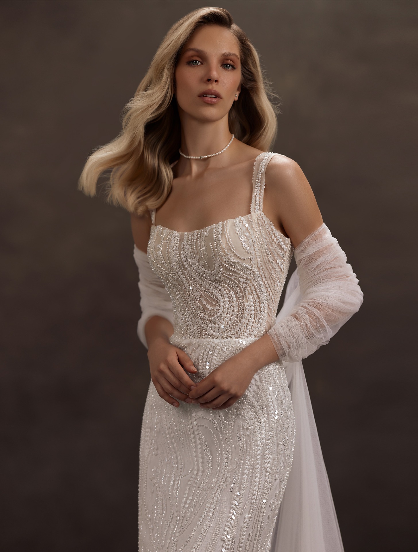 A tüllből készült, levehető uszály és a finom vállpántok tökéletes harmóniát teremtenek a modern menyasszony számára, aki szeretné a klasszikus eleganciát kortárs ragyogással ötvözni. A Denia nem csupán ruha – ez a fény öltözéke.