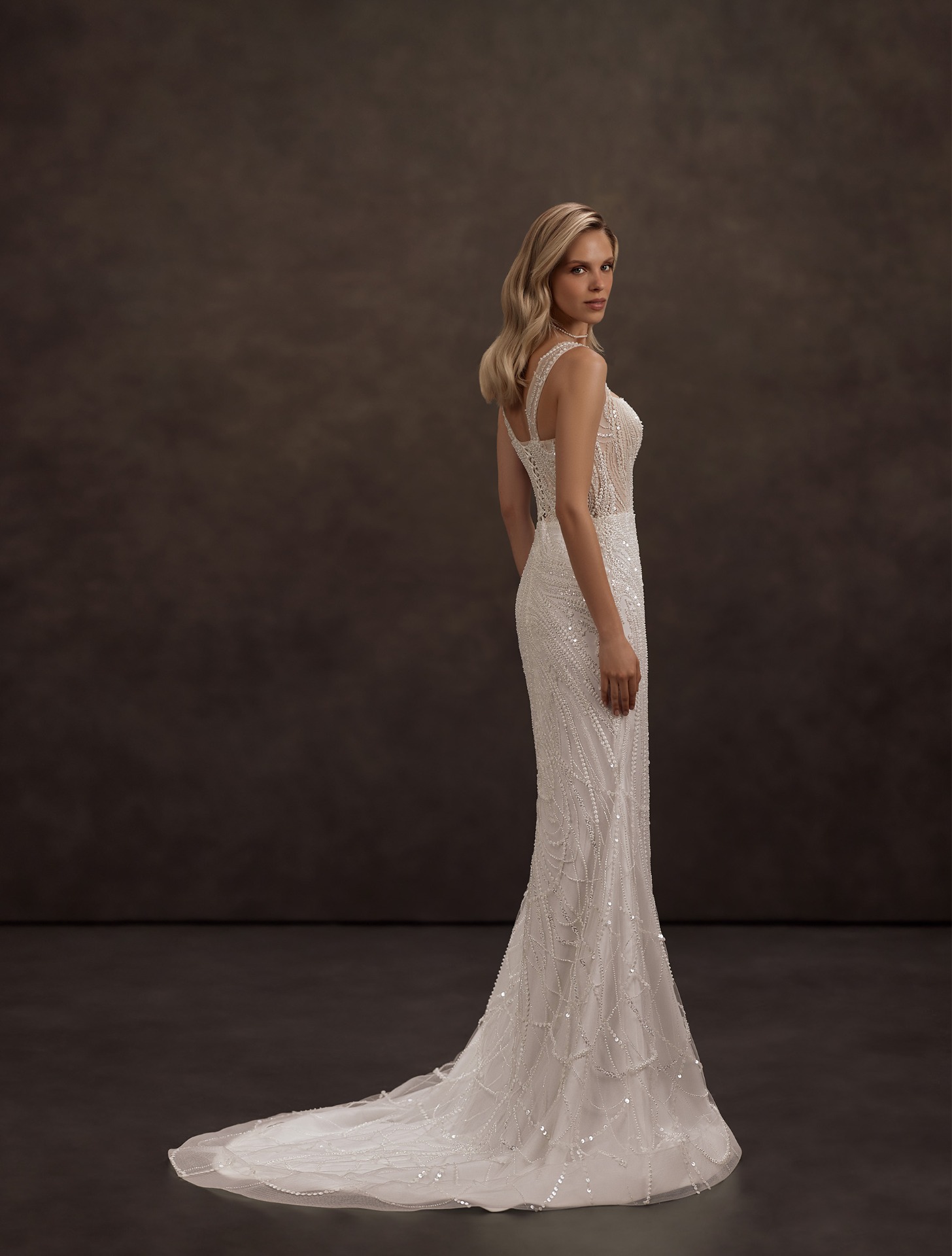 A Denia menyasszonyi ruha a fények táncát viszi a színpadra – minden mozdulatban csillogás, minden részletben kifinomultság. A szabott, testet követő fazon letisztult, mégis drámai, miközben az aprólékosan elhelyezett gyöngy- és flitterhímzések elegáns hullámokat rajzolnak a ruha teljes hosszán.