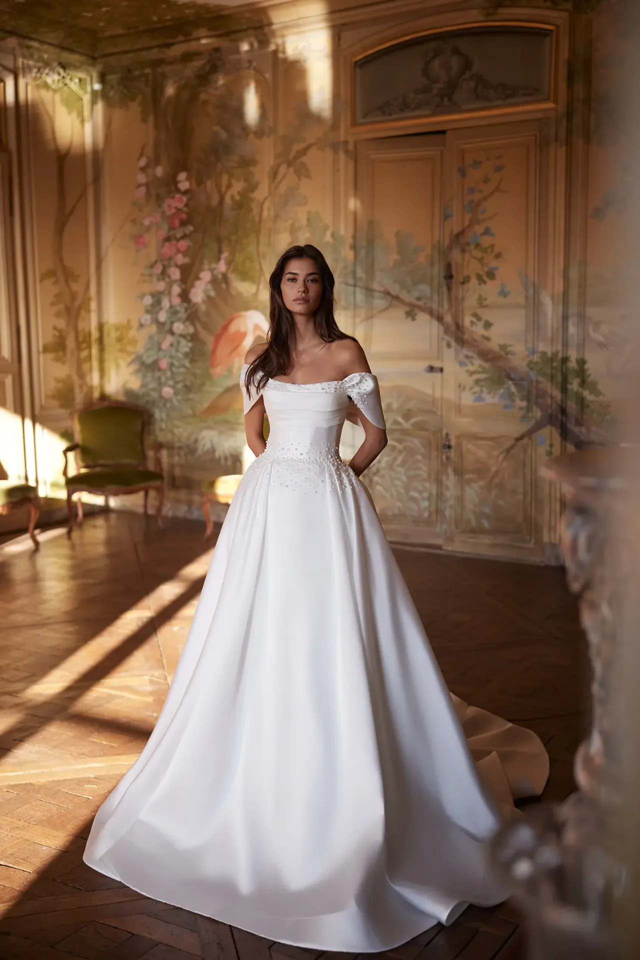 Drapírozott dekoltázs: Az ejtett vállú felsőrész lágyan drapírozott dekoltázsa rendkívül nőies és elegáns keretet ad az arcnak.