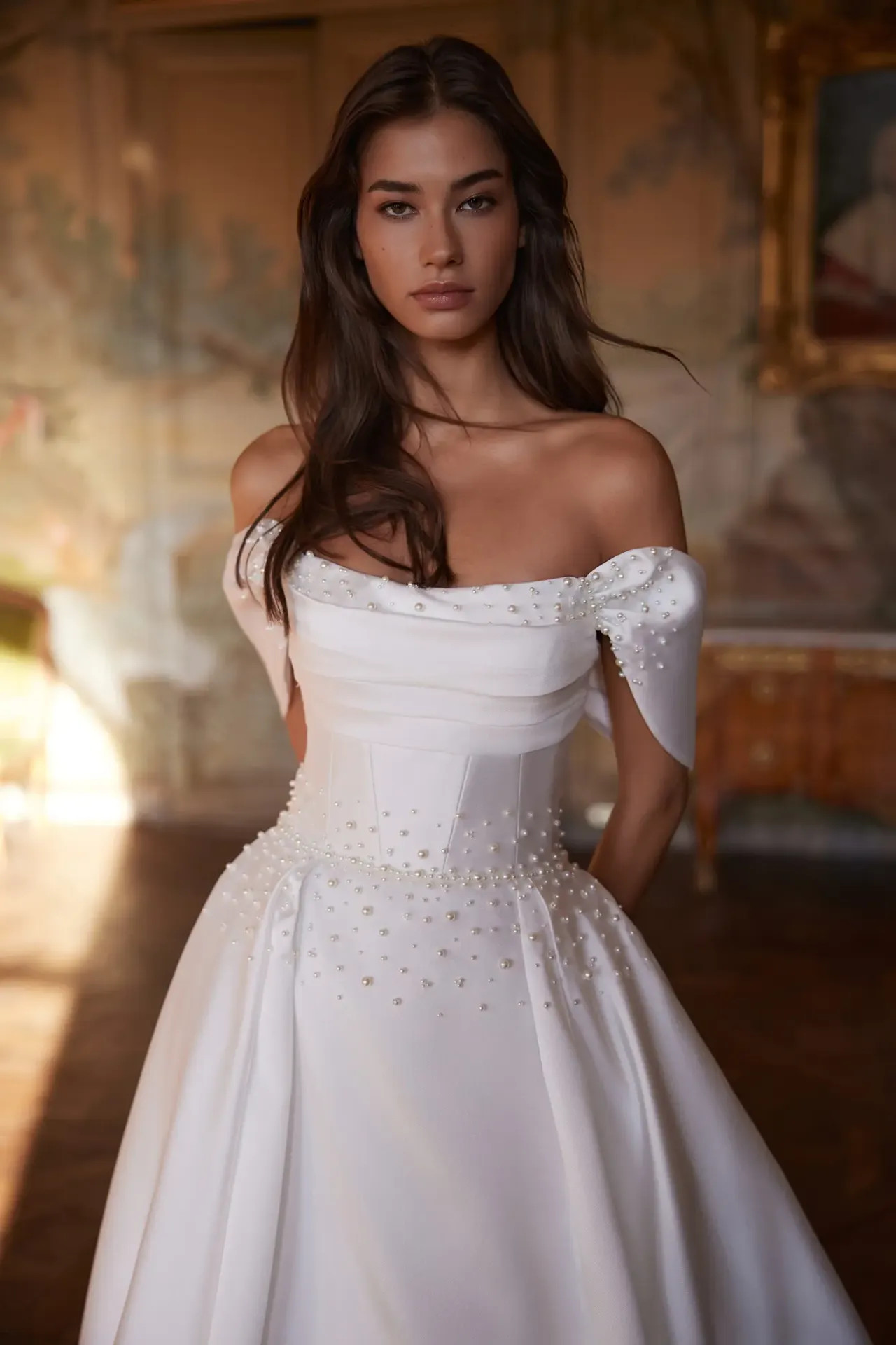 Gyöngyházfényű részletek: A dekoltázst és a derékvonalat apró, finom gyöngyök díszítik. Ez a diszkrét csillogás egyfajta belső fényt ad a ruhának, anélkül, hogy megtörné a letisztult formavilágot.