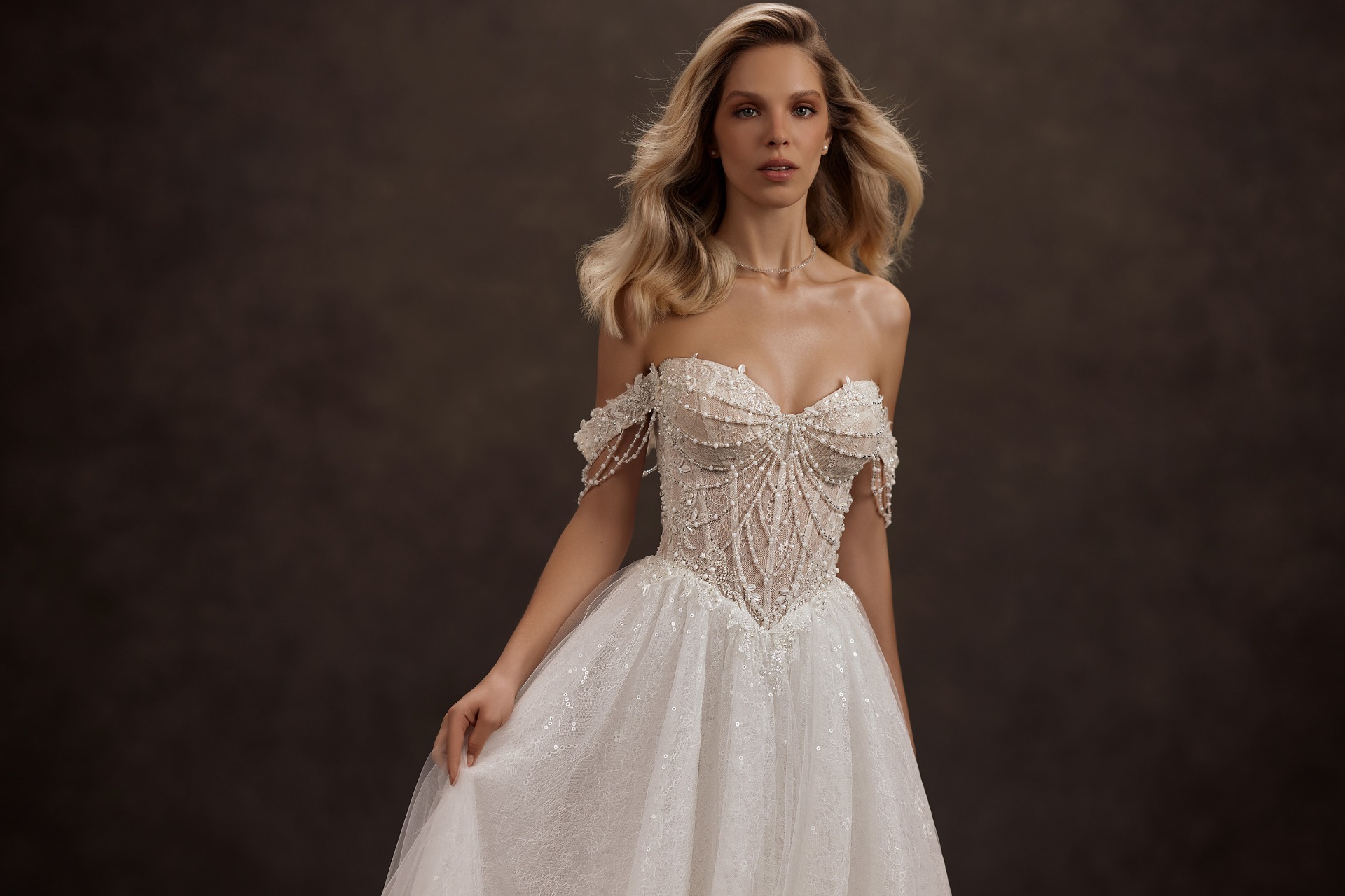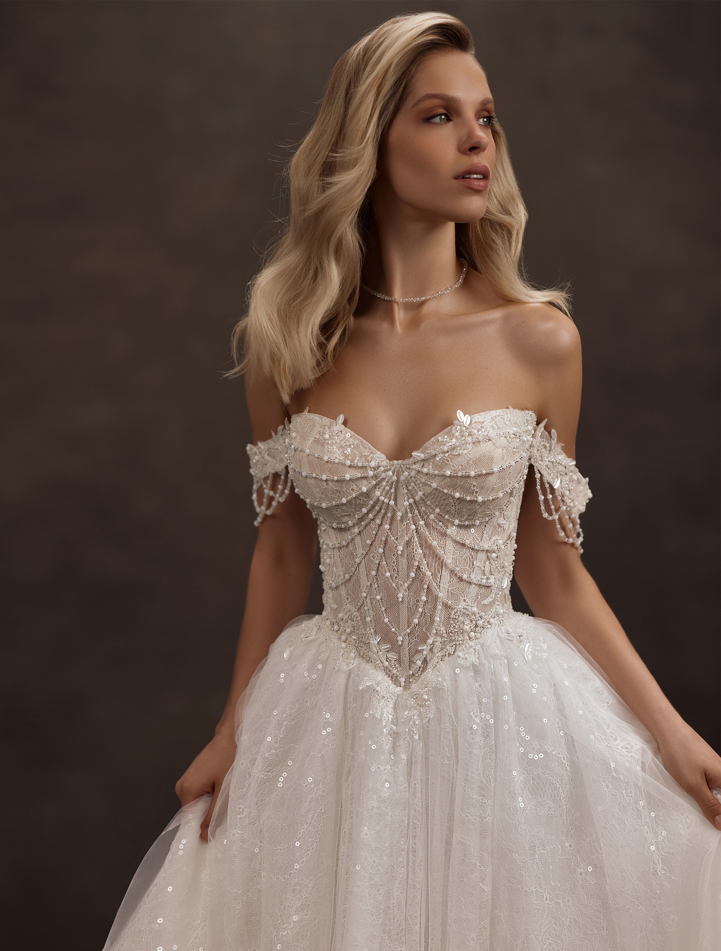 Az Elisabetta menyasszonyi ruha a klasszikus pompa és a modern couture csillogás lenyűgöző ötvözete. A ruha felsőrésze aprólékosan kidolgozott, gyöngyökkel és flitterekkel hímzett fűzős fazon, melyet leomló gyöngyláncok és finom off-shoulder díszítés koronáz meg.