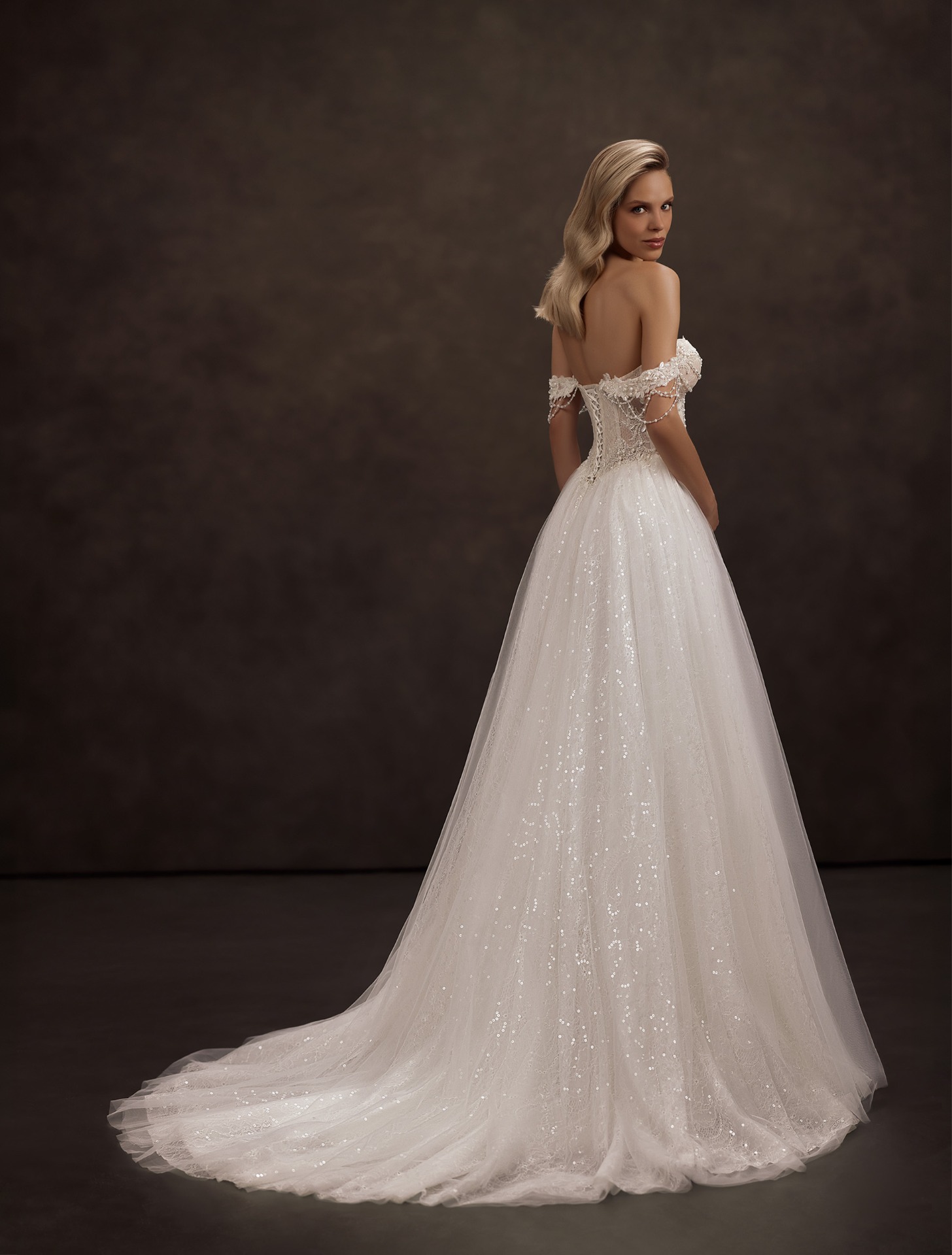 A szív alakú dekoltázs romantikus és nőies, miközben a csillogó tüllszoknya légies könnyedséggel omlik alá, mintha minden lépésnél fénybe burkolná a menyasszonyt. Az Elisabetta a luxus megtestesítője – azoknak a nőknek készült, akik mernek ragyogni, és akik számára az elegancia a részletekben rejlik.