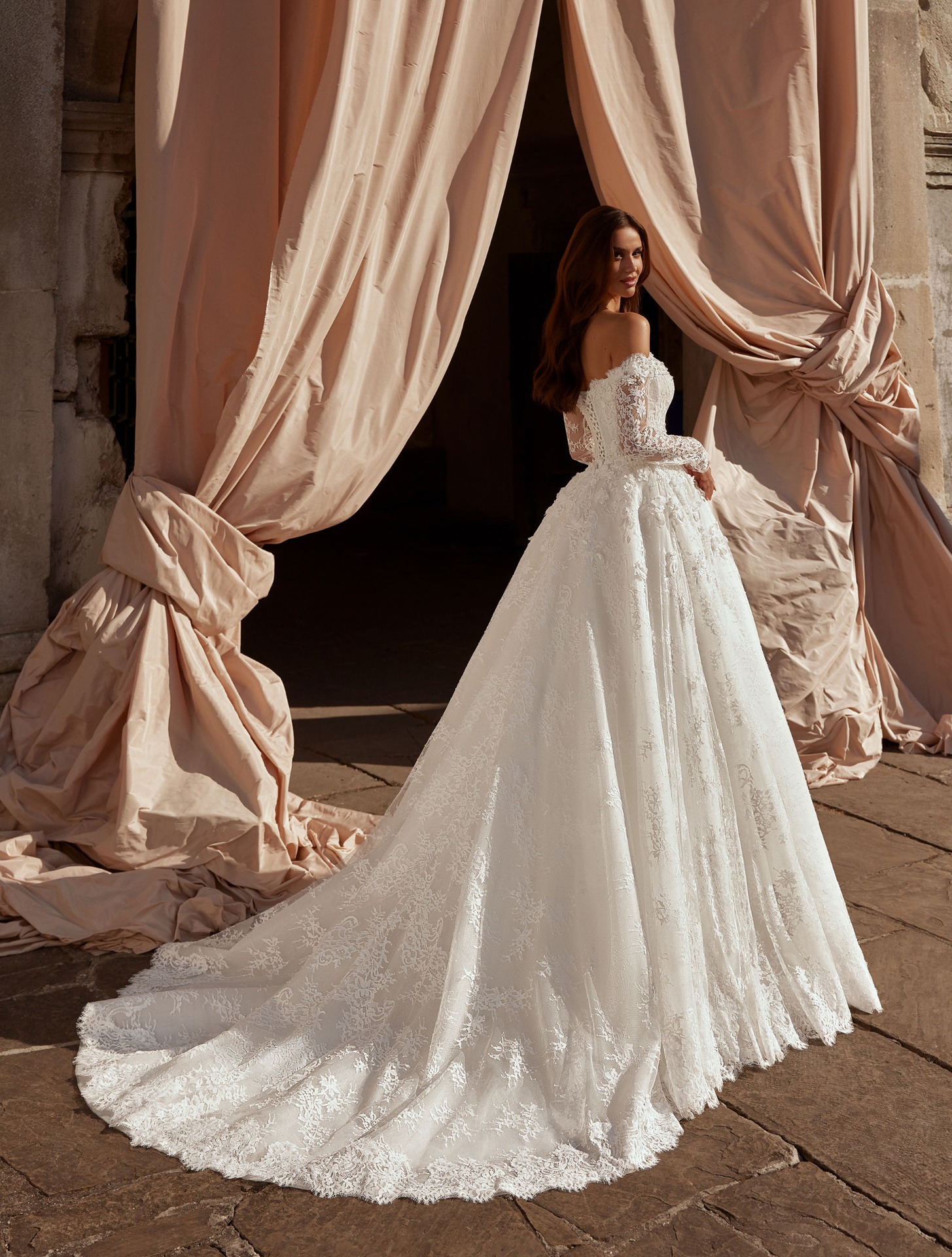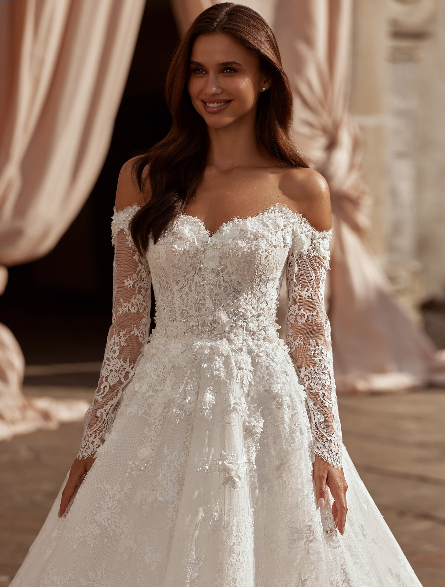 Az Elvira menyasszonyi ruha a klasszikus báj és a kortárs kifinomultság tökéletes egysége. A vállakat szabadon hagyó, finom csipkerátétes felsőrész nőies, mégis visszafogottan érzéki megjelenést biztosít, míg a hosszú ujjú fazon eleganciát és nemes tartást sugároz.