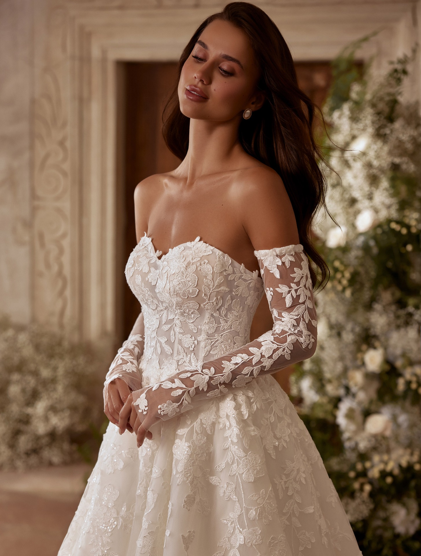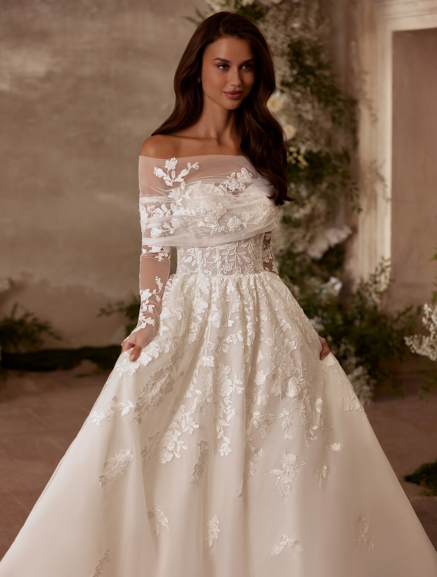 Az Elysia menyasszonyi ruha minden részlete a természetes eleganciát és az álomszerű lágyságot hirdeti. Az áttetsző csipke felsőrész finoman követi a test vonalát, míg a vállról leomló, finom tüllréteg megteremti a lebegő, éteri hatást. A virágmintás hímzések gazdag textúrát adnak a ruhának, miközben megőrzik annak könnyed, tündérmesébe illő jellegét.