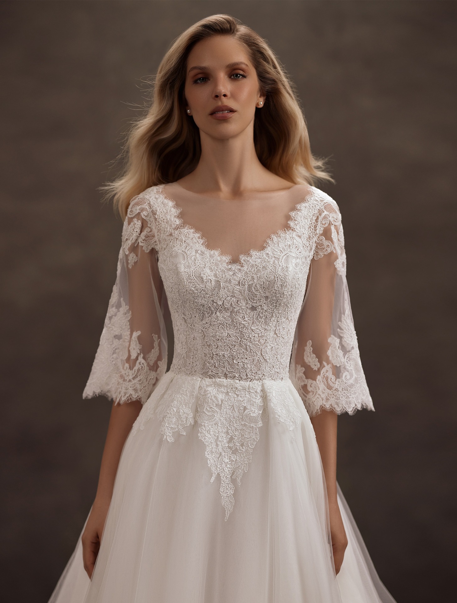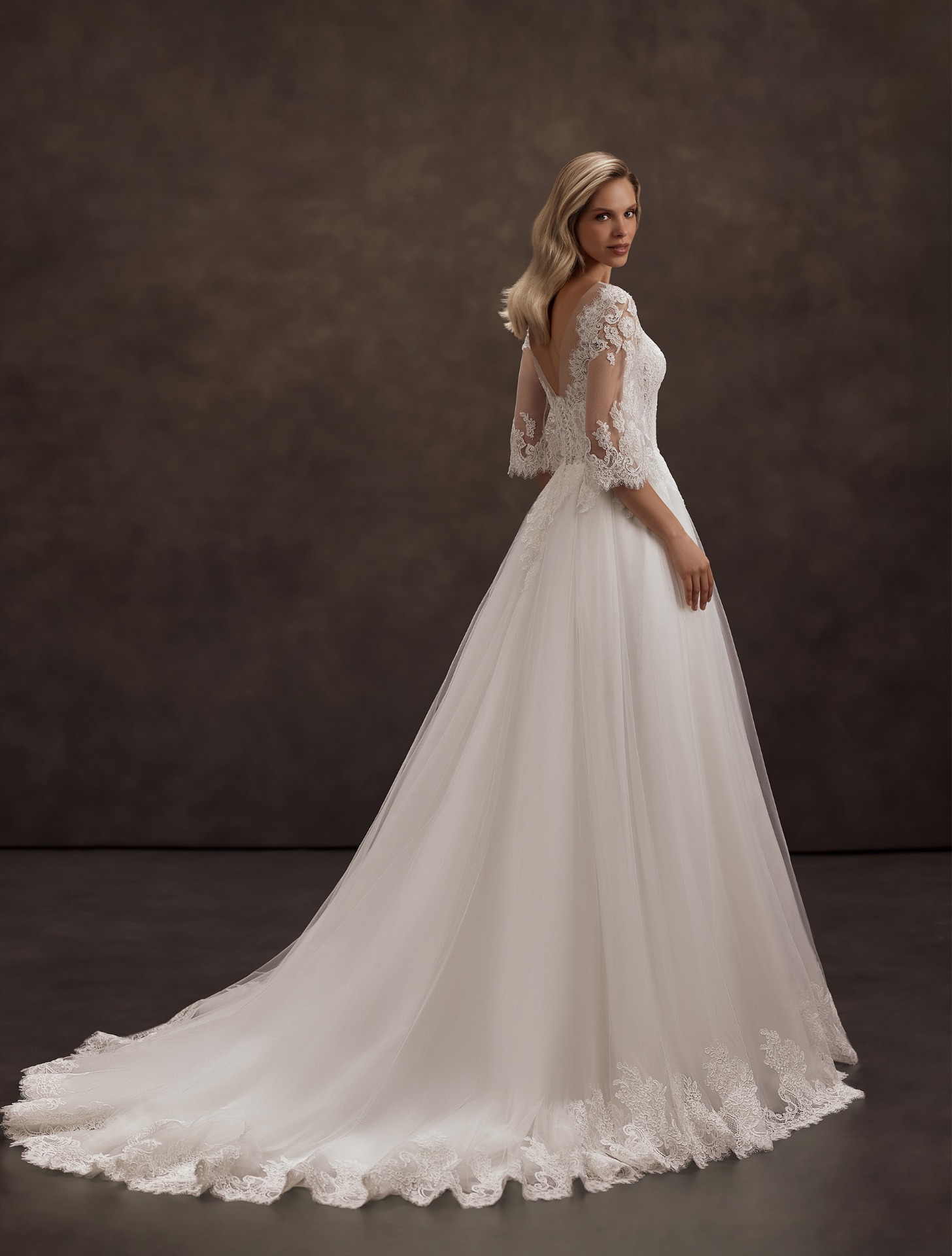 Az Esma menyasszonyi ruha a klasszikus szépség és a finom romantika jegyében született. A félhosszú csipkeujjak és a V-kivágású hátmegoldás a nőiesség legletisztultabb formáját hangsúlyozzák, miközben a csipkével díszített felsőrész és a tüllszoknya könnyed rétegei királynői kisugárzást adnak.