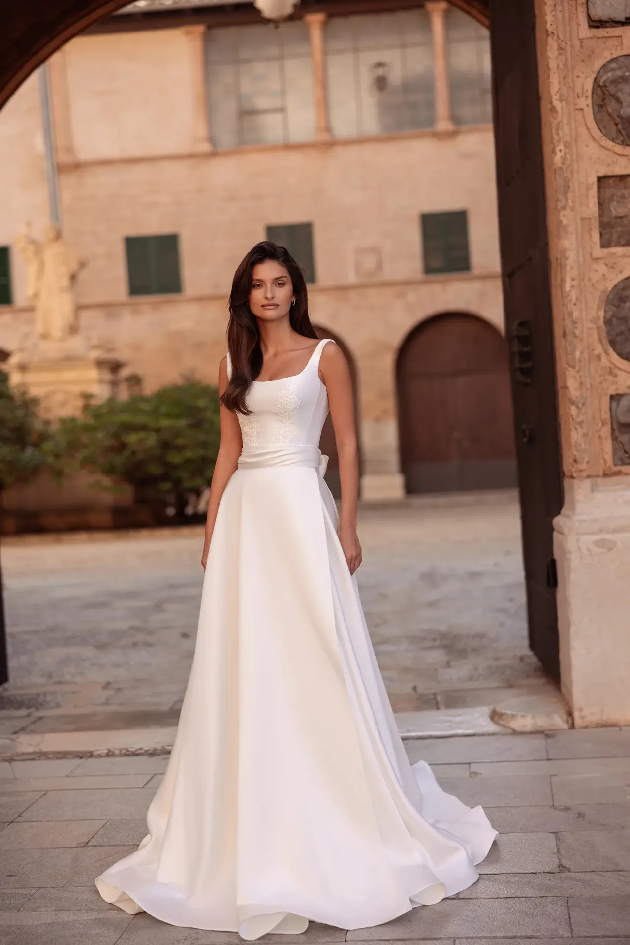 Modern szögletes nyakkivágás: A strukturált mikádó felsőrész tiszta, szögletes nyakvonala (square neckline) és a széles pántok rendkívül divatos, határozott keretet adnak a dekoltázsnak. Ez a megoldás a 2026-os év egyik legnagyobb kedvence.