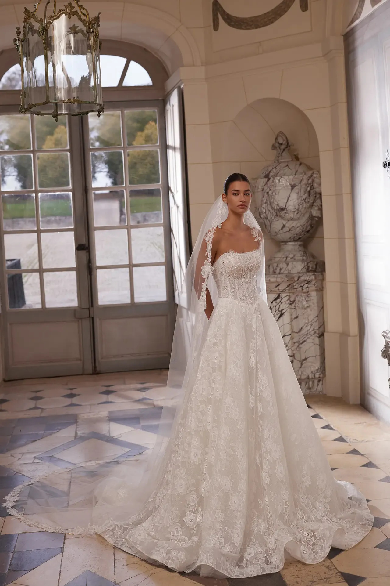 A tökéletes összhang: A szetthez tartozó, stílusban passzoló fátyol teszi teljessé ezt a bűbájos menyasszonyi szettet.