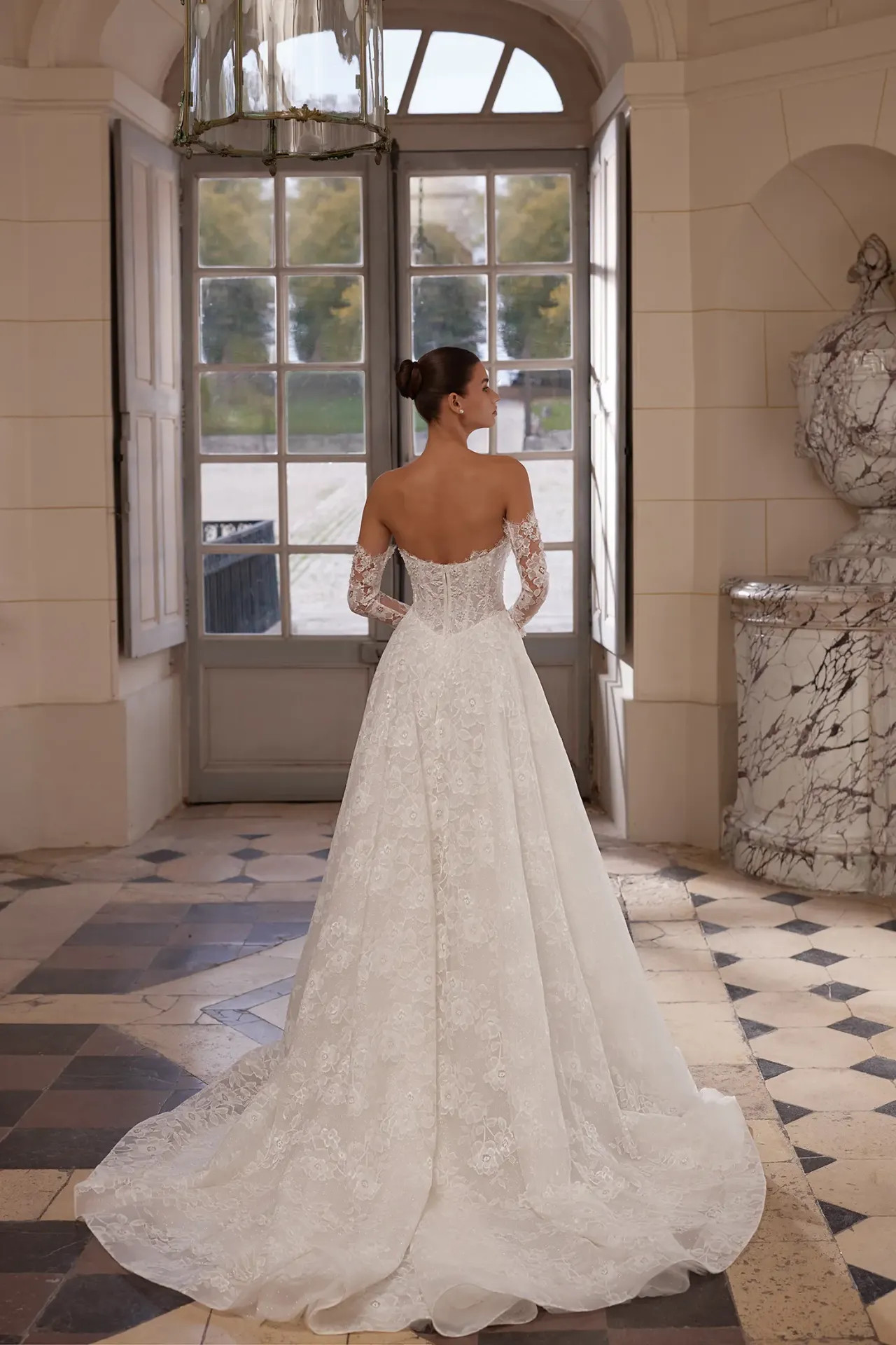 Variálható stílus: Az ejtett vállú, egyenes nyakkivágást lecsatolható, áttetsző csipkeujjak egészítik ki. Ez lehetővé teszi, hogy a szertartáson egy klasszikusabb, hosszú ujjú ruhában tündökölj, a vacsorára pedig egy pánt nélküli, könnyedebb fazonra válts.