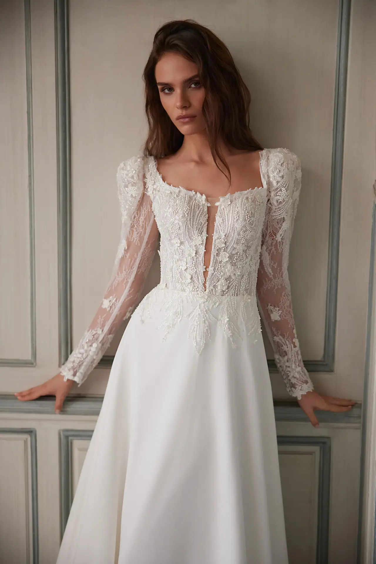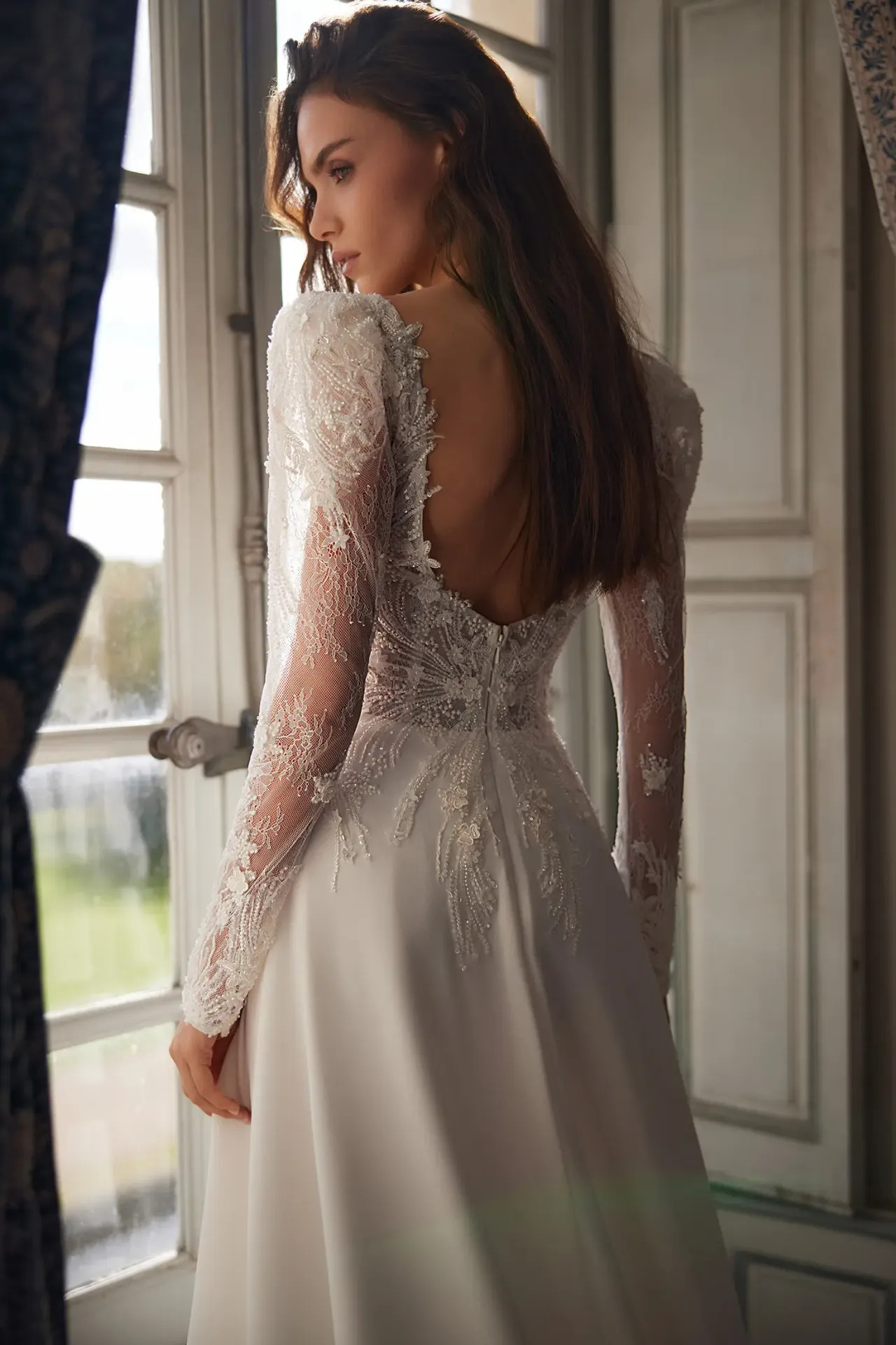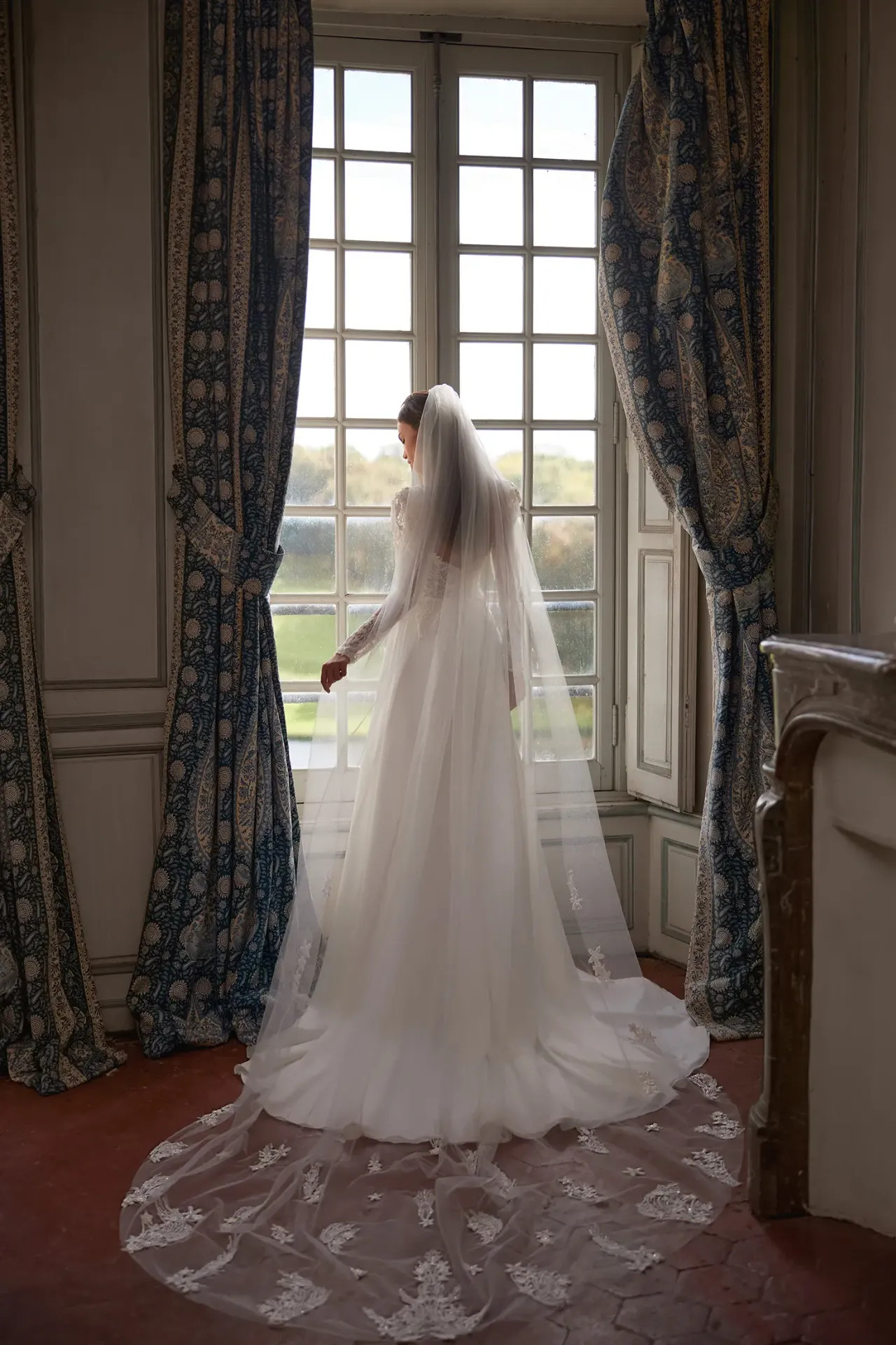 Lágy krep-sifon szoknya: A szoknya nem tüllből, hanem prémium krep-sifonból készült, ami gyönyörűen és nehezebben gyűrődve omlik alá, végül egy fenséges katedrális uszályban végződik.