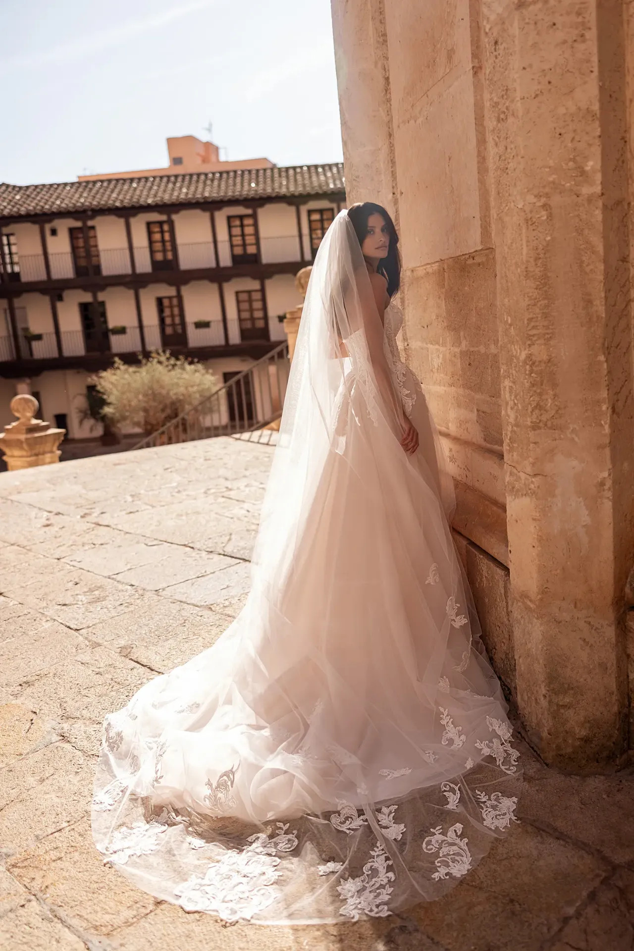 Stylist tipp: A Keidi fátyol egyszerűen káprázatosan mutat egy sellő fazonú menyasszonyi ruha mellett. Míg a sellő fazon kiemeli a vonalaidat, ez a hosszú, finoman díszített fátyol egyfajta lágy, romantikus uszály-hosszabbítást ad a sziluettednek, anélkül, hogy elvonná a figyelmet a ruha kidolgozottságáról.