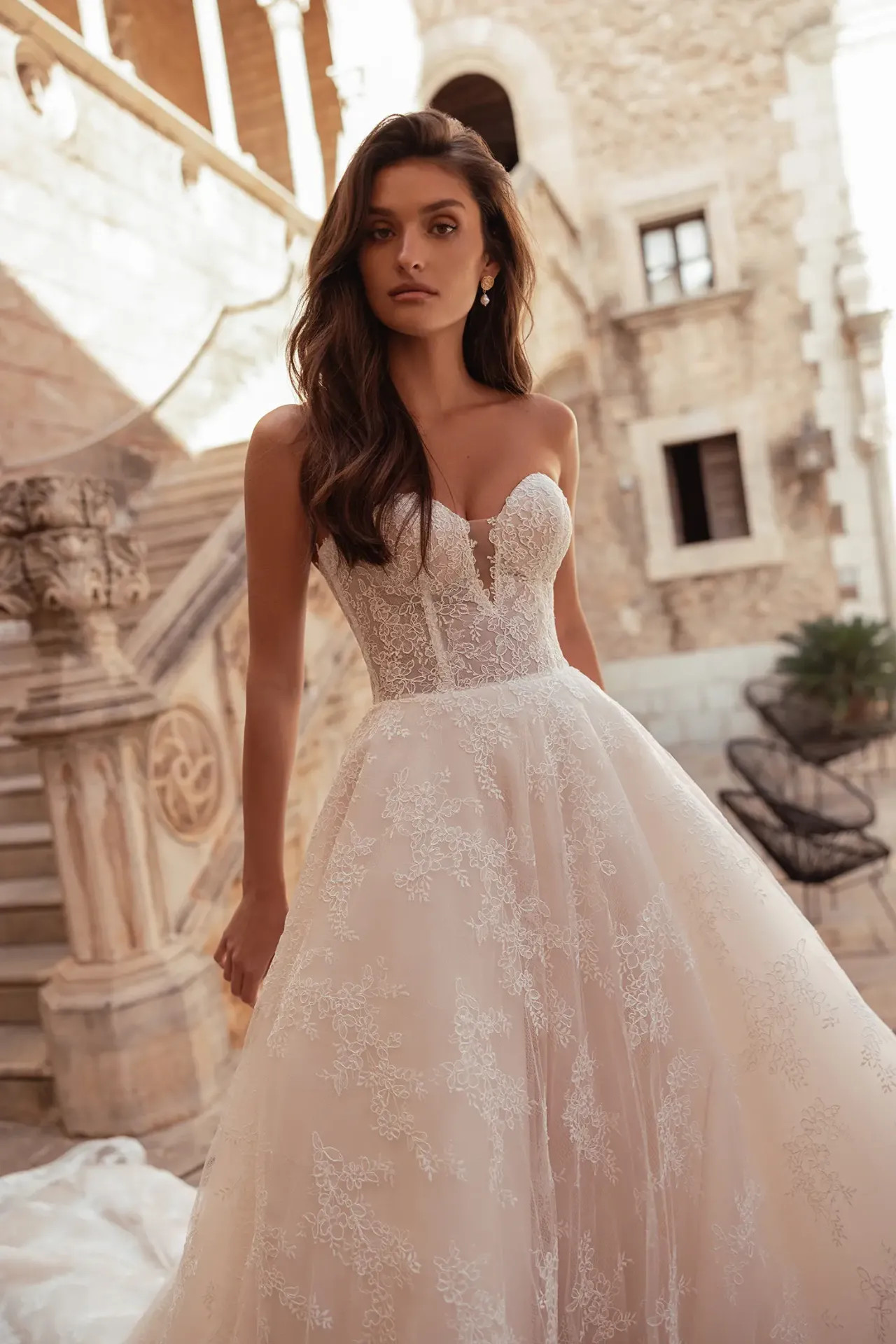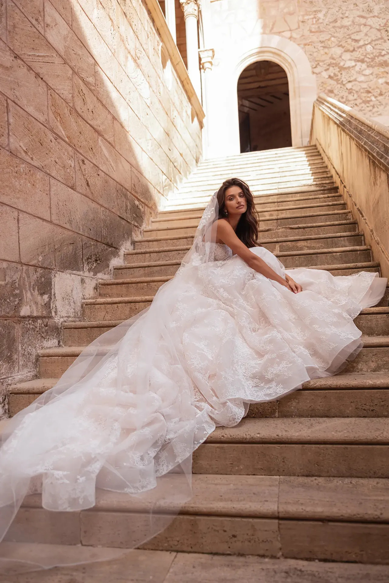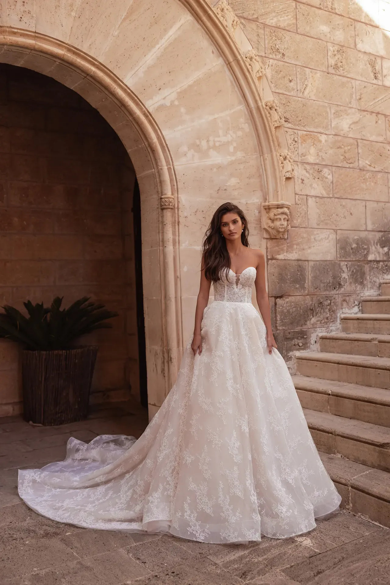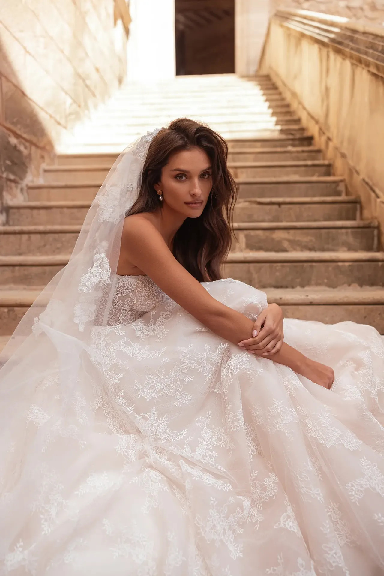 Harmonikus összhatás: A szetthez tartozó, stílusban megegyező fátyol teszi teljessé ezt a kifinomult, modern-romantikus sziluettet.