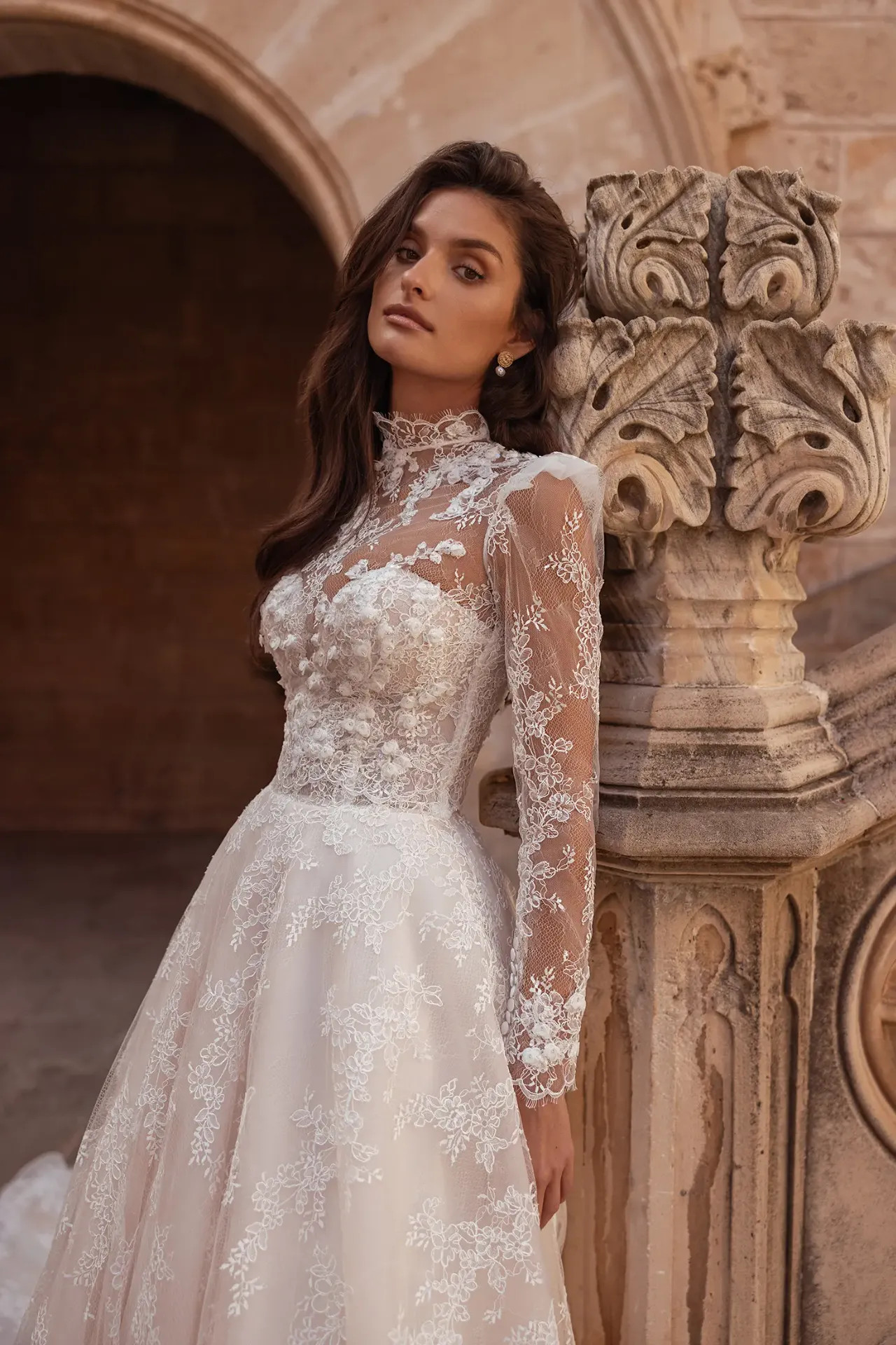 Lecsatolható Alençon csipke boleró: A ruha leglátványosabb eleme a hosszú ujjú, magasított nyakú boleró. A nemes Alençon csipkét térbeli (3D) virágapplikációk díszítik, amelyek mélységet és textúrát adnak a felsőrésznek.