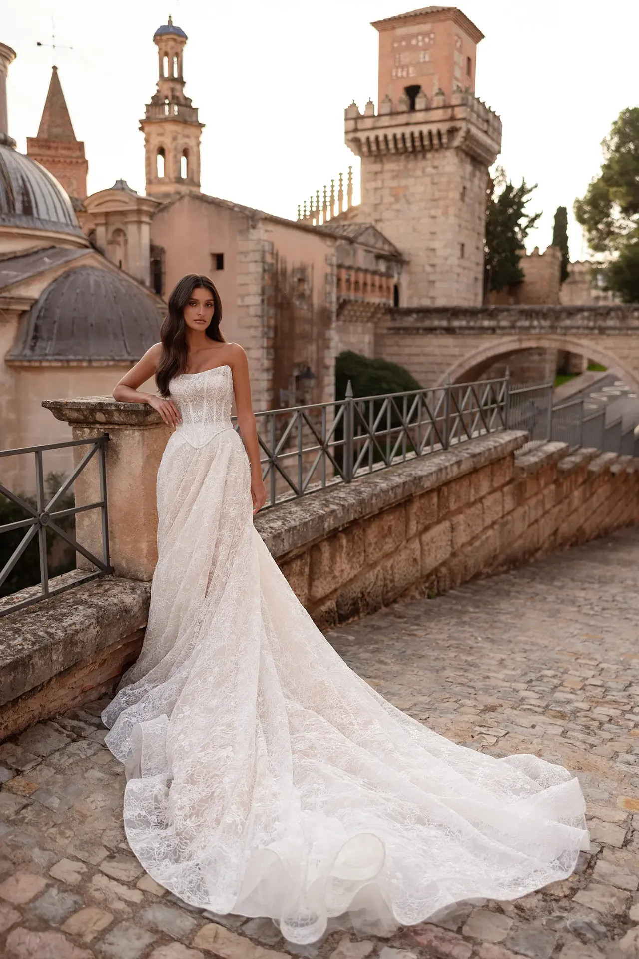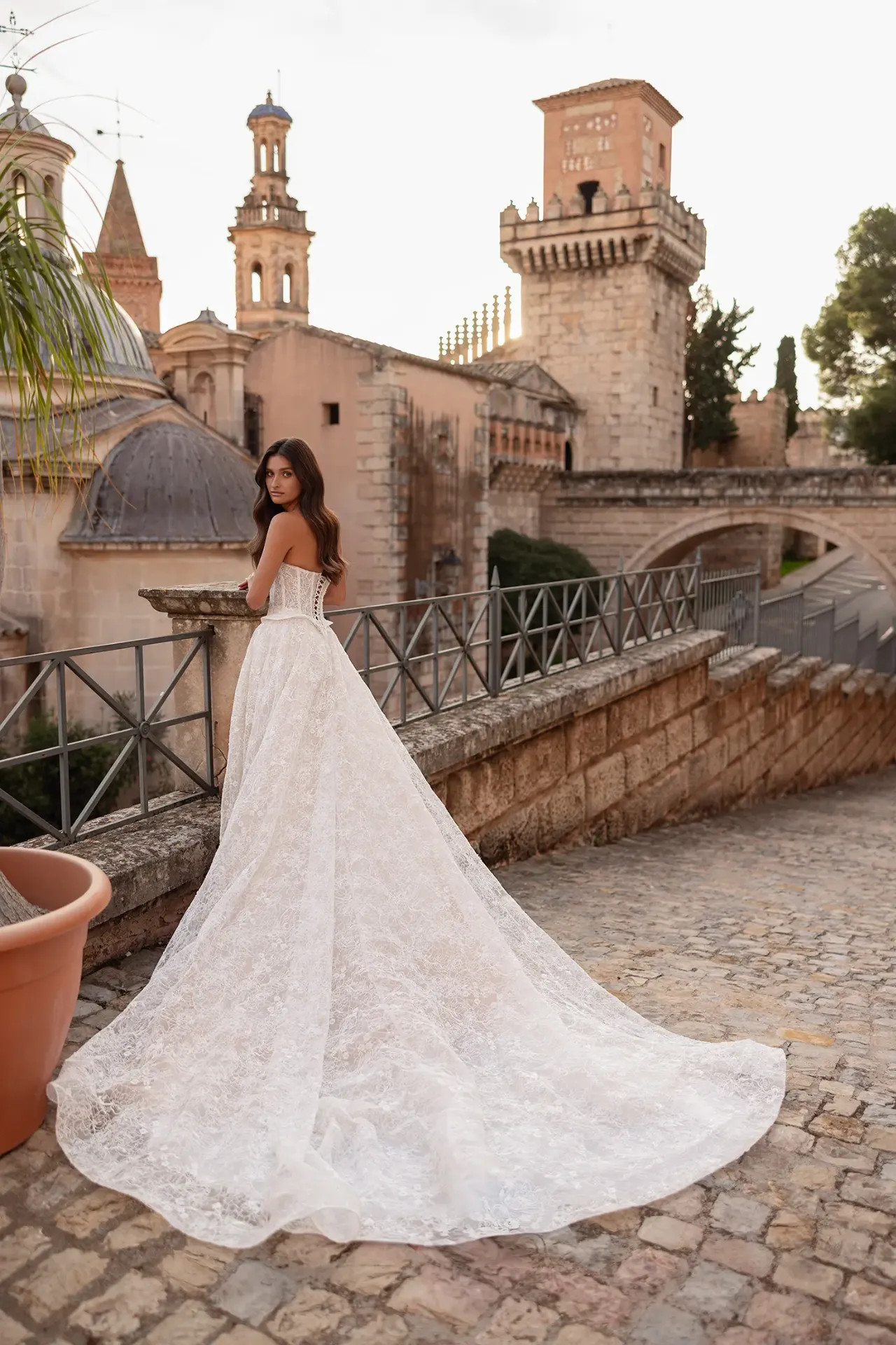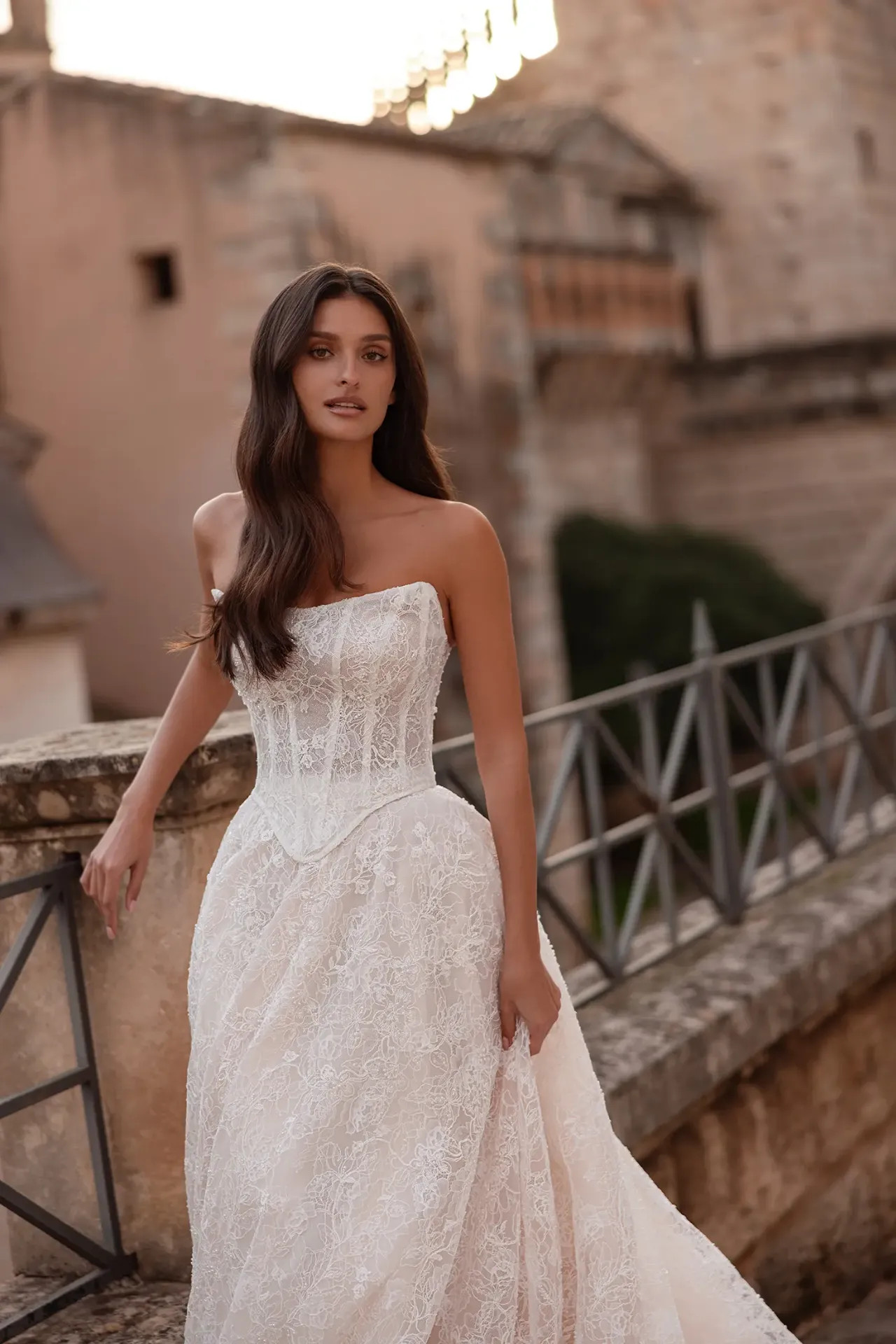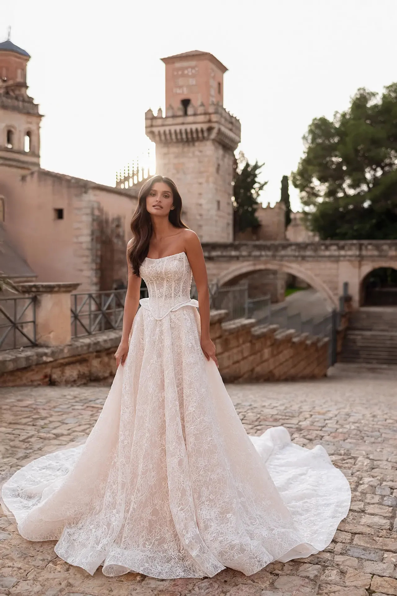 Gazdagon gyöngyözött Alençon csipke: A ruha teljes felületét a legnemesebb Alençon csipke borítja, amelyet aprólékos gyöngyözés tesz texturálttá. Ez a megoldás nemes ragyogást és mélységet ad a ruhának, amely minden fényviszonyban más arcát mutatja.
