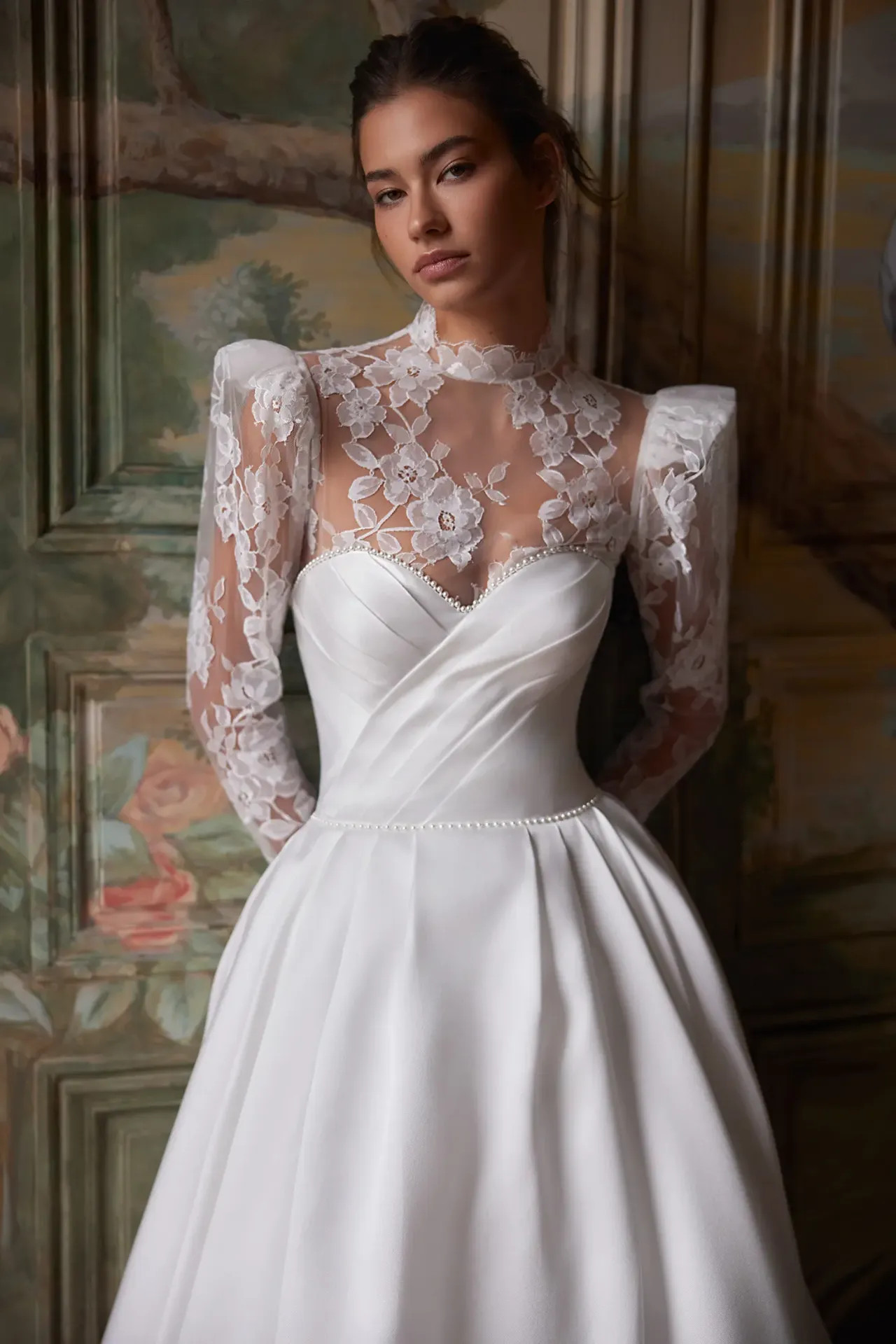 Stylist tipp: A mikádó selyem az egyik legelegánsabb választás, mert fantasztikus a tartása és gyönyörű a fénye. A Holdfény Szalonban azért is szeretjük a Meliát, mert a boleróval tökéletesen variálható a stílusa az esküvő menetétől függően.