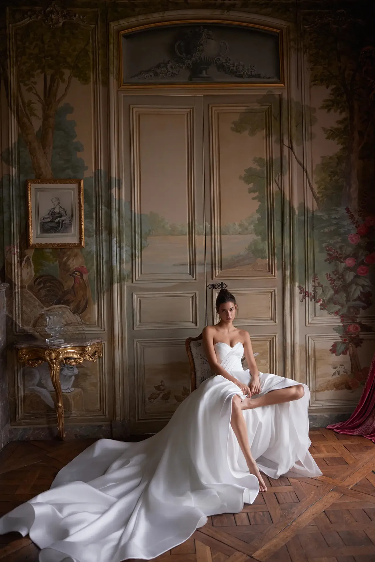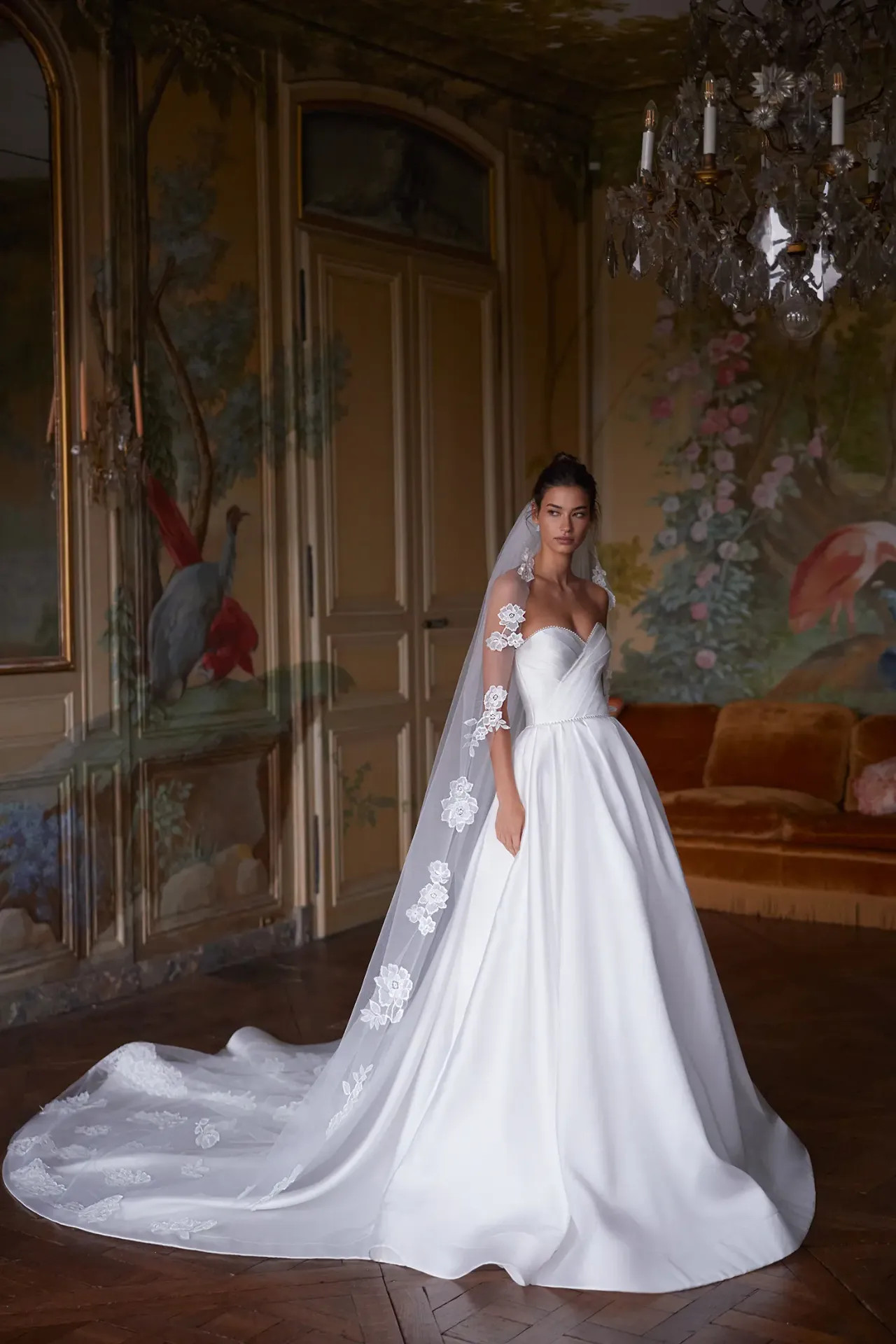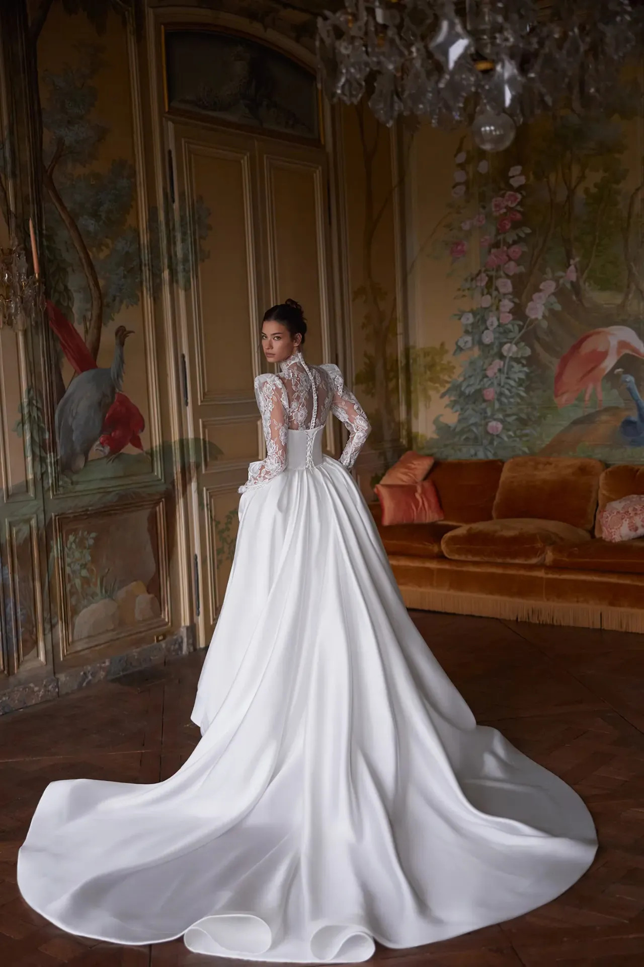 Drámai uszály: A dús esésű szoknya egy hatalmas katedrális uszályban végződik, ami lélegzetelállító látványt nyújt, ahogy az oltárhoz vonulsz.