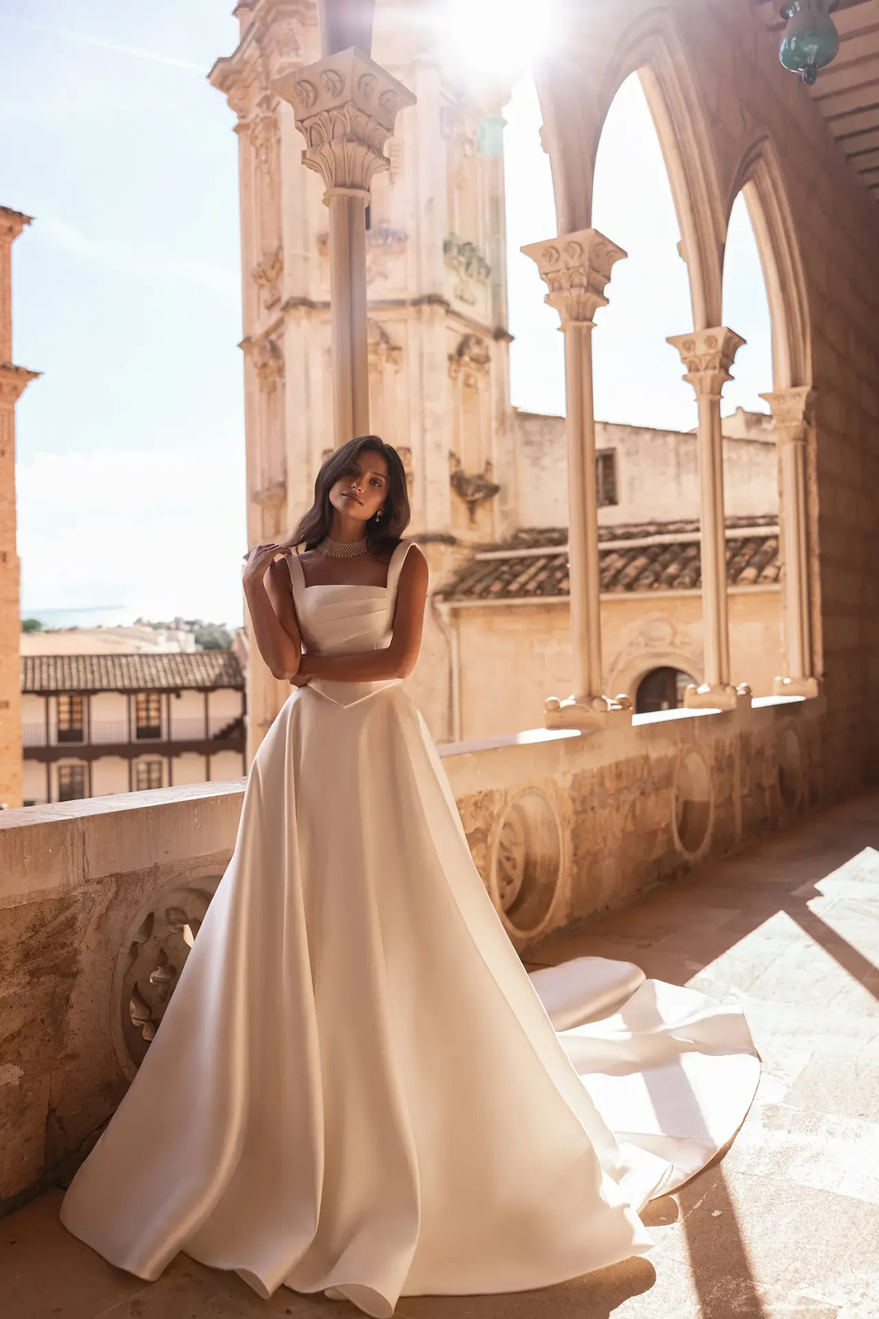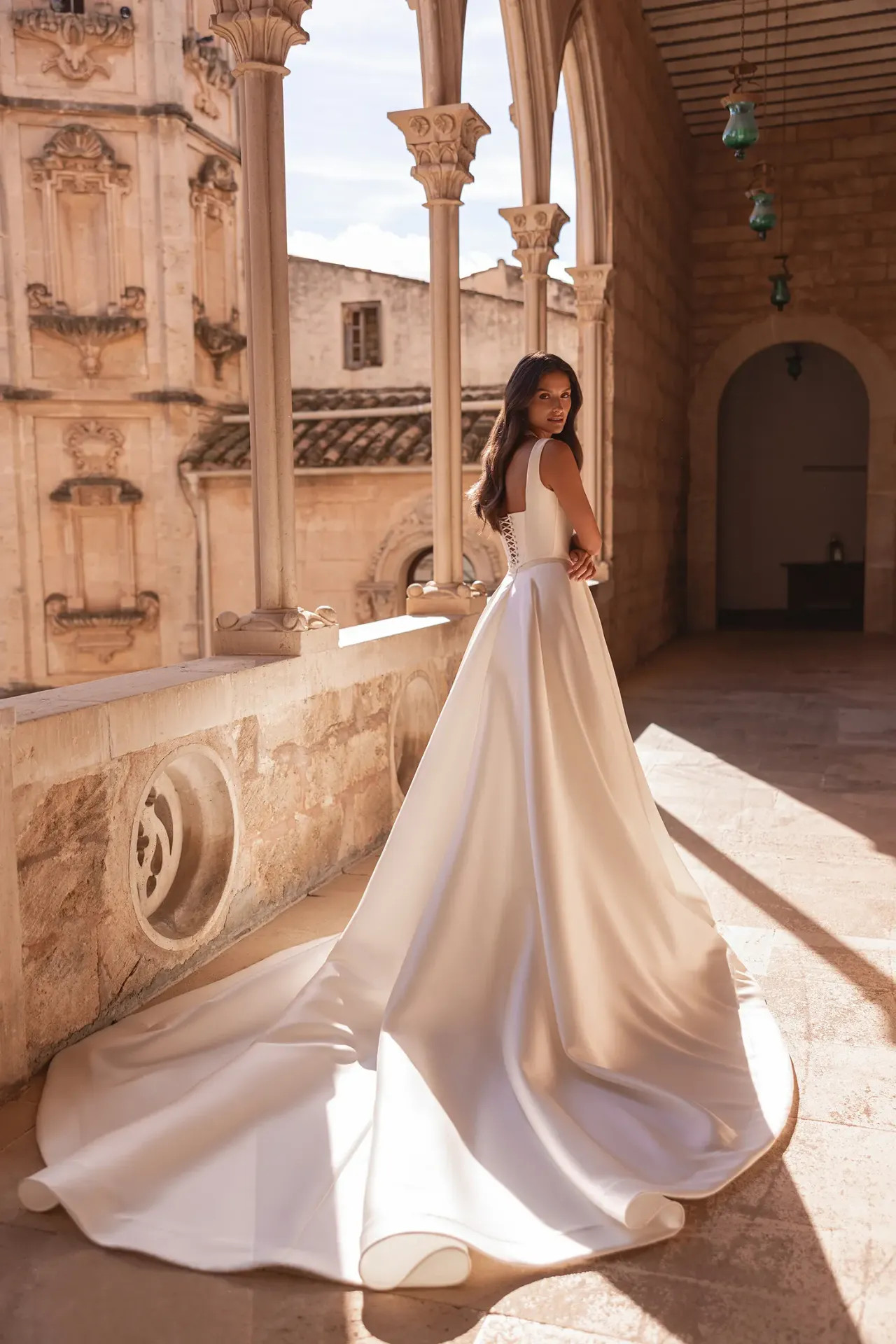 A Melrose ruha a bizonyíték arra, hogy a kevesebb néha valóban több. Ez a modell azoknak a menyasszonyoknak készült, akik értékelik a tökéletes szabászatot (tailoring), a nemes anyagok tartását és a modern, formabontó megoldásokat. A kétrészes kialakítás egyfajta friss, „high-fashion” élt ad a megjelenésnek, miközben hű marad az esküvői hagyományokhoz.