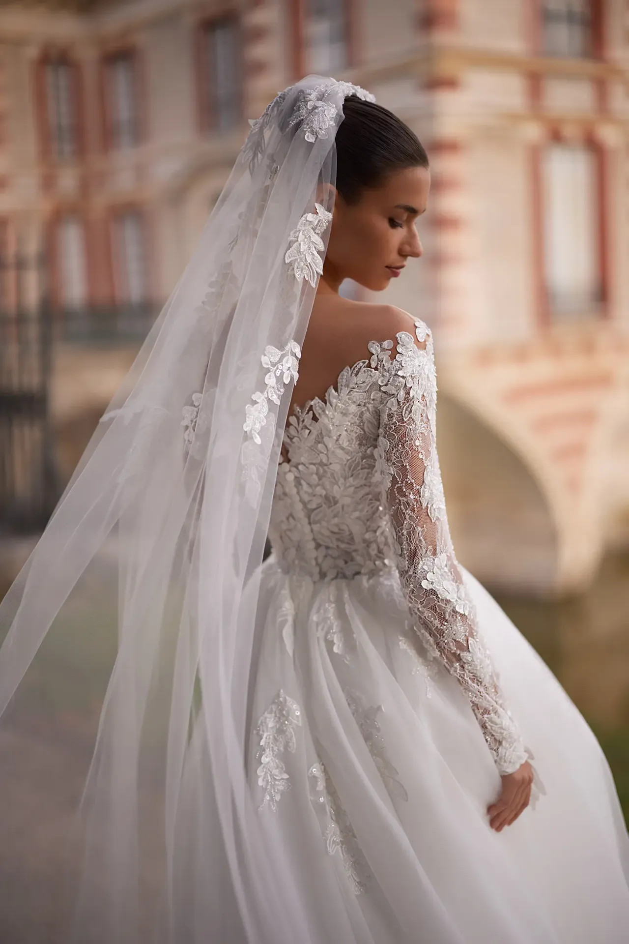 Kifinomult csipkemunka: A felsőrész alapját a patinás Chantilly csipke adja, amit egy lágy, áttetsző (illusion) nyakvonal és hosszú csipkeujjak tesznek teljessé. Ez a megoldás gyönyörűen hangsúlyozza a vállakat és a dekoltázst.
