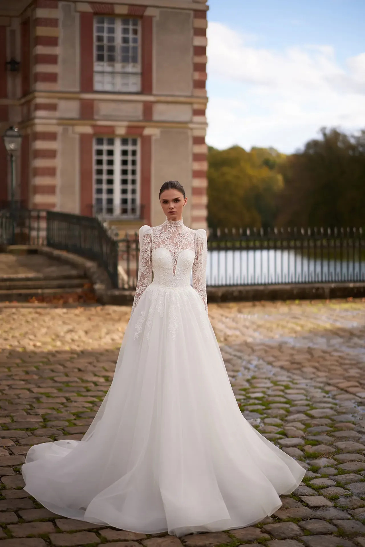 Klasszikus felsőrész: A szív alakú, merevített fűző felett egy gyönyörű Alençon csipke réteg található. A magasított nyakvonal és a hosszú, áttetsző ujjak olyan méltóságteljes megjelenést adnak, ami a legszebb hagyományokat idézi.