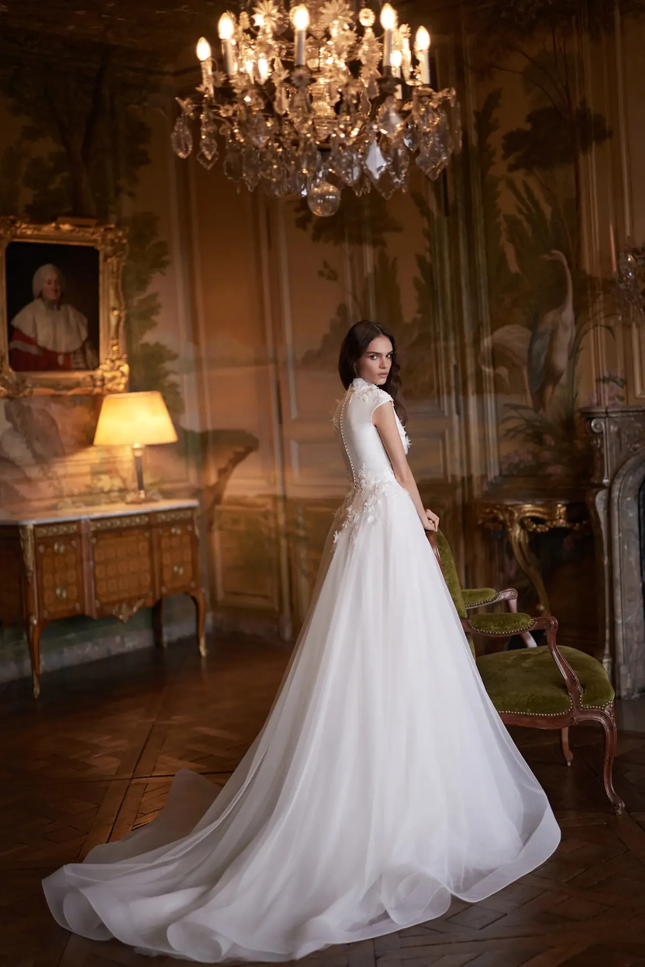 Arisztokratikus felsőrész: A ruha zártabb, magasított nyakvonala (high neckline) és a lágy, apró ujjak (cap sleeves) méltóságteljes és elegáns keretet adnak a felsőtestnek.
