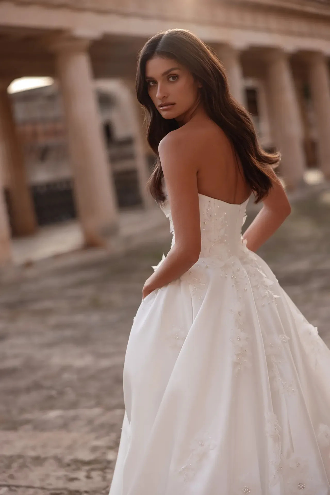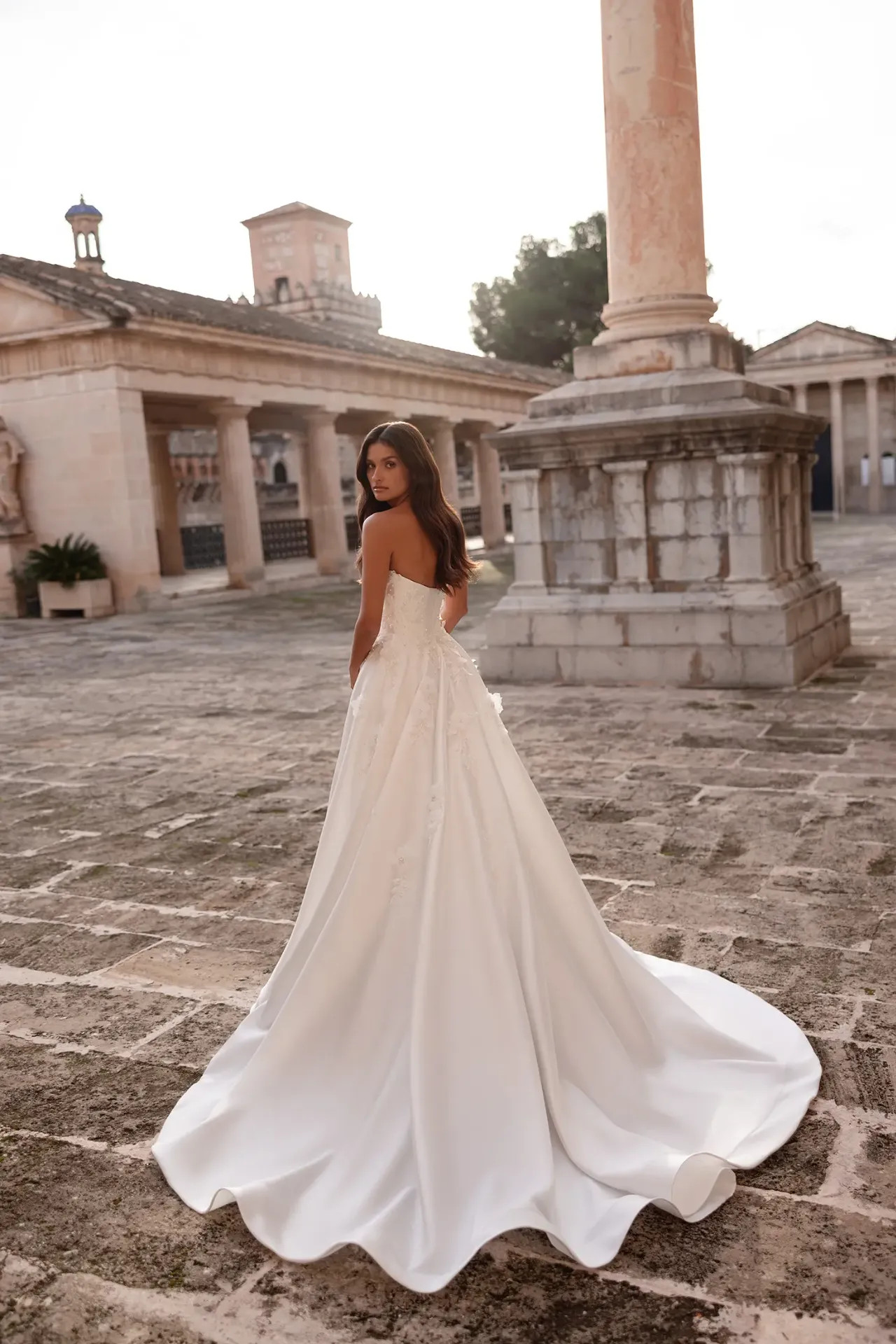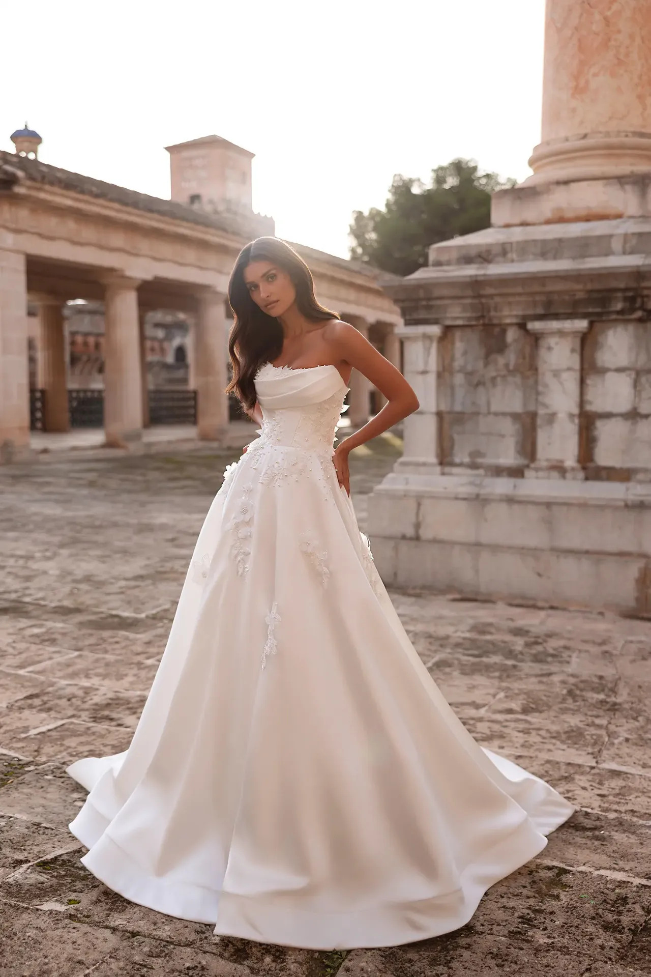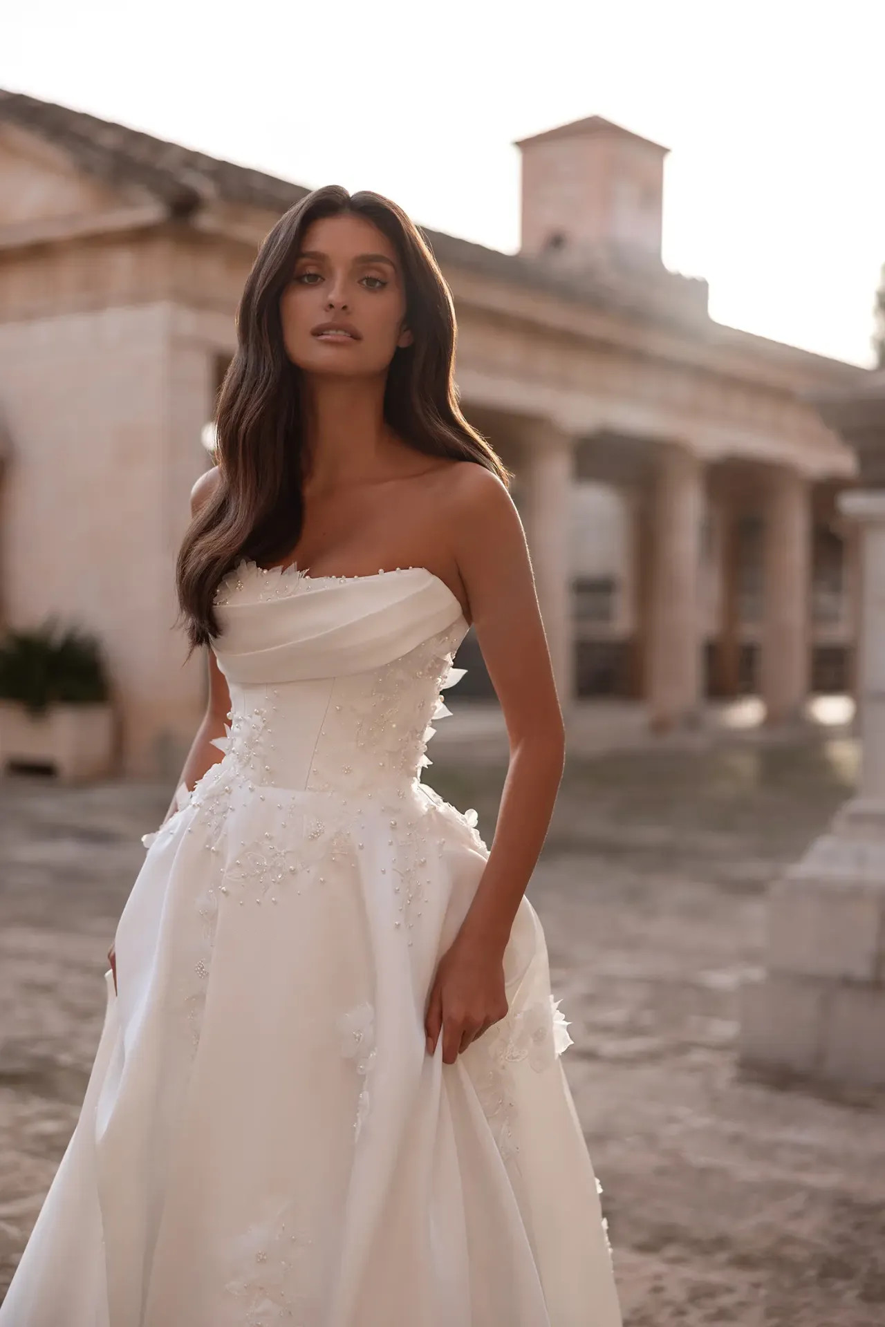 Stylist tipp: A Petra a tökéletes választás, ha szereted a letisztult formákat, de nem akarsz lemondani a "hercegnős" érzésről sem. A Holdfény Szalonban azért rajongunk érte, mert a drapírozott dekoltázs és a gyöngyözés párosa rendkívül nemes hatást kelt. Ha az alakformálás a cél, a pánt nélküli fűző és a dús szoknya kontrasztja csodásan hangsúlyozza a derekat!