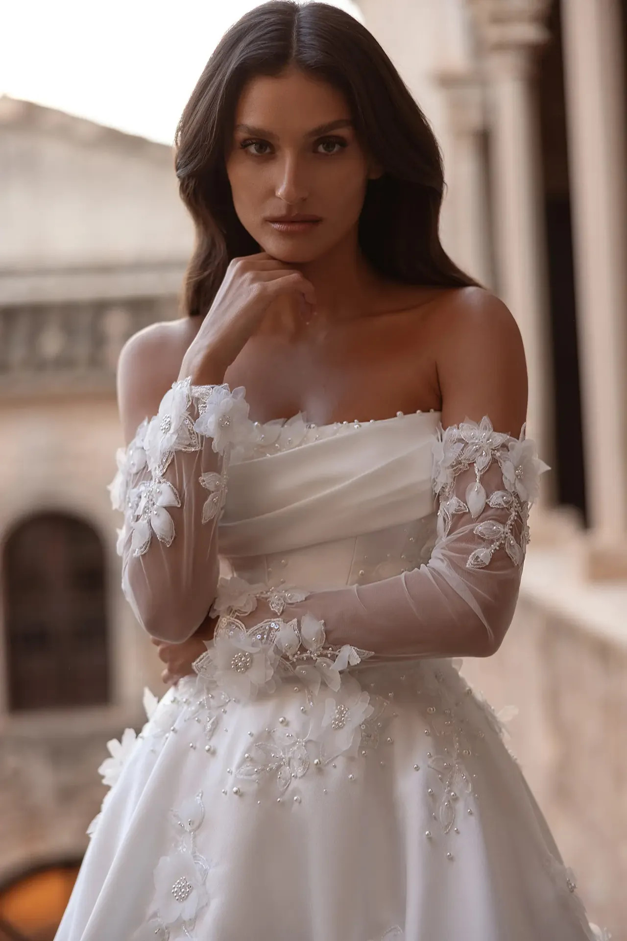 Ethereal levehető ujjak: A ruhához lecsatolható, áttetsző hosszú ujjak tartoznak, amelyek egy pillanat alatt éterivé és emelkedetté teszik a stílust. Tökéletes megoldás, ha a szertartáshoz egy kicsit "zártabb", a bulihoz pedig egy felszabadultabb, pánt nélküli fazont keresel.