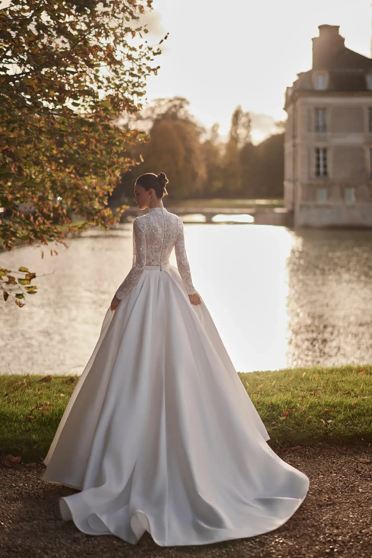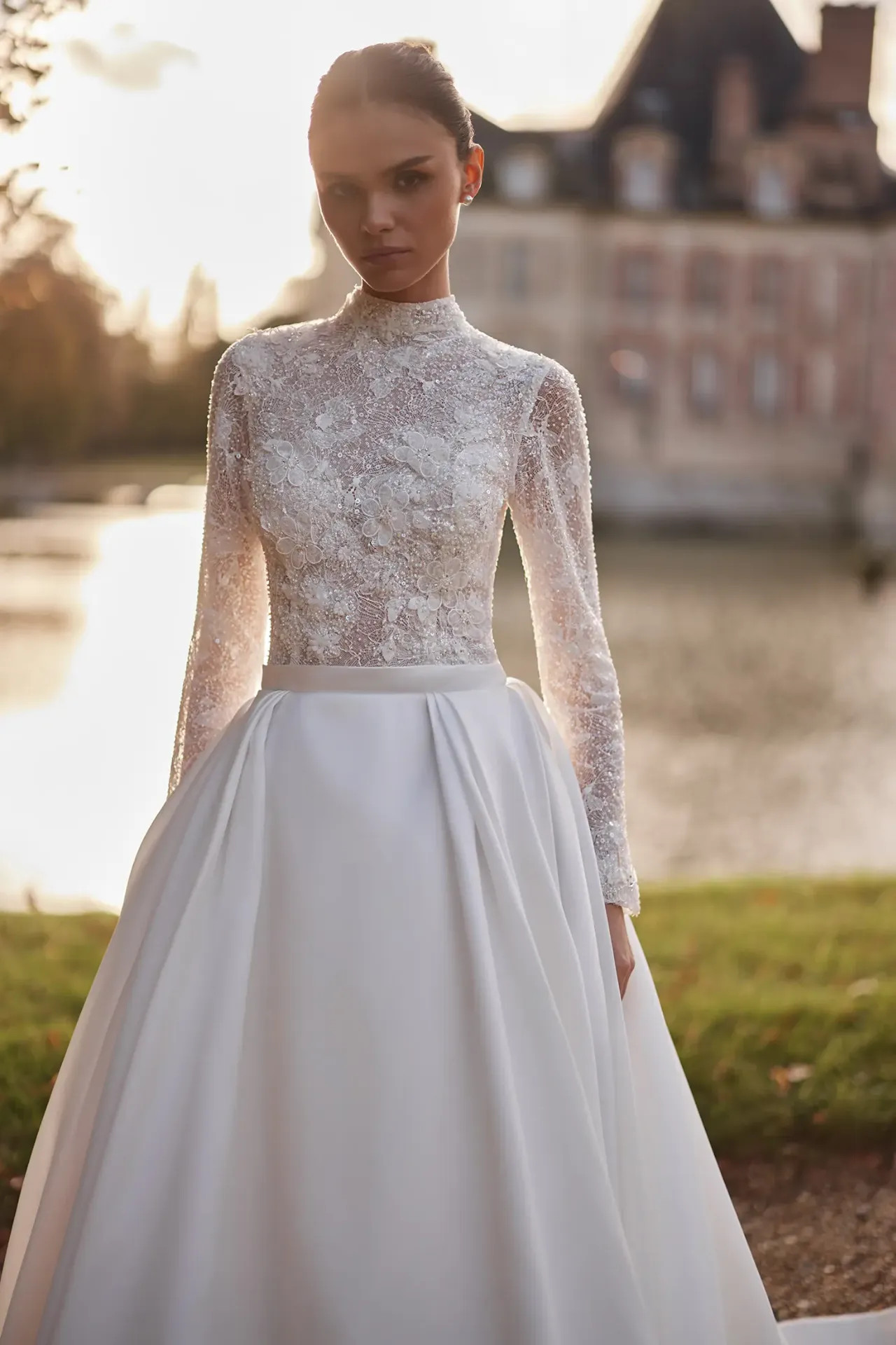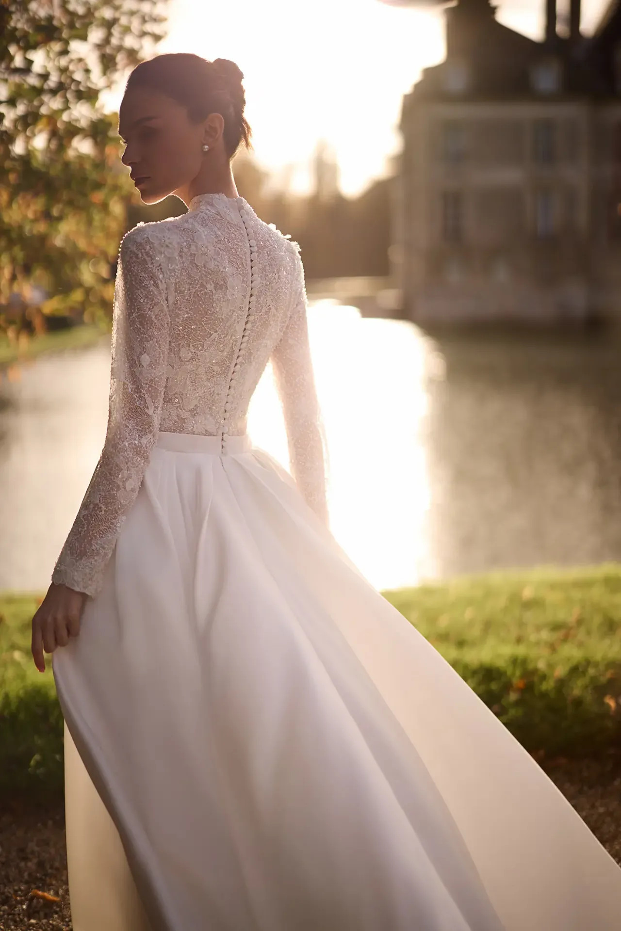 Arisztokratikus nyakvonal: A magasított nyakrész (high neckline) különleges tartást és klasszikus méltóságot ad a viselőjének, miközben gyönyörűen keretezi az arcot.